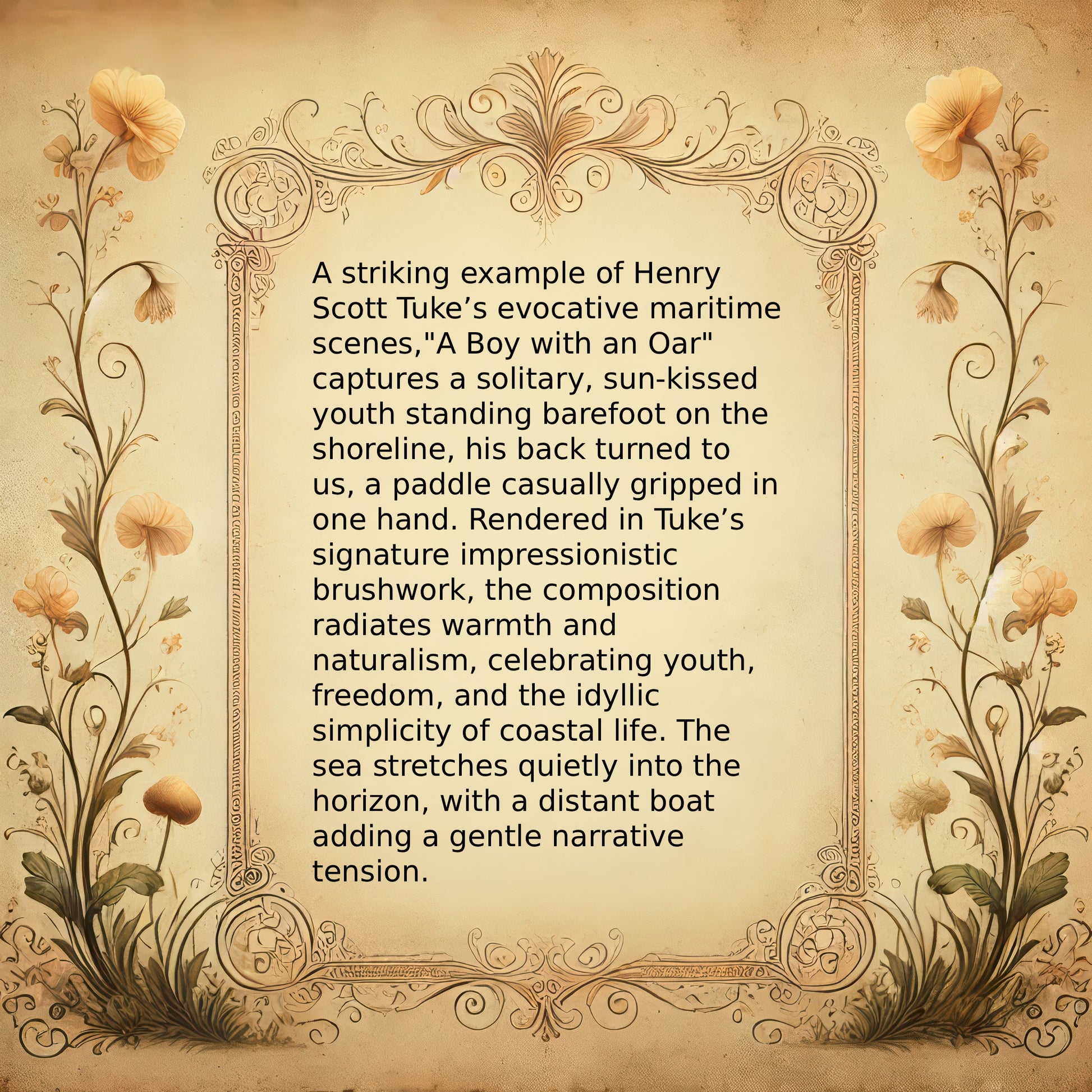 A striking example of Henry Scott Tuke’s evocative maritime scenes, "A Boy with an Oar" captures a solitary, sun-kissed youth standing barefoot on the shoreline, his back turned to us, a paddle casually gripped in one hand. Rendered in Tuke’s signature impressionistic brushwork, the composition radiates warmth and naturalism, celebrating youth, freedom, and the idyllic simplicity of coastal life. The sea stretches quietly into the horizon, with a distant boat adding a gentle narrative tension.