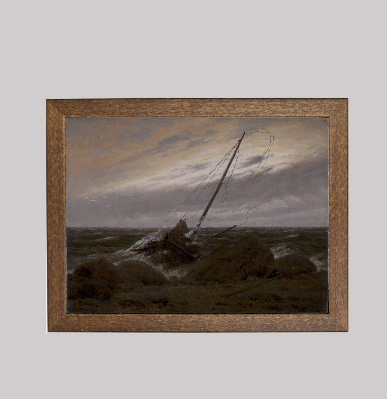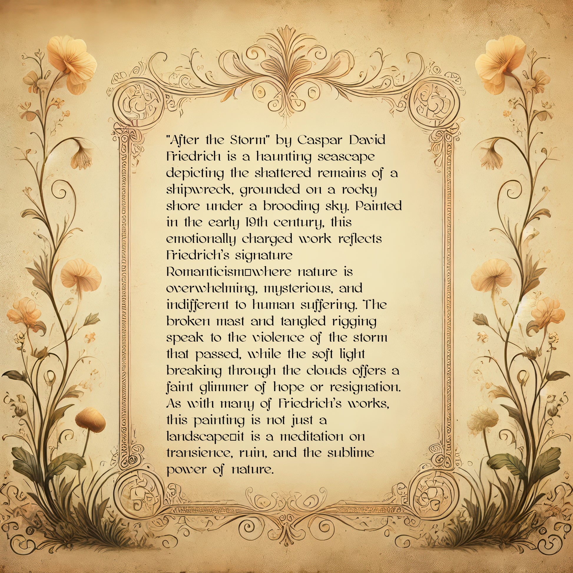 "After the Storm" by Caspar David Friedrich is a haunting seascape depicting the shattered remains of a shipwreck, grounded on a rocky shore under a brooding sky. Painted in the early 19th century, this emotionally charged work reflects Friedrich’s signature Romanticism—where nature is overwhelming, mysterious, and indifferent to human suffering. The broken mast and tangled rigging speak to the violence of the storm that passed, while the soft light breaking through the clouds offers a faint glimmer of hope or resignation. As with many of Friedrich’s works, this painting is not just a landscape—it is a meditation on transience, ruin, and the sublime power of nature.