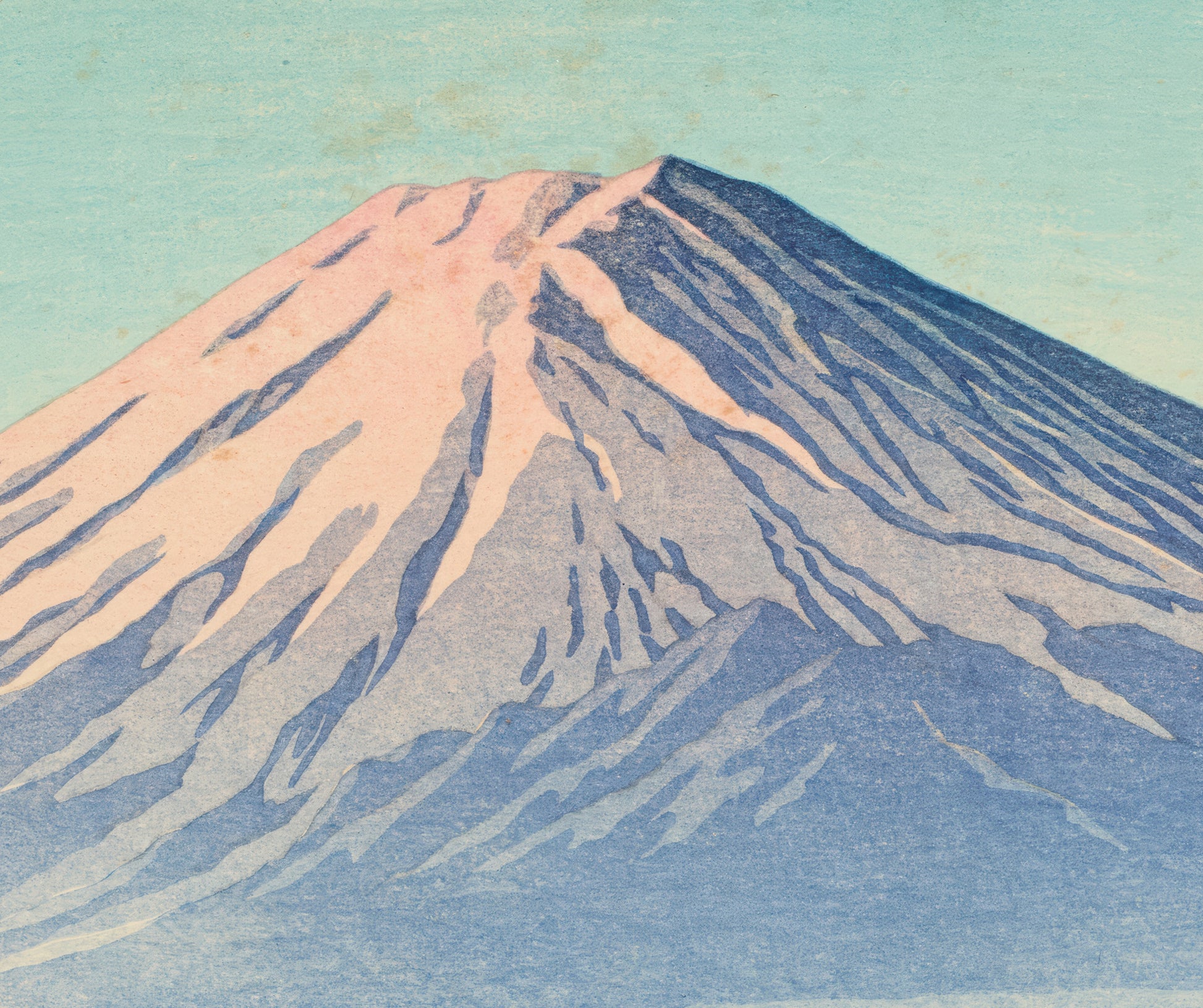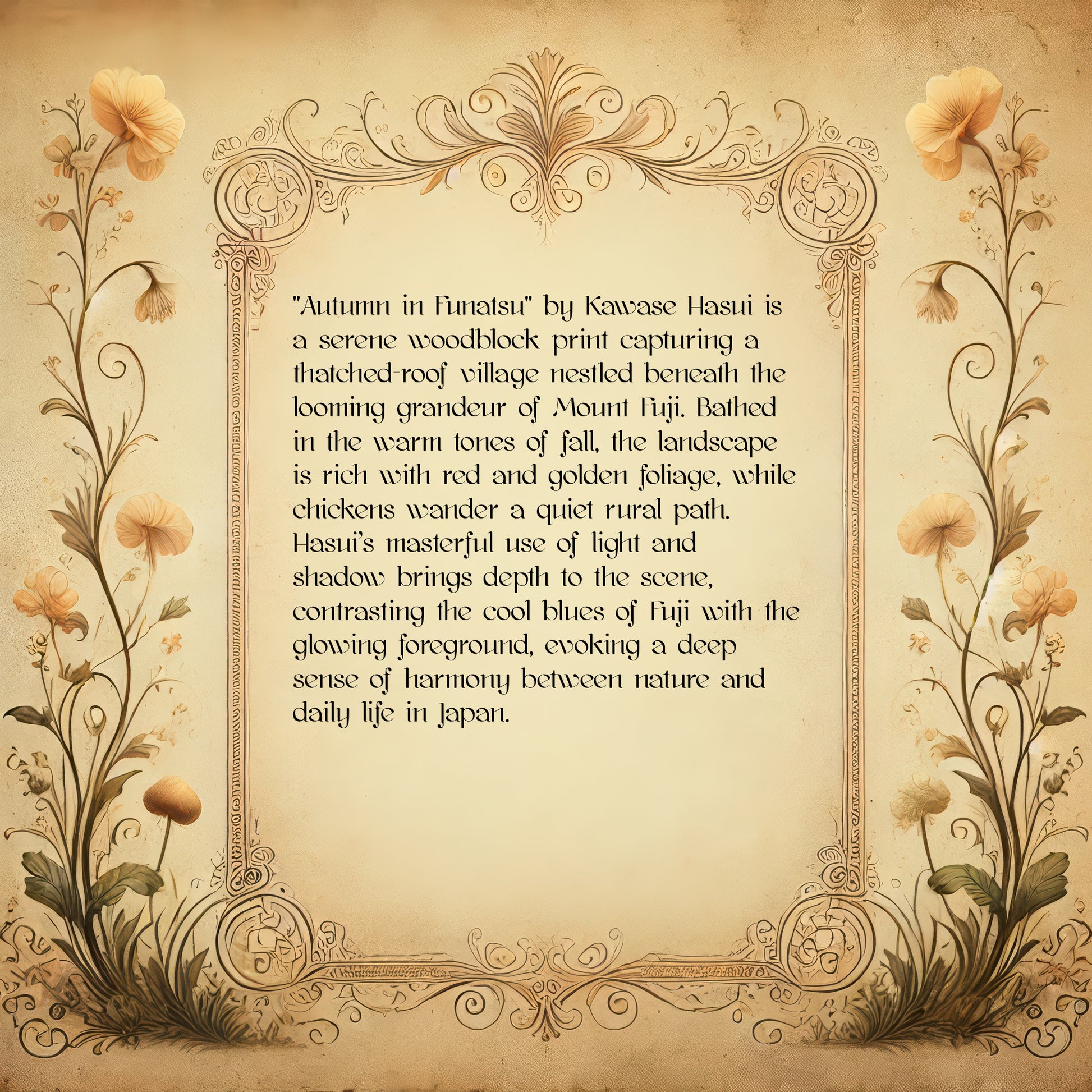 "Autumn in Funatsu" by Kawase Hasui is a serene woodblock print capturing a thatched-roof village nestled beneath the looming grandeur of Mount Fuji. Bathed in the warm tones of fall, the landscape is rich with red and golden foliage, while chickens wander a quiet rural path. Hasui’s masterful use of light and shadow brings depth to the scene, contrasting the cool blues of Fuji with the glowing foreground, evoking a deep sense of harmony between nature and daily life in Japan.