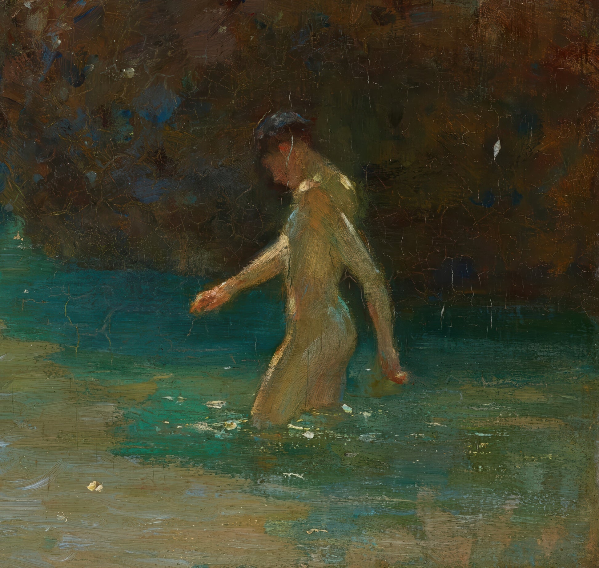In this luminous seascape by Henry Scott Tuke, two young male figures are seen bathing in a narrow inlet between rugged coastal rocks. One boy swims toward the open sea, while another stands partially immersed, lit by soft, golden sunlight. The vibrant brushwork captures the shimmering water and the vitality of youth, a recurring theme in Tuke’s oeuvre. The painting radiates serenity and freedom, evoking a timeless summer moment along the Cornish coast, where Tuke often painted.