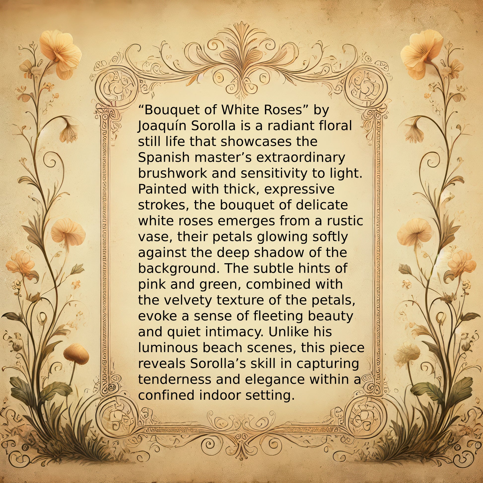 “Bouquet of White Roses” by Joaquín Sorolla is a radiant floral still life that showcases the Spanish master’s extraordinary brushwork and sensitivity to light. Painted with thick, expressive strokes, the bouquet of delicate white roses emerges from a rustic vase, their petals glowing softly against the deep shadow of the background. The subtle hints of pink and green, combined with the velvety texture of the petals, evoke a sense of fleeting beauty and quiet intimacy. Unlike his luminous beach scenes, this piece reveals Sorolla’s skill in capturing tenderness and elegance within a confined indoor setting.