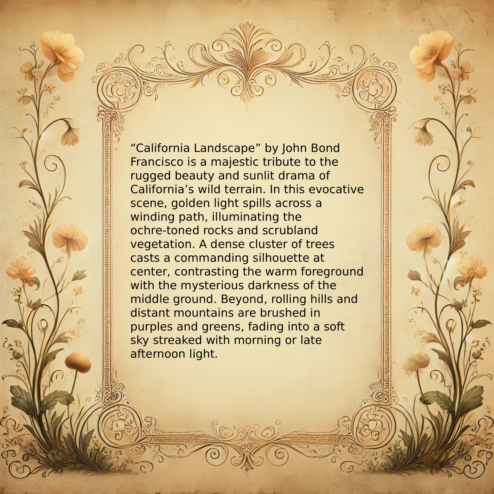 “California Landscape” by John Bond Francisco is a majestic tribute to the rugged beauty and sunlit drama of California’s wild terrain. In this evocative scene, golden light spills across a winding path, illuminating the ochre-toned rocks and scrubland vegetation. A dense cluster of trees casts a commanding silhouette at center, contrasting the warm foreground with the mysterious darkness of the middle ground. Beyond, rolling hills and distant mountains are brushed in purples and greens, fading into a soft sky streaked with morning or late afternoon light.