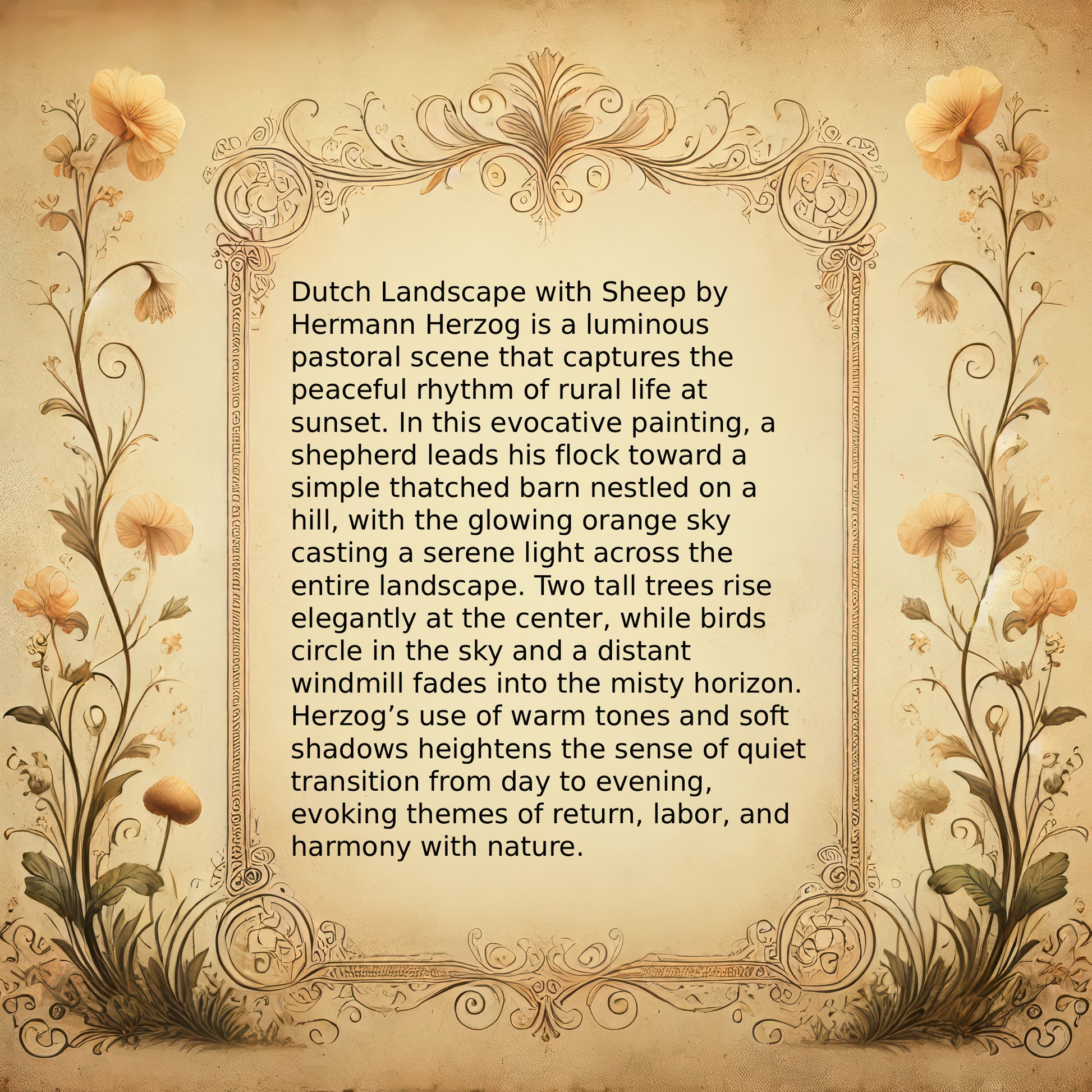 Dutch Landscape with Sheep by Hermann Herzog is a luminous pastoral scene that captures the peaceful rhythm of rural life at sunset. In this evocative painting, a shepherd leads his flock toward a simple thatched barn nestled on a hill, with the glowing orange sky casting a serene light across the entire landscape. Two tall trees rise elegantly at the center, while birds circle in the sky and a distant windmill fades into the misty horizon. Herzog’s use of warm tones and soft shadows heightens the sense of quiet transition from day to evening, evoking themes of return, labor, and harmony with nature.