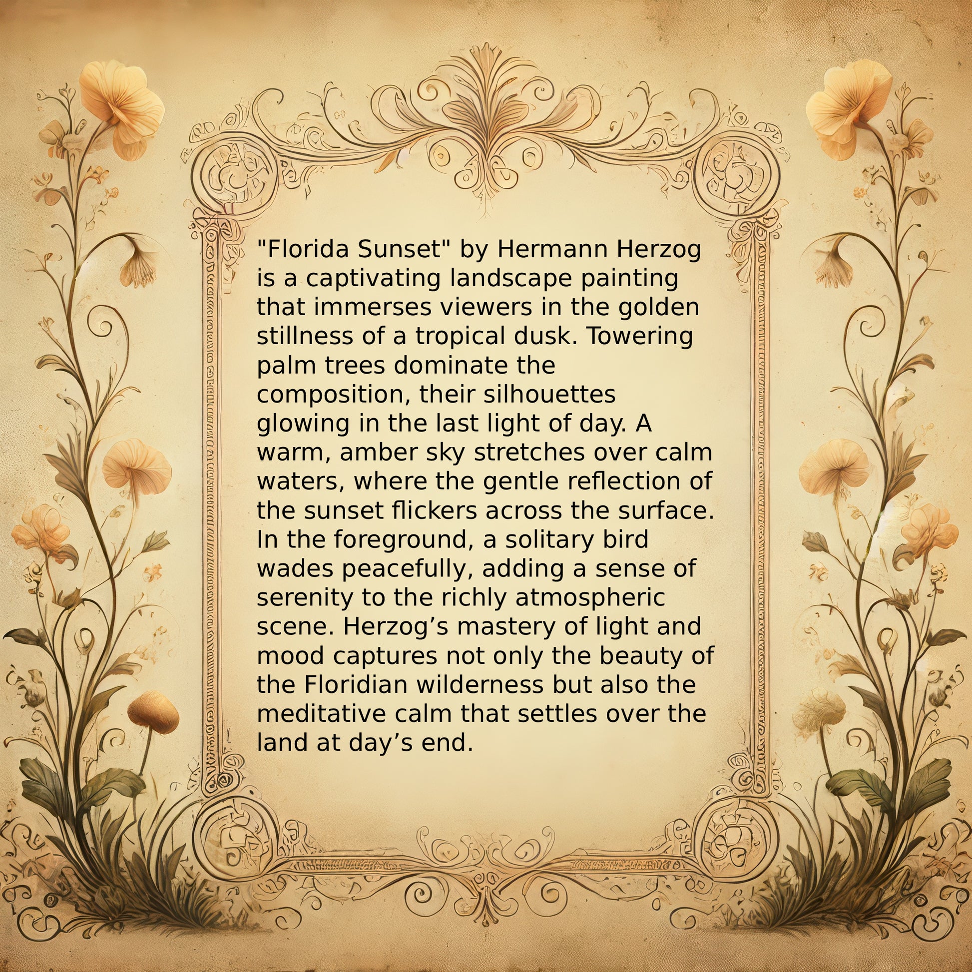 "Florida Sunset" by Hermann Herzog is a captivating landscape painting that immerses viewers in the golden stillness of a tropical dusk. Towering palm trees dominate the composition, their silhouettes glowing in the last light of day. A warm, amber sky stretches over calm waters, where the gentle reflection of the sunset flickers across the surface. In the foreground, a solitary bird wades peacefully, adding a sense of serenity to the richly atmospheric scene. Herzog’s mastery of light and mood captures not only the beauty of the Floridian wilderness but also the meditative calm that settles over the land at day’s end.