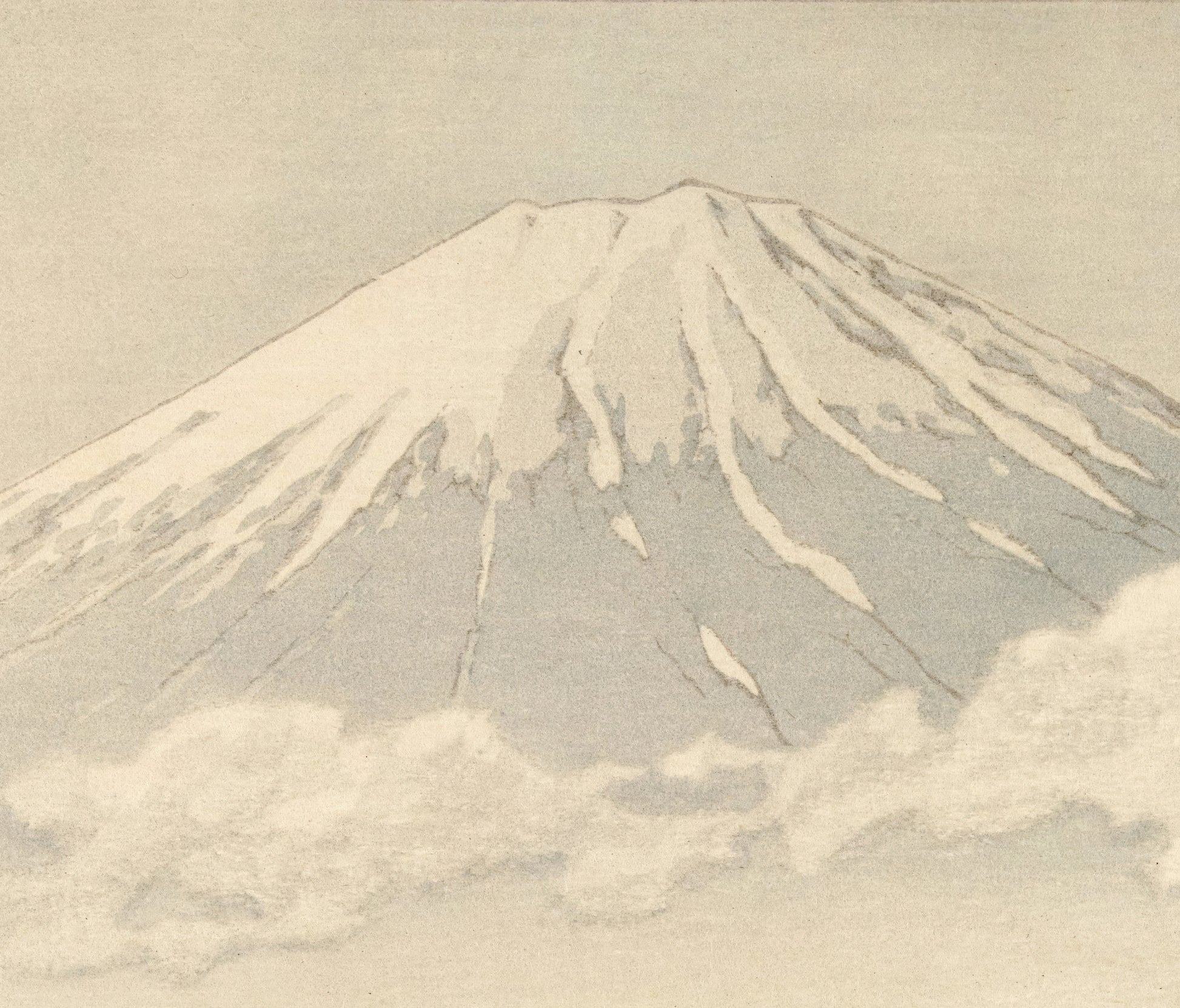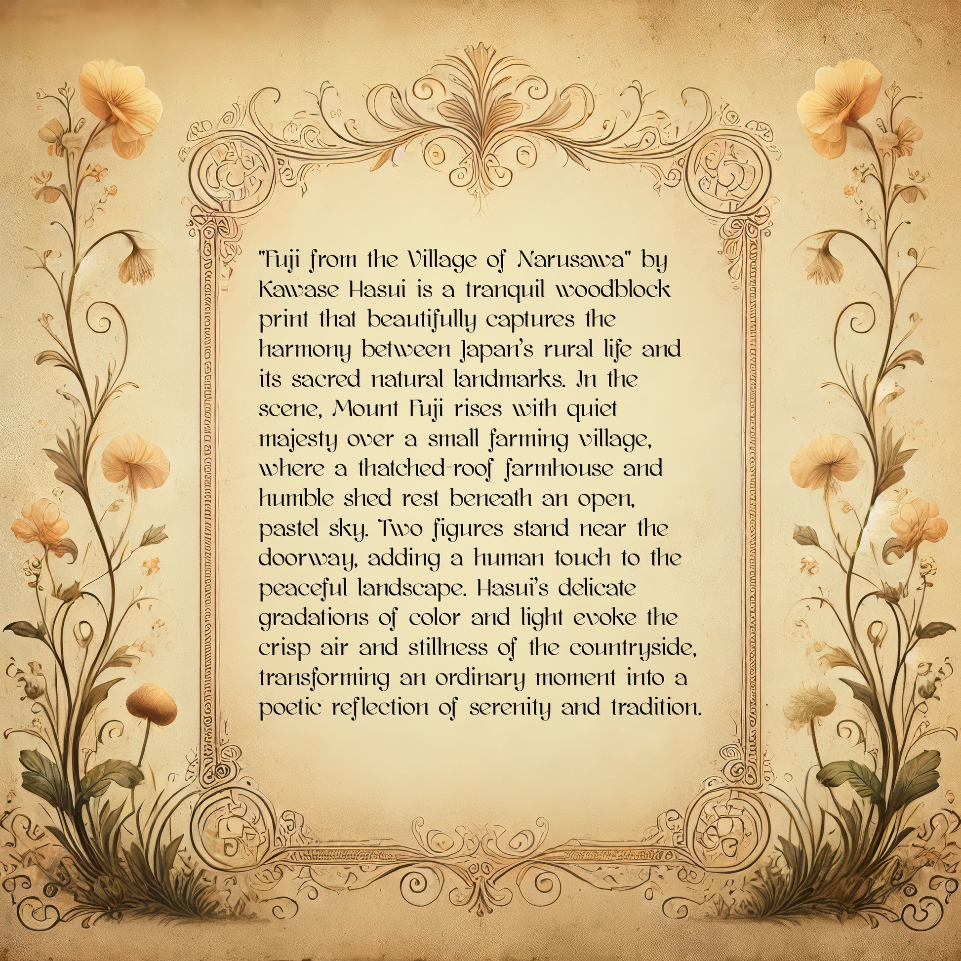 "Fuji from the Village of Narusawa" by Kawase Hasui is a tranquil woodblock print that beautifully captures the harmony between Japan’s rural life and its sacred natural landmarks. In the scene, Mount Fuji rises with quiet majesty over a small farming village, where a thatched-roof farmhouse and humble shed rest beneath an open, pastel sky. Two figures stand near the doorway, adding a human touch to the peaceful landscape. Hasui’s delicate gradations of color and light evoke the crisp air and stillness of the countryside, transforming an ordinary moment into a poetic reflection of serenity and tradition.