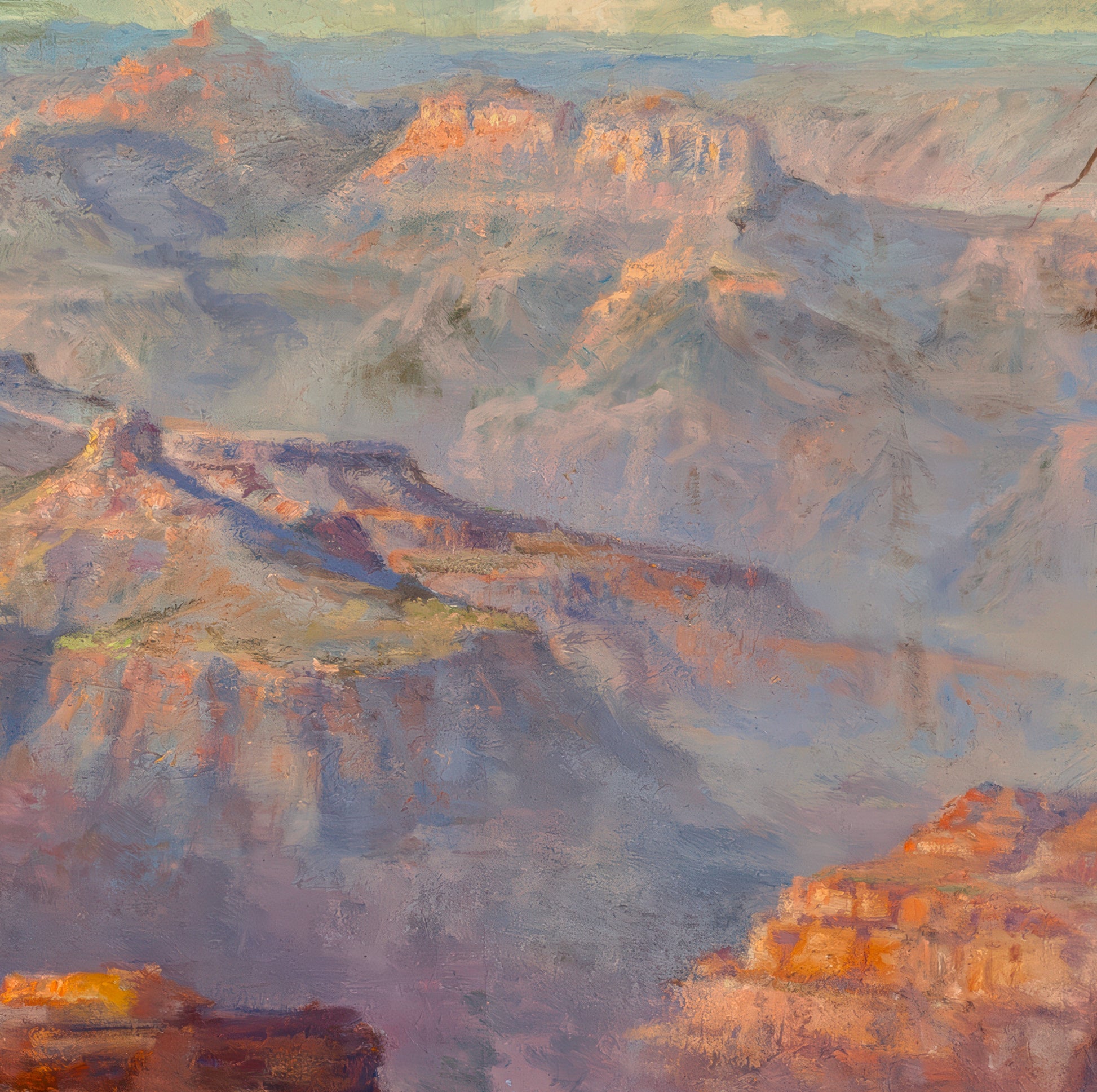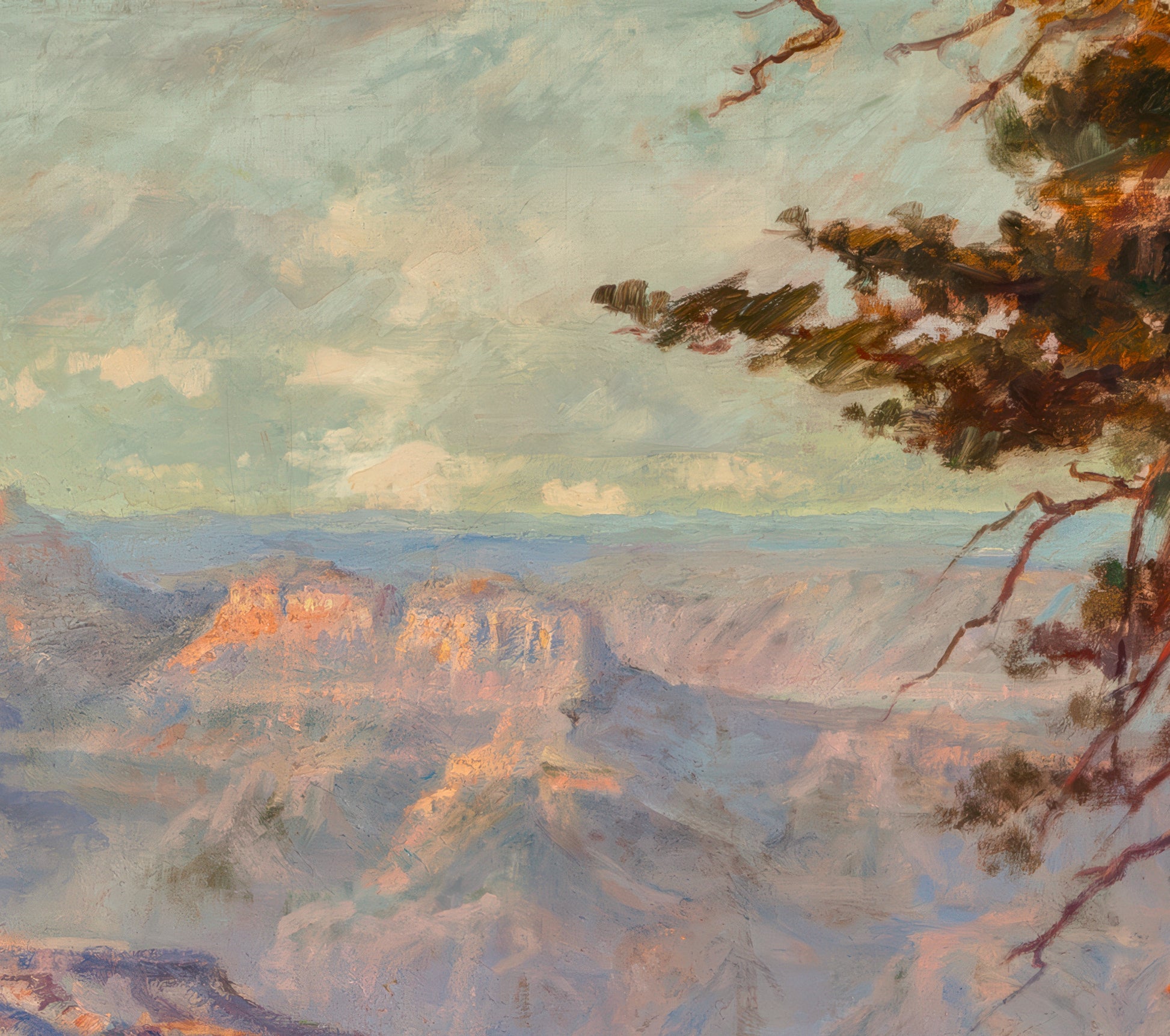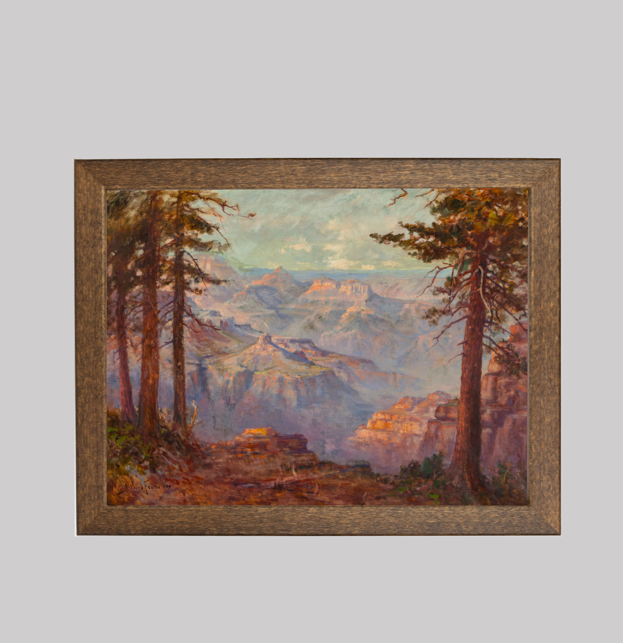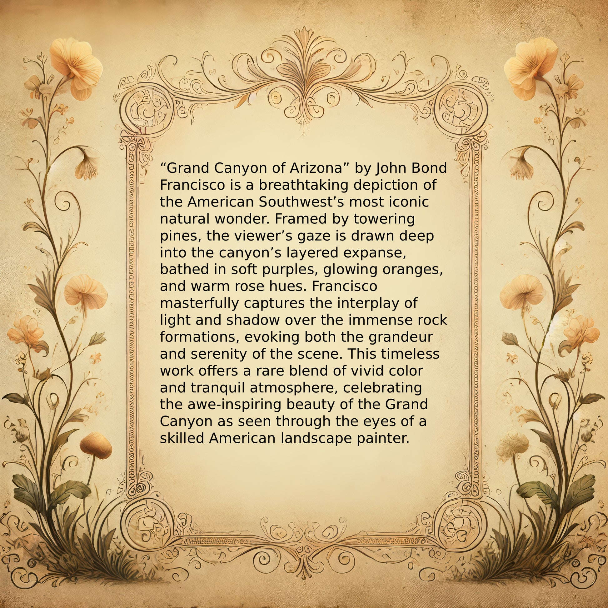 “Grand Canyon of Arizona” by John Bond Francisco is a breathtaking depiction of the American Southwest’s most iconic natural wonder. Framed by towering pines, the viewer’s gaze is drawn deep into the canyon’s layered expanse, bathed in soft purples, glowing oranges, and warm rose hues. Francisco masterfully captures the interplay of light and shadow over the immense rock formations, evoking both the grandeur and serenity of the scene. This timeless work offers a rare blend of vivid color and tranquil atmosphere, celebrating the awe-inspiring beauty of the Grand Canyon as seen through the eyes of a skilled American landscape painter.