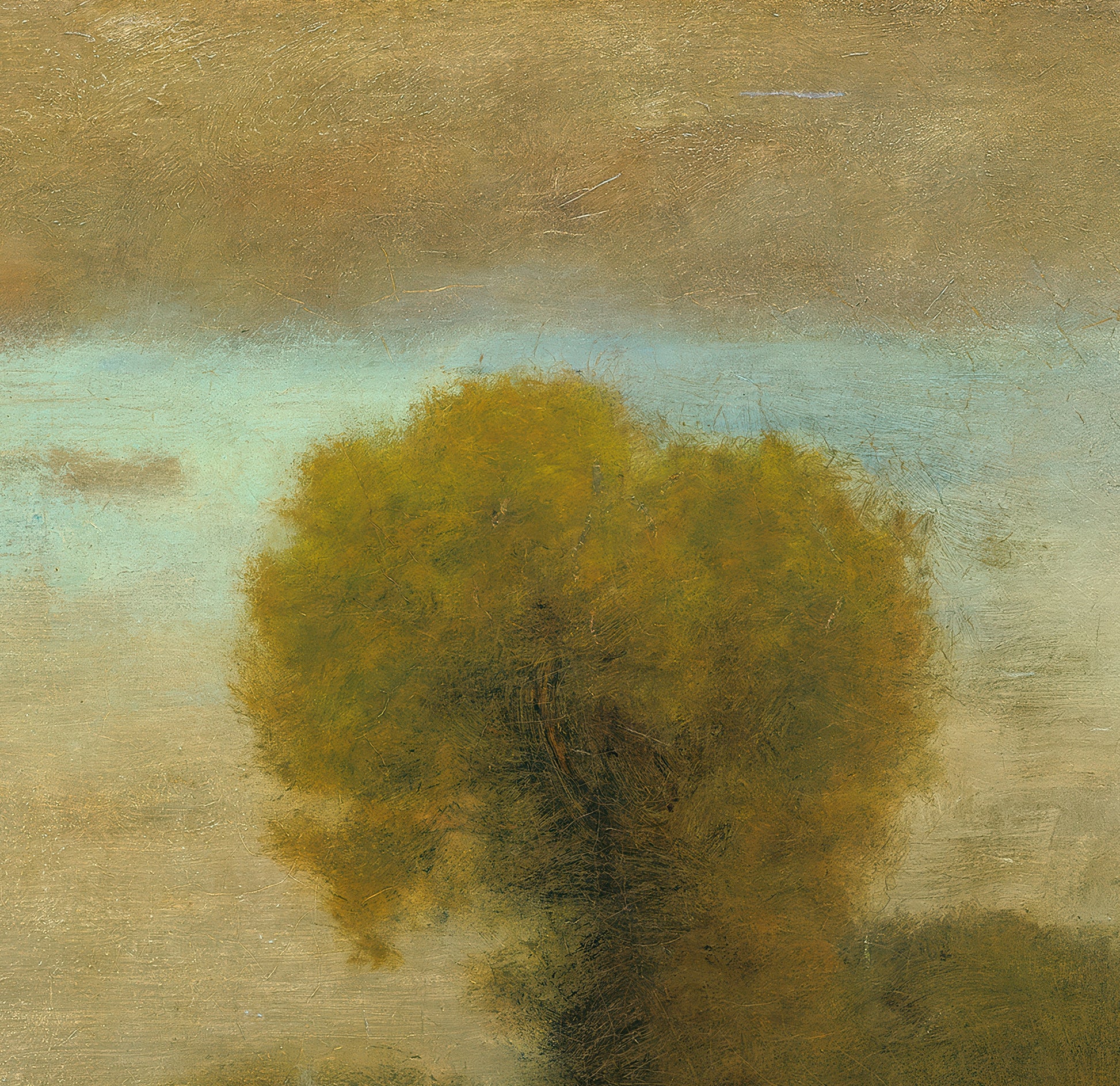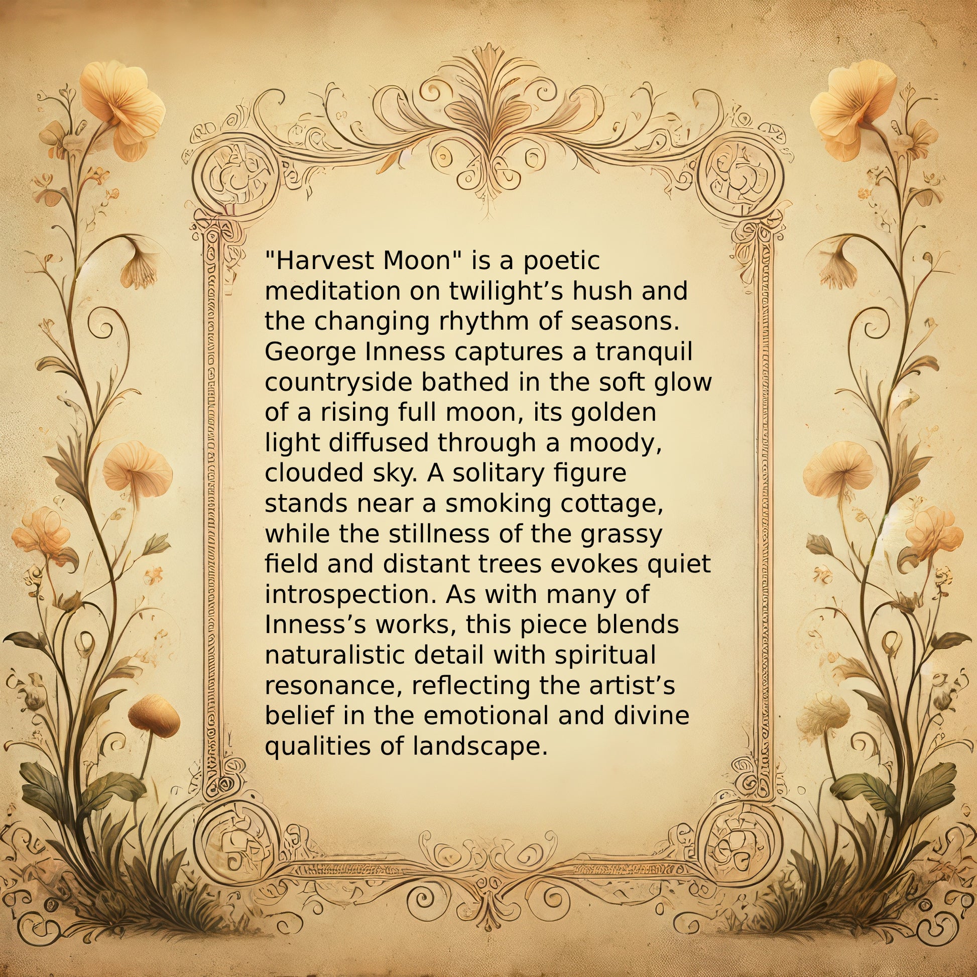 "Harvest Moon" is a poetic meditation on twilight’s hush and the changing rhythm of seasons. George Inness captures a tranquil countryside bathed in the soft glow of a rising full moon, its golden light diffused through a moody, clouded sky. A solitary figure stands near a smoking cottage, while the stillness of the grassy field and distant trees evokes quiet introspection. As with many of Inness’s works, this piece blends naturalistic detail with spiritual resonance, reflecting the artist’s belief in the emotional and divine qualities of landscape.