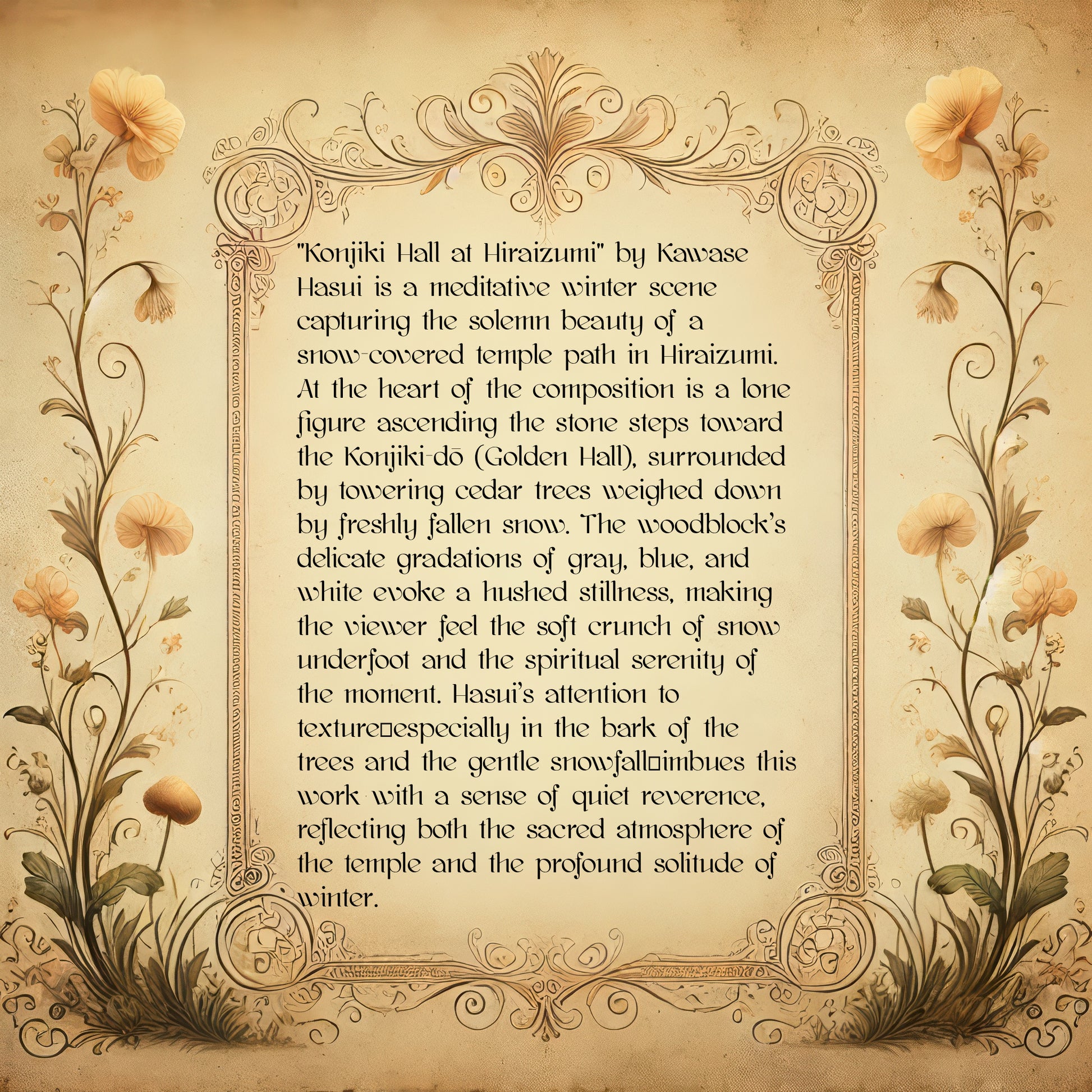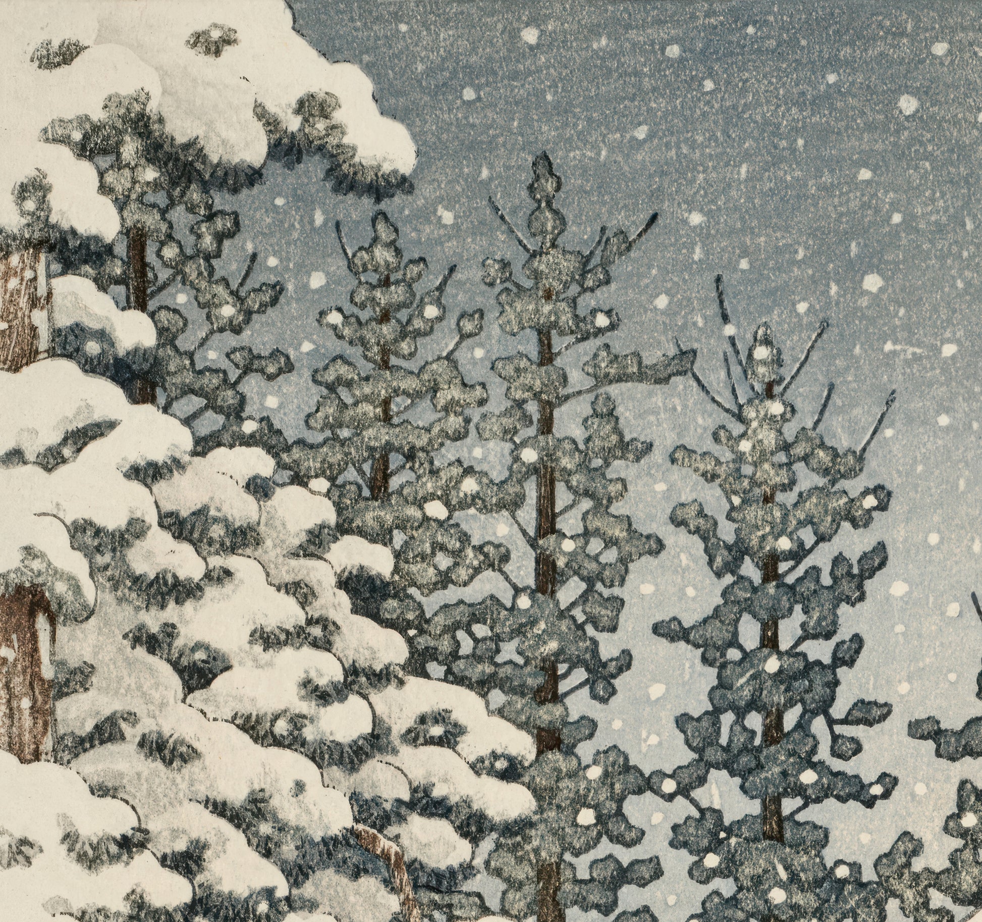 "Konjiki Hall at Hiraizumi" by Kawase Hasui is a meditative winter scene capturing the solemn beauty of a snow-covered temple path in Hiraizumi. At the heart of the composition is a lone figure ascending the stone steps toward the Konjiki-dō (Golden Hall), surrounded by towering cedar trees weighed down by freshly fallen snow. The woodblock’s delicate gradations of gray, blue, and white evoke a hushed stillness, making the viewer feel the soft crunch of snow underfoot and the spiritual serenity of the moment. Hasui’s attention to texture—especially in the bark of the trees and the gentle snowfall—imbues this work with a sense of quiet reverence, reflecting both the sacred atmosphere of the temple and the profound solitude of winter.