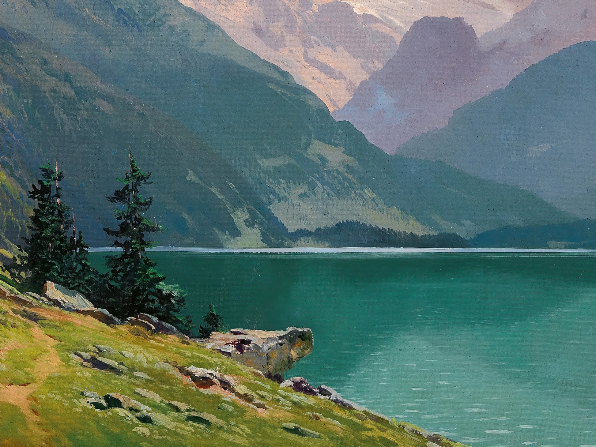 Ideal for nature lovers, hikers, and admirers of classical landscape art, this piece brings the grandeur of the European Alps into any interior space.