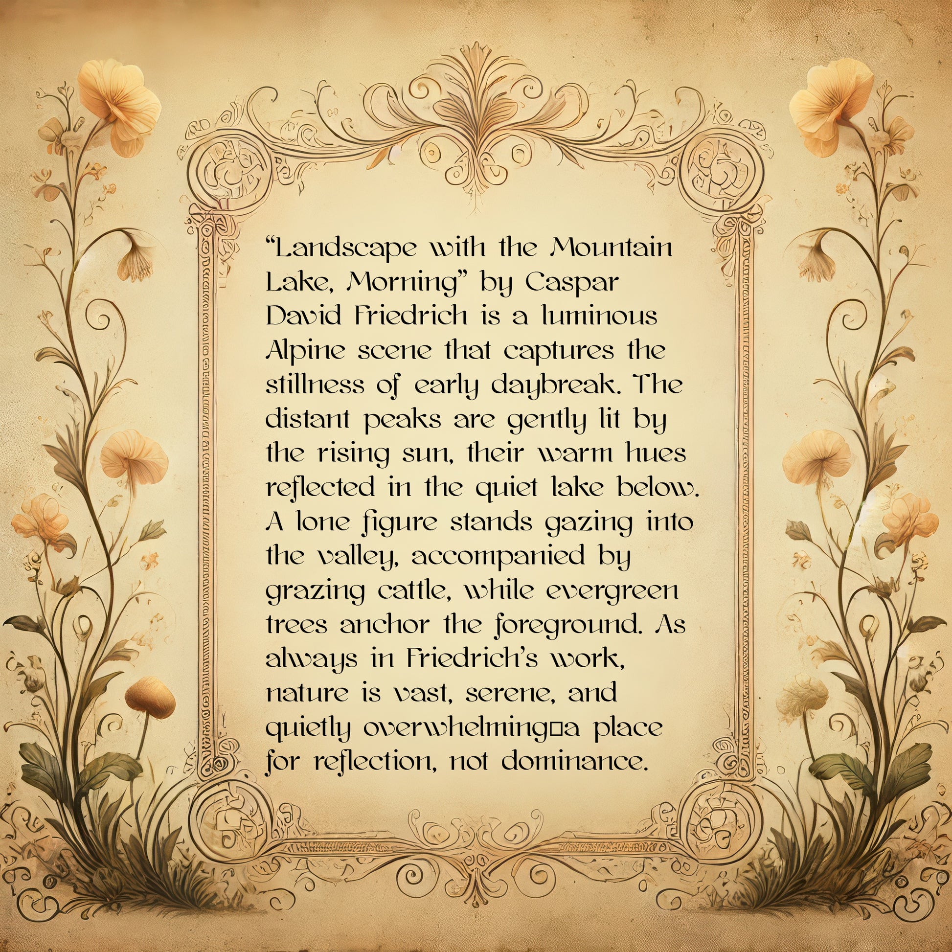 “Landscape with the Mountain Lake, Morning” by Caspar David Friedrich is a luminous Alpine scene that captures the stillness of early daybreak. The distant peaks are gently lit by the rising sun, their warm hues reflected in the quiet lake below. A lone figure stands gazing into the valley, accompanied by grazing cattle, while evergreen trees anchor the foreground. As always in Friedrich’s work, nature is vast, serene, and quietly overwhelming—a place for reflection, not dominance.