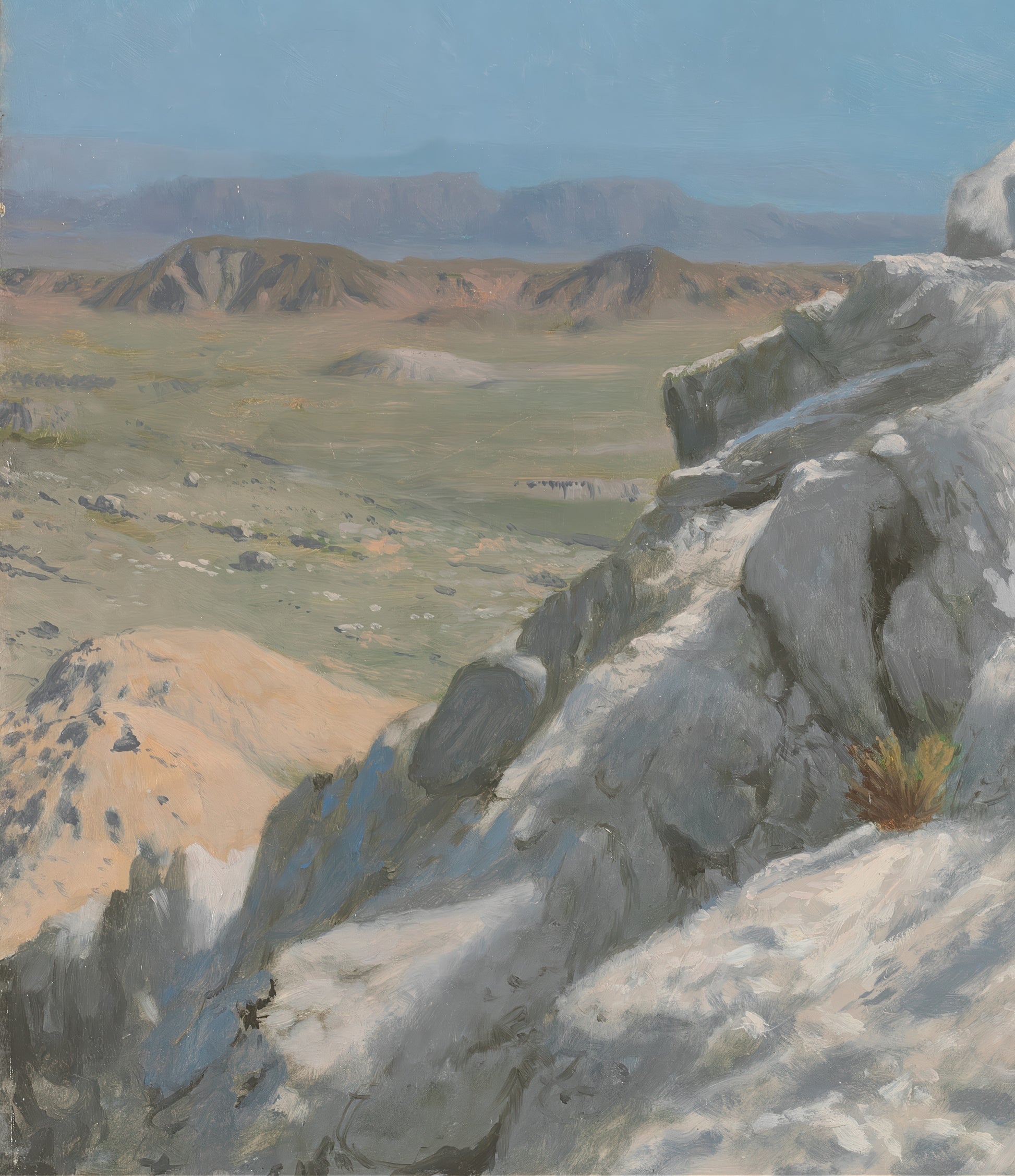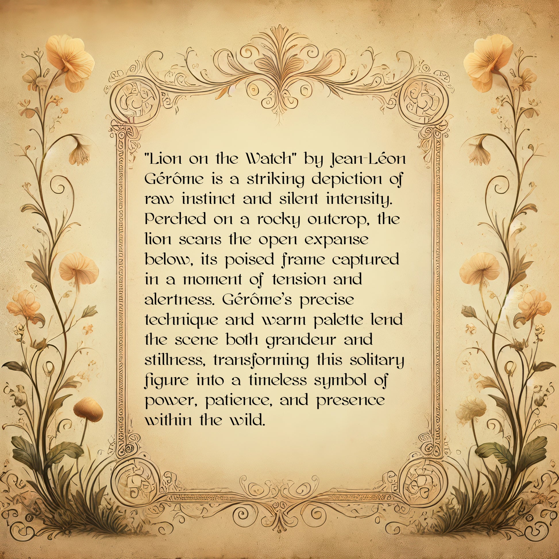"Lion on the Watch" by Jean-Léon Gérôme is a striking depiction of raw instinct and silent intensity. Perched on a rocky outcrop, the lion scans the open expanse below, its poised frame captured in a moment of tension and alertness. Gérôme’s precise technique and warm palette lend the scene both grandeur and stillness, transforming this solitary figure into a timeless symbol of power, patience, and presence within the wild.