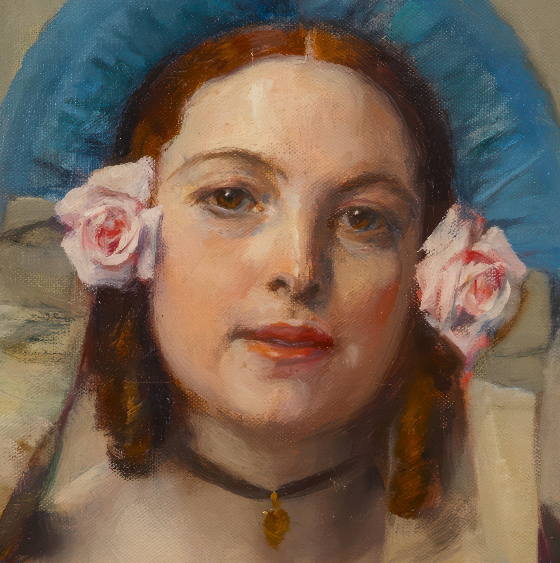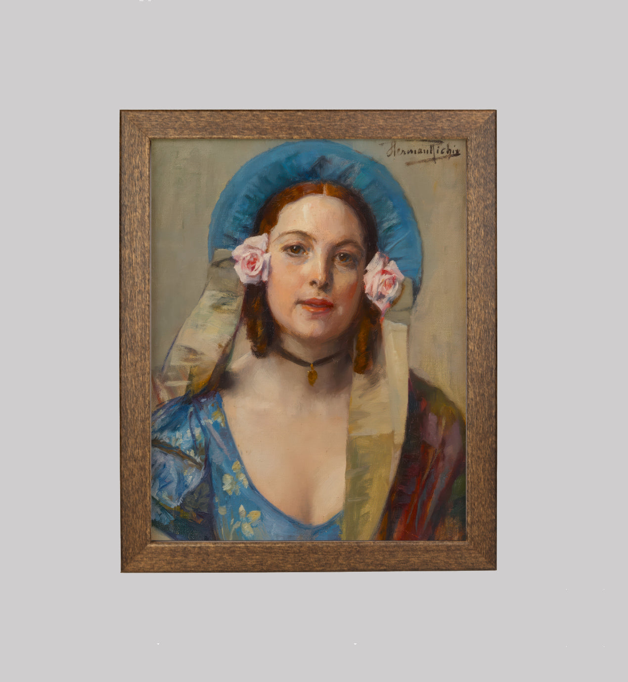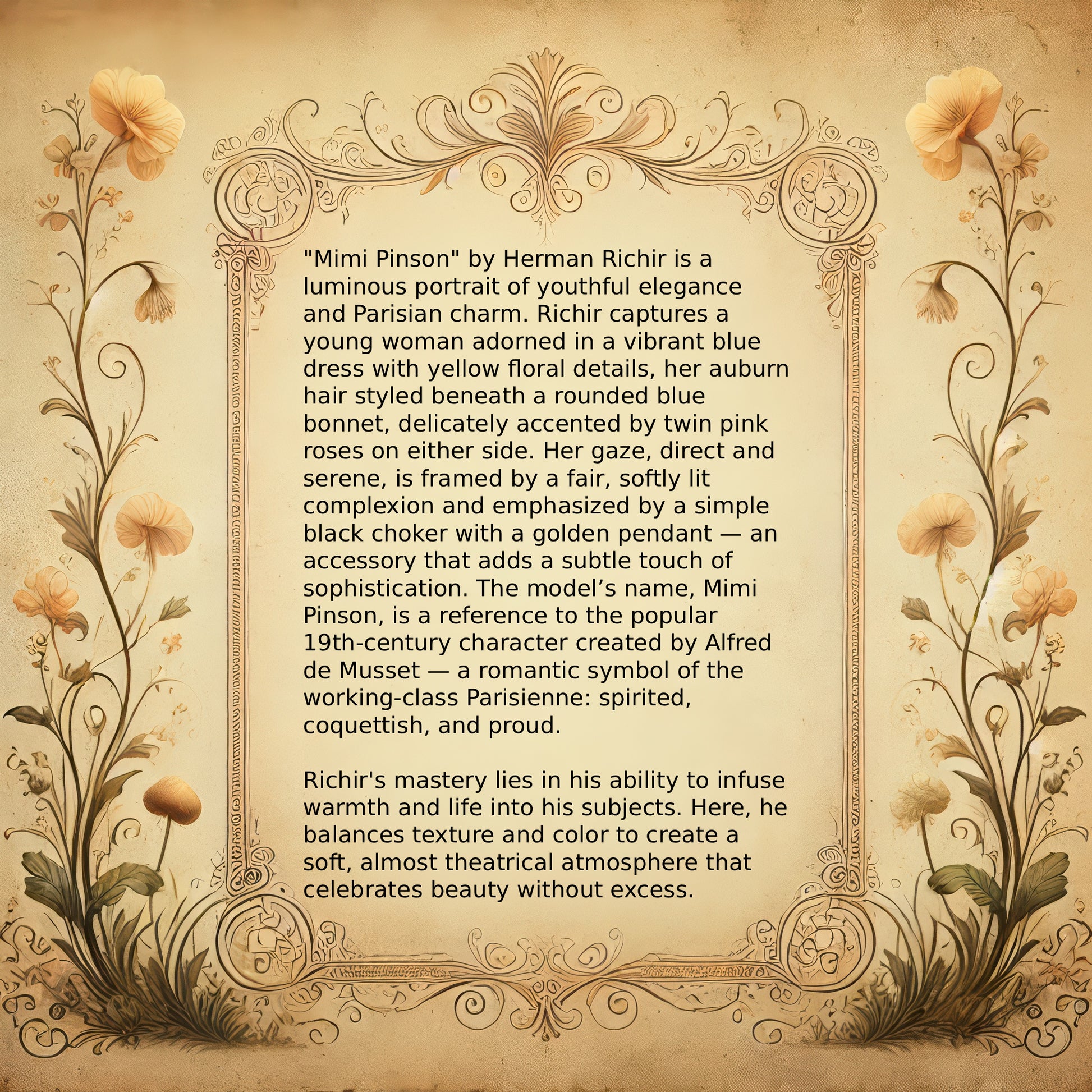 "Mimi Pinson" by Herman Richir is a luminous portrait of youthful elegance and Parisian charm. Richir captures a young woman adorned in a vibrant blue dress with yellow floral details, her auburn hair styled beneath a rounded blue bonnet, delicately accented by twin pink roses on either side. Her gaze, direct and serene, is framed by a fair, softly lit complexion and emphasized by a simple black choker with a golden pendant — an accessory that adds a subtle touch of sophistication. The model’s name, Mimi Pinson, is a reference to the popular 19th-century character created by Alfred de Musset — a romantic symbol of the working-class Parisienne: spirited, coquettish, and proud.