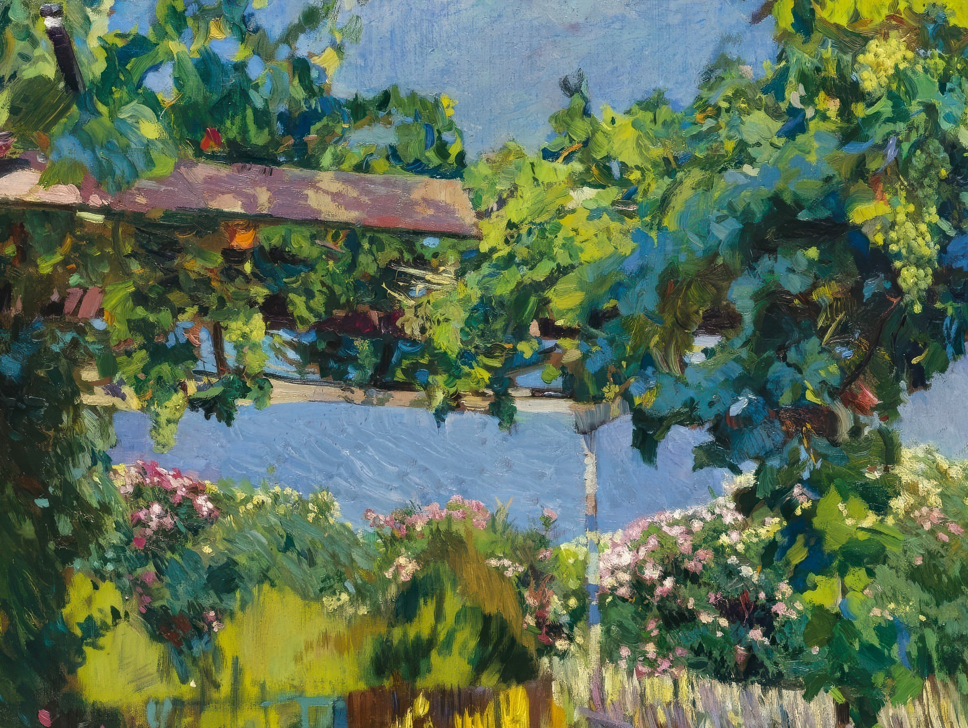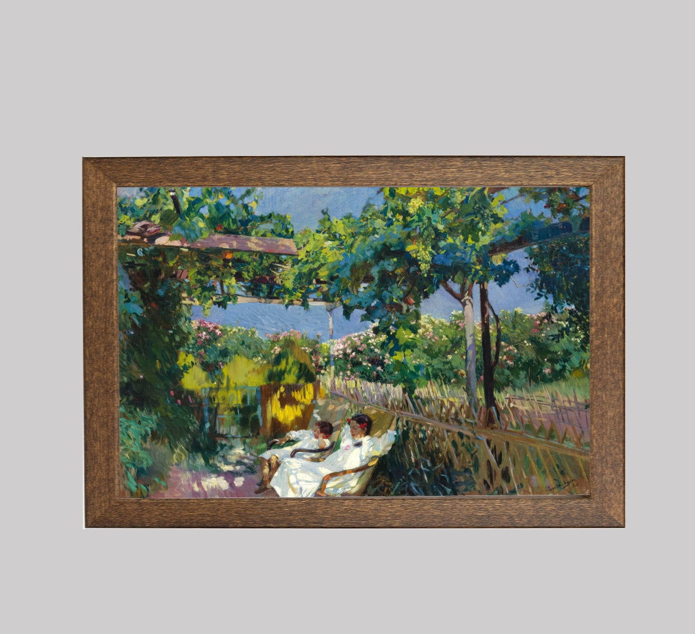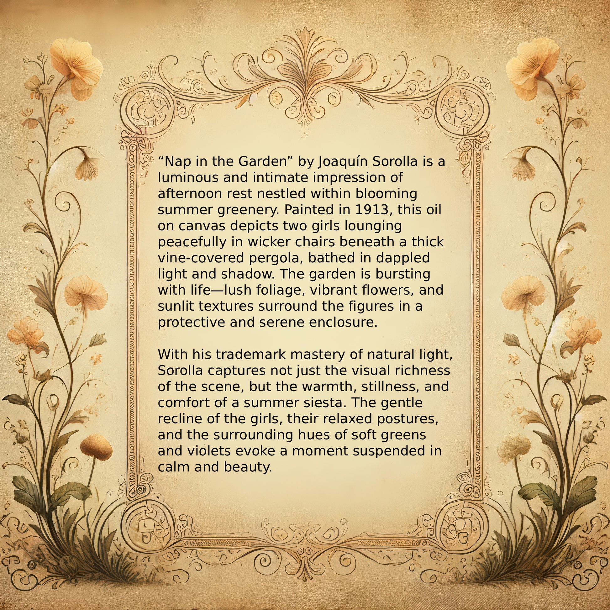 “Nap in the Garden” by Joaquín Sorolla is a luminous and intimate impression of afternoon rest nestled within blooming summer greenery. Painted in 1913, this oil on canvas depicts two girls lounging peacefully in wicker chairs beneath a thick vine-covered pergola, bathed in dappled light and shadow. The garden is bursting with life—lush foliage, vibrant flowers, and sunlit textures surround the figures in a protective and serene enclosure.
