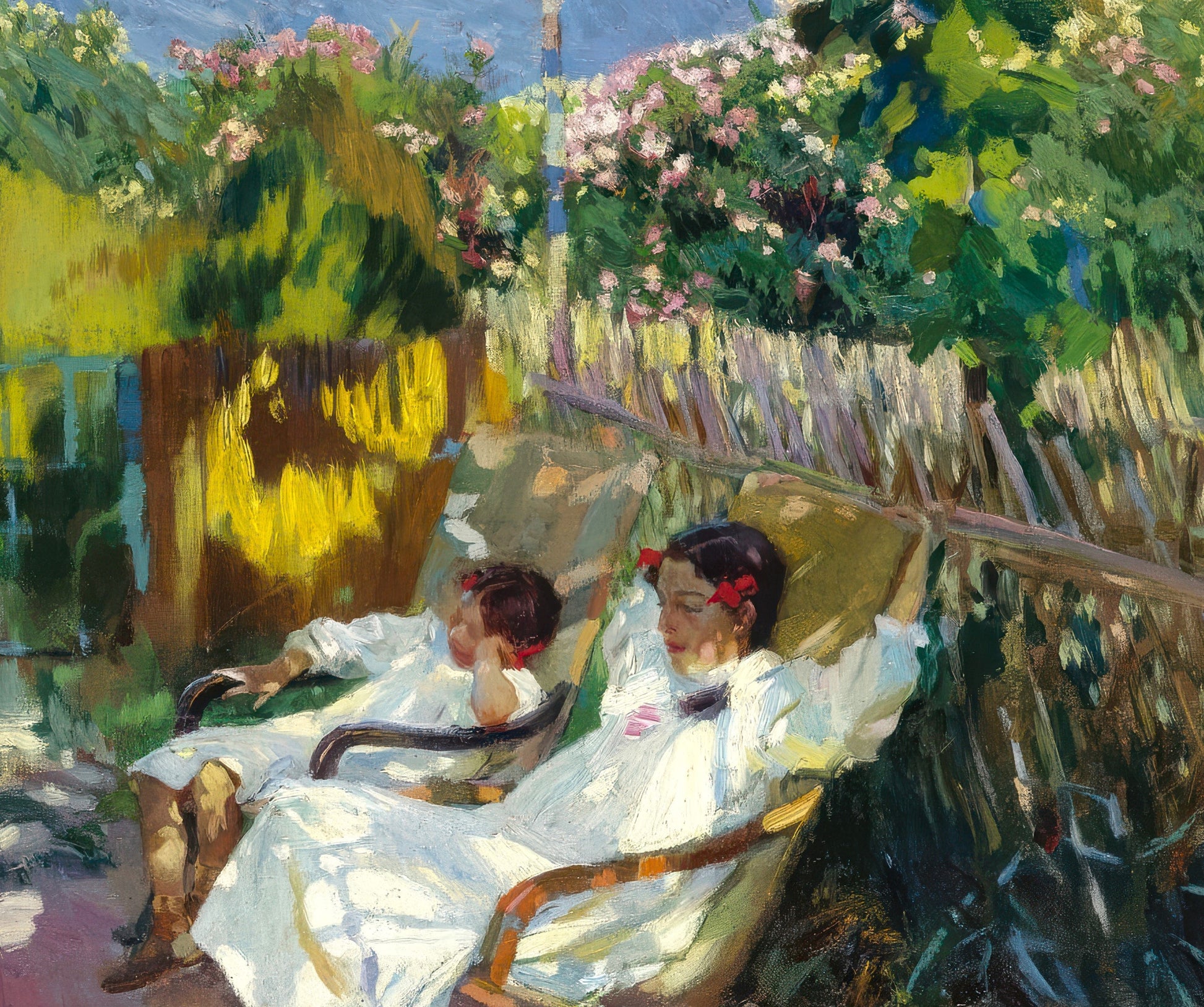 With his trademark mastery of natural light, Sorolla captures not just the visual richness of the scene, but the warmth, stillness, and comfort of a summer siesta. The gentle recline of the girls, their relaxed postures, and the surrounding hues of soft greens and violets evoke a moment suspended in calm and beauty.