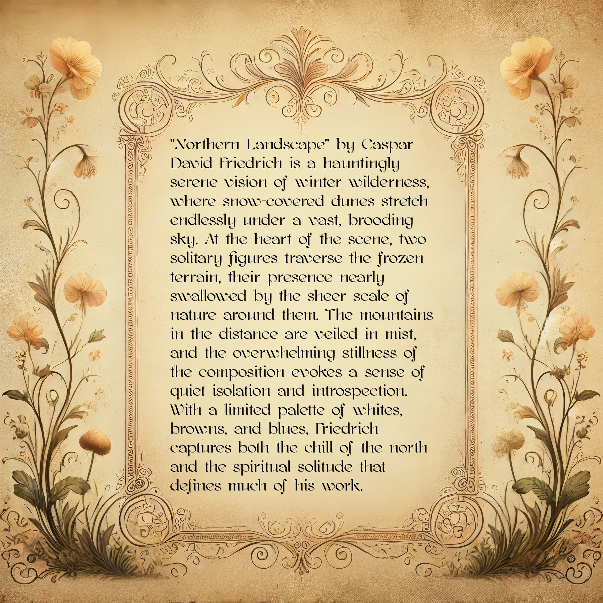 "Northern Landscape" by Caspar David Friedrich is a hauntingly serene vision of winter wilderness, where snow-covered dunes stretch endlessly under a vast, brooding sky. At the heart of the scene, two solitary figures traverse the frozen terrain, their presence nearly swallowed by the sheer scale of nature around them. The mountains in the distance are veiled in mist, and the overwhelming stillness of the composition evokes a sense of quiet isolation and introspection. With a limited palette of whites, browns, and blues, Friedrich captures both the chill of the north and the spiritual solitude that defines much of his work.