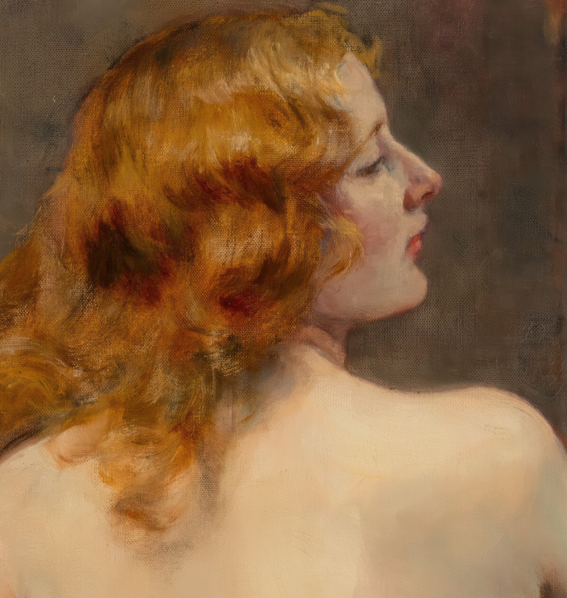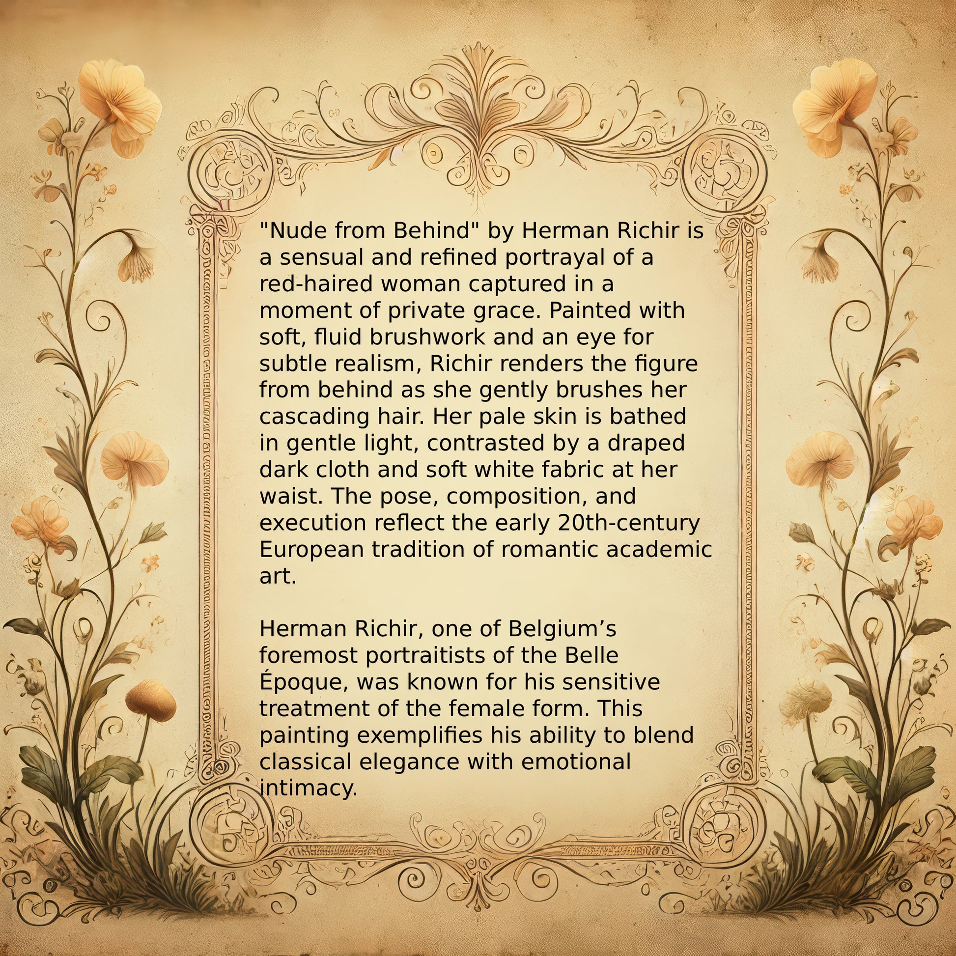 "Nude from Behind" by Herman Richir is a sensual and refined portrayal of a red-haired woman captured in a moment of private grace. Painted with soft, fluid brushwork and an eye for subtle realism, Richir renders the figure from behind as she gently brushes her cascading hair. Her pale skin is bathed in gentle light, contrasted by a draped dark cloth and soft white fabric at her waist. The pose, composition, and execution reflect the early 20th-century European tradition of romantic academic art.