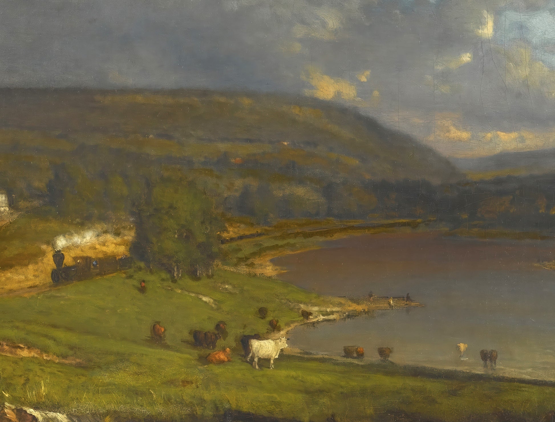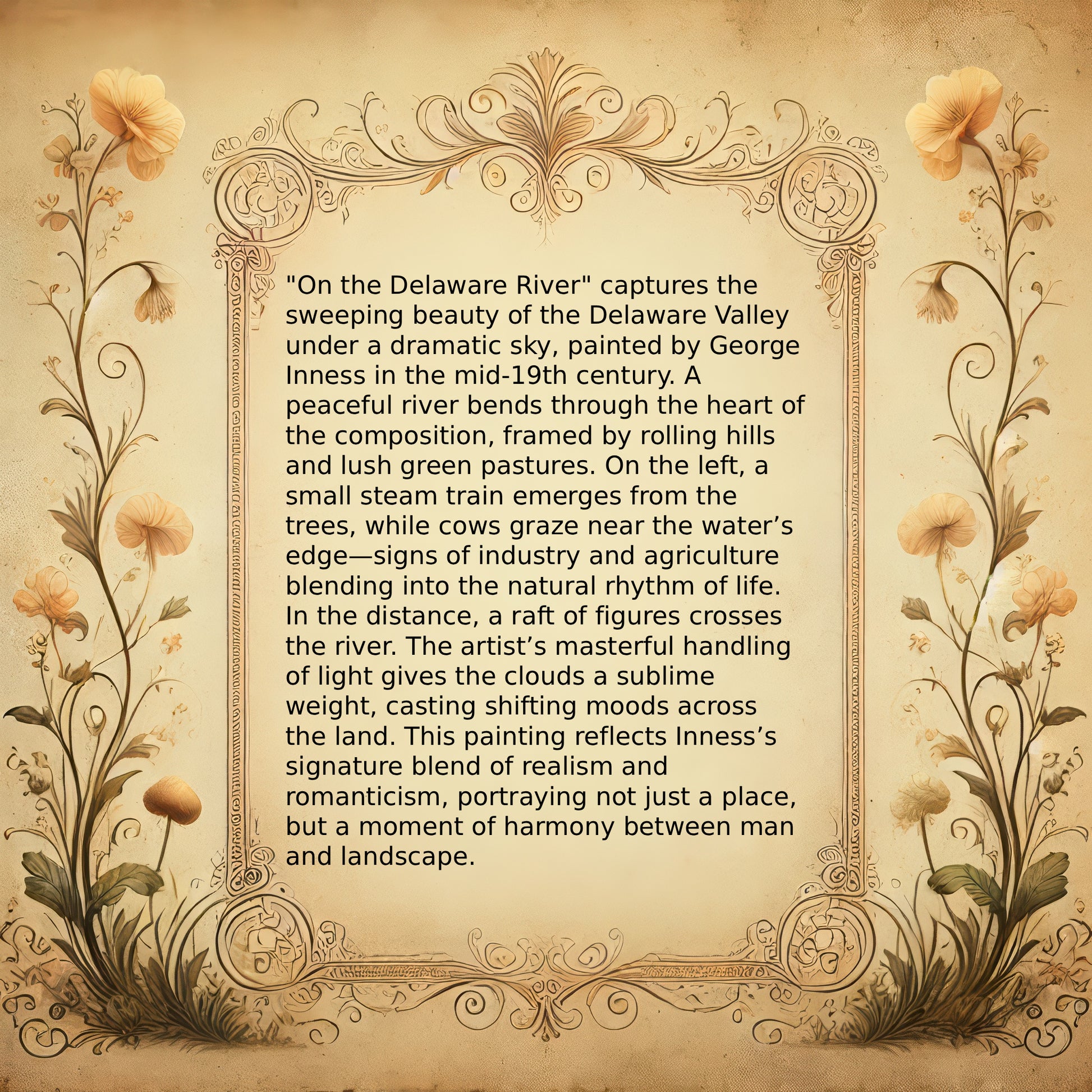"On the Delaware River" captures the sweeping beauty of the Delaware Valley under a dramatic sky, painted by George Inness in the mid-19th century. A peaceful river bends through the heart of the composition, framed by rolling hills and lush green pastures. On the left, a small steam train emerges from the trees, while cows graze near the water’s edge—signs of industry and agriculture blending into the natural rhythm of life. In the distance, a raft of figures crosses the river. The artist’s masterful handling of light gives the clouds a sublime weight, casting shifting moods across the land. This painting reflects Inness’s signature blend of realism and romanticism, portraying not just a place, but a moment of harmony between man and landscape.