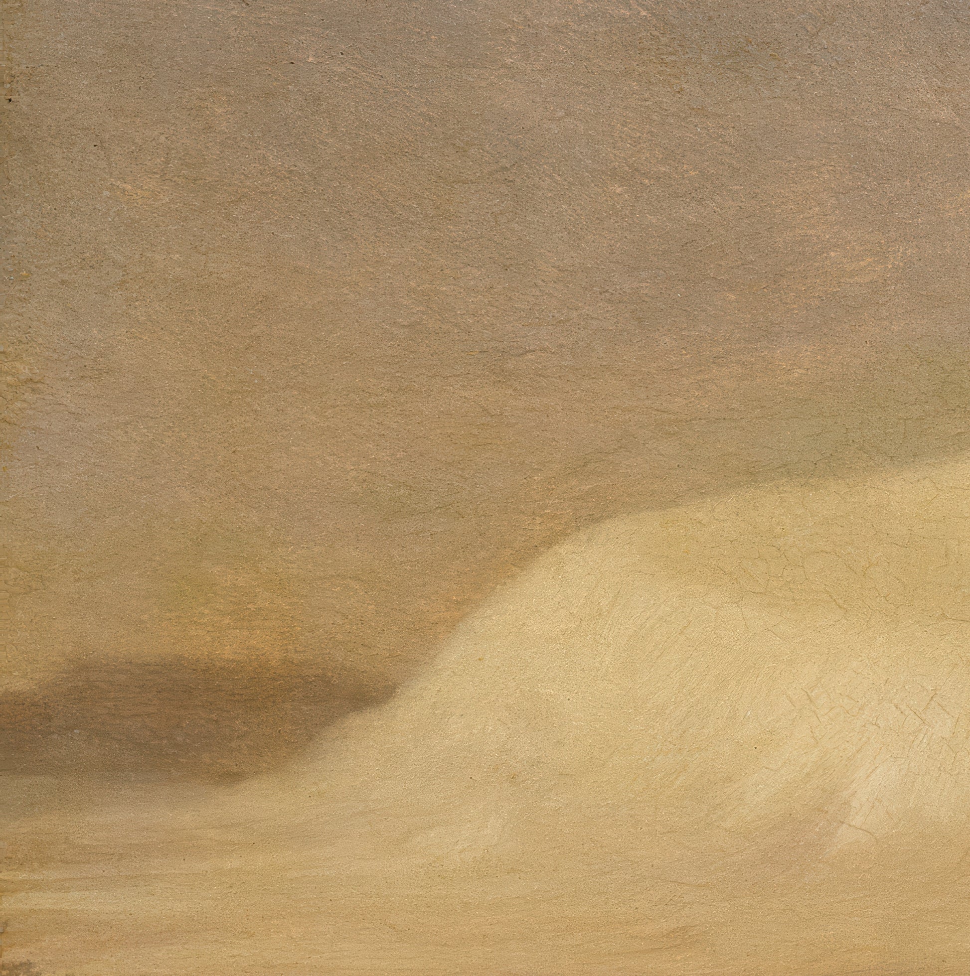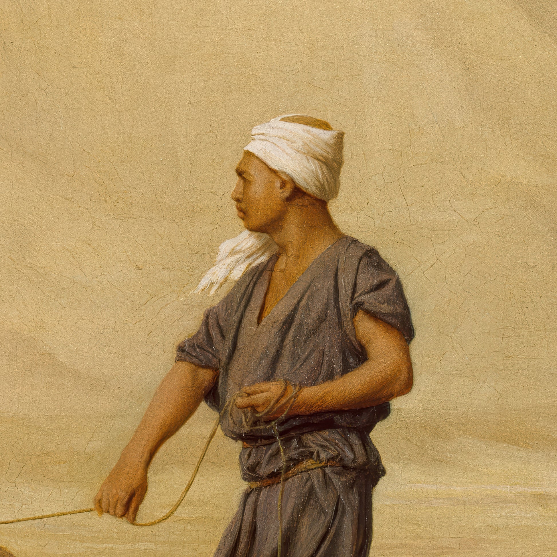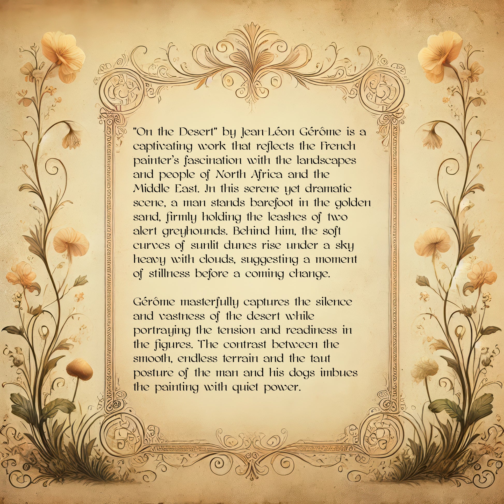 "On the Desert" by Jean-Léon Gérôme is a captivating work that reflects the French painter’s fascination with the landscapes and people of North Africa and the Middle East. In this serene yet dramatic scene, a man stands barefoot in the golden sand, firmly holding the leashes of two alert greyhounds. Behind him, the soft curves of sunlit dunes rise under a sky heavy with clouds, suggesting a moment of stillness before a coming change.