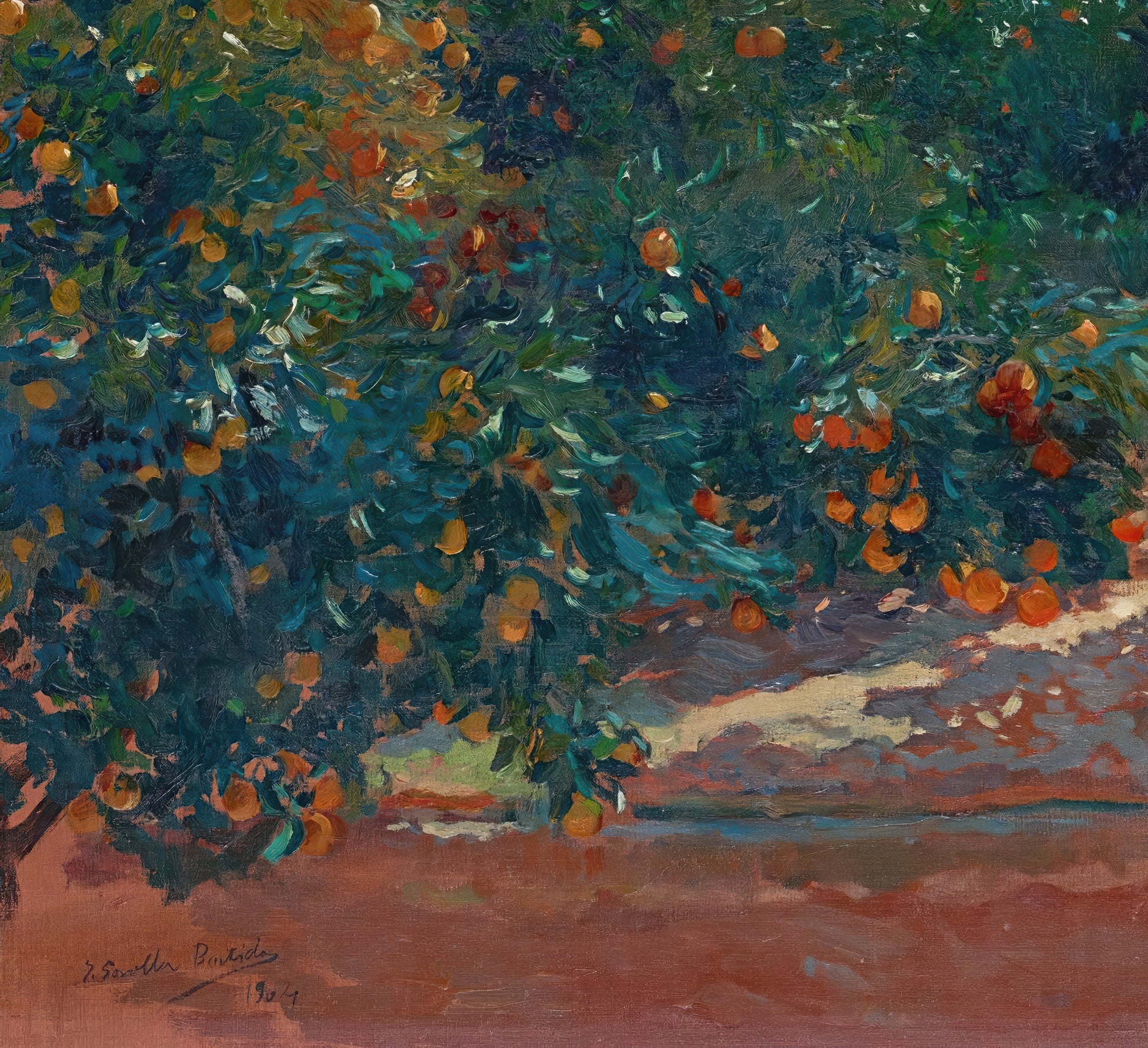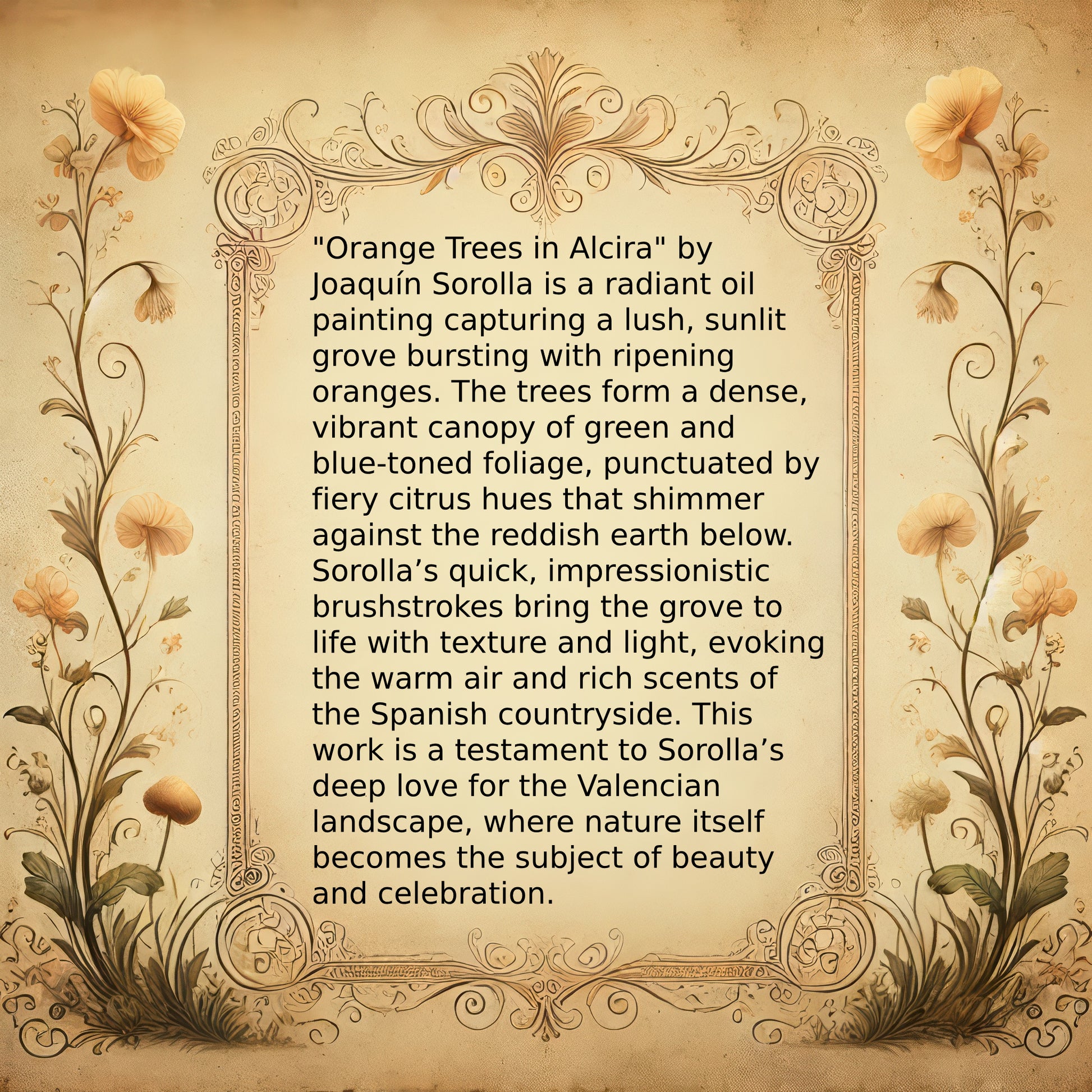 "Orange Trees in Alcira" by Joaquín Sorolla is a radiant oil painting capturing a lush, sunlit grove bursting with ripening oranges. The trees form a dense, vibrant canopy of green and blue-toned foliage, punctuated by fiery citrus hues that shimmer against the reddish earth below. Sorolla’s quick, impressionistic brushstrokes bring the grove to life with texture and light, evoking the warm air and rich scents of the Spanish countryside. This work is a testament to Sorolla’s deep love for the Valencian landscape, where nature itself becomes the subject of beauty and celebration.