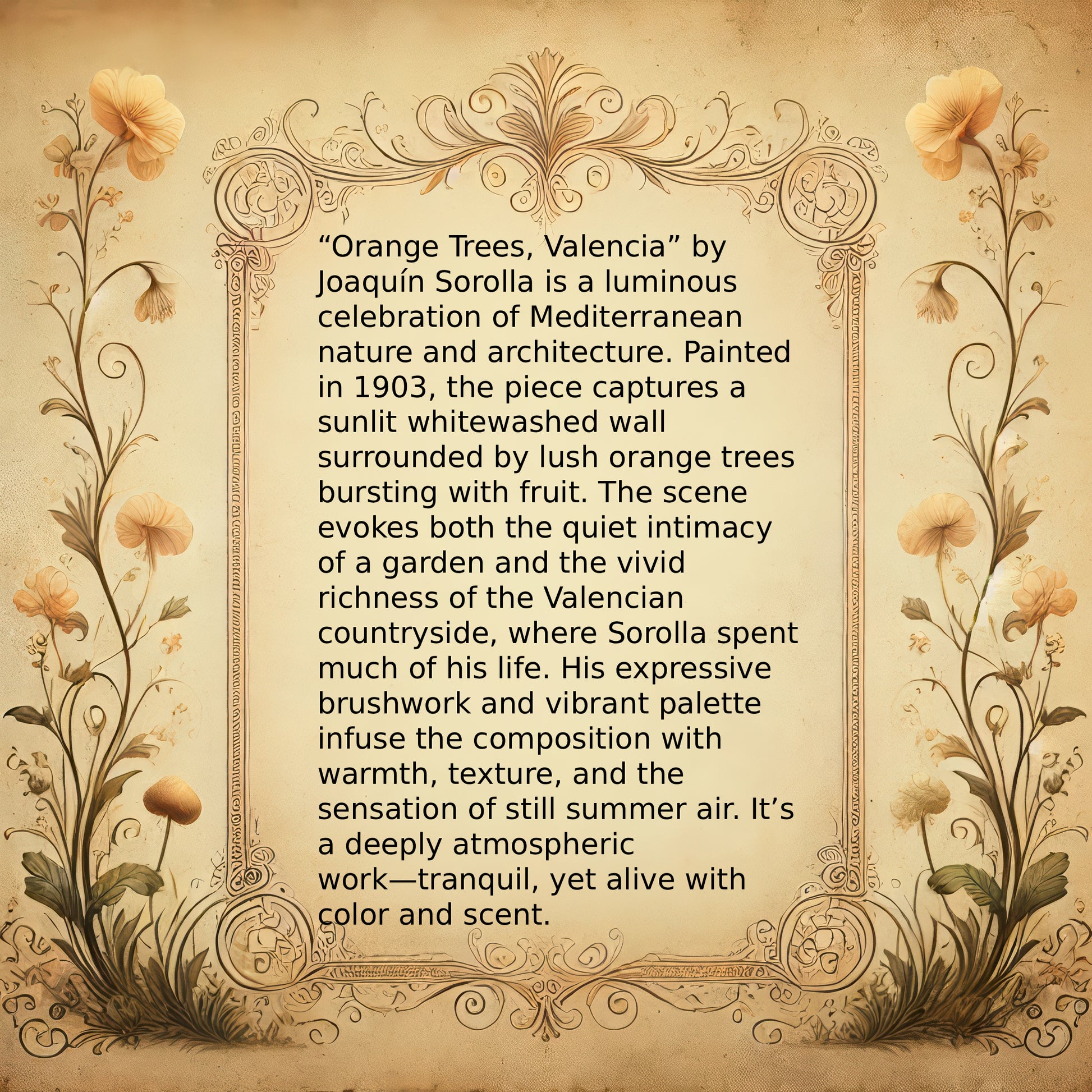 “Orange Trees, Valencia” by Joaquín Sorolla is a luminous celebration of Mediterranean nature and architecture. Painted in 1903, the piece captures a sunlit whitewashed wall surrounded by lush orange trees bursting with fruit. The scene evokes both the quiet intimacy of a garden and the vivid richness of the Valencian countryside, where Sorolla spent much of his life. His expressive brushwork and vibrant palette infuse the composition with warmth, texture, and the sensation of still summer air. It’s a deeply atmospheric work—tranquil, yet alive with color and scent.