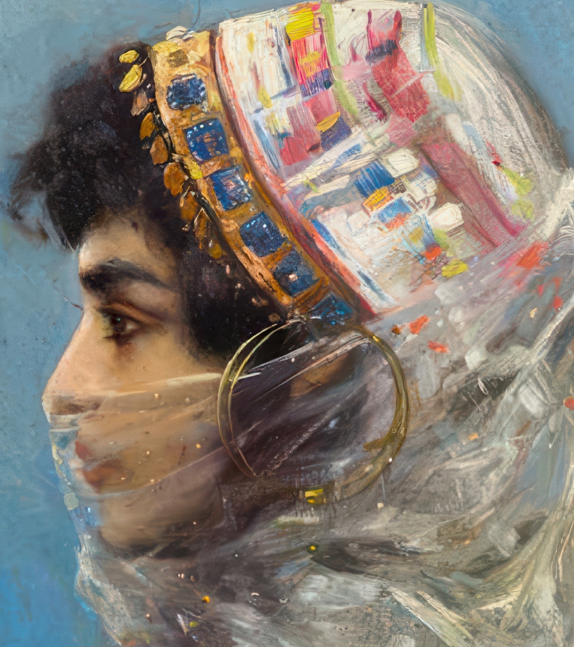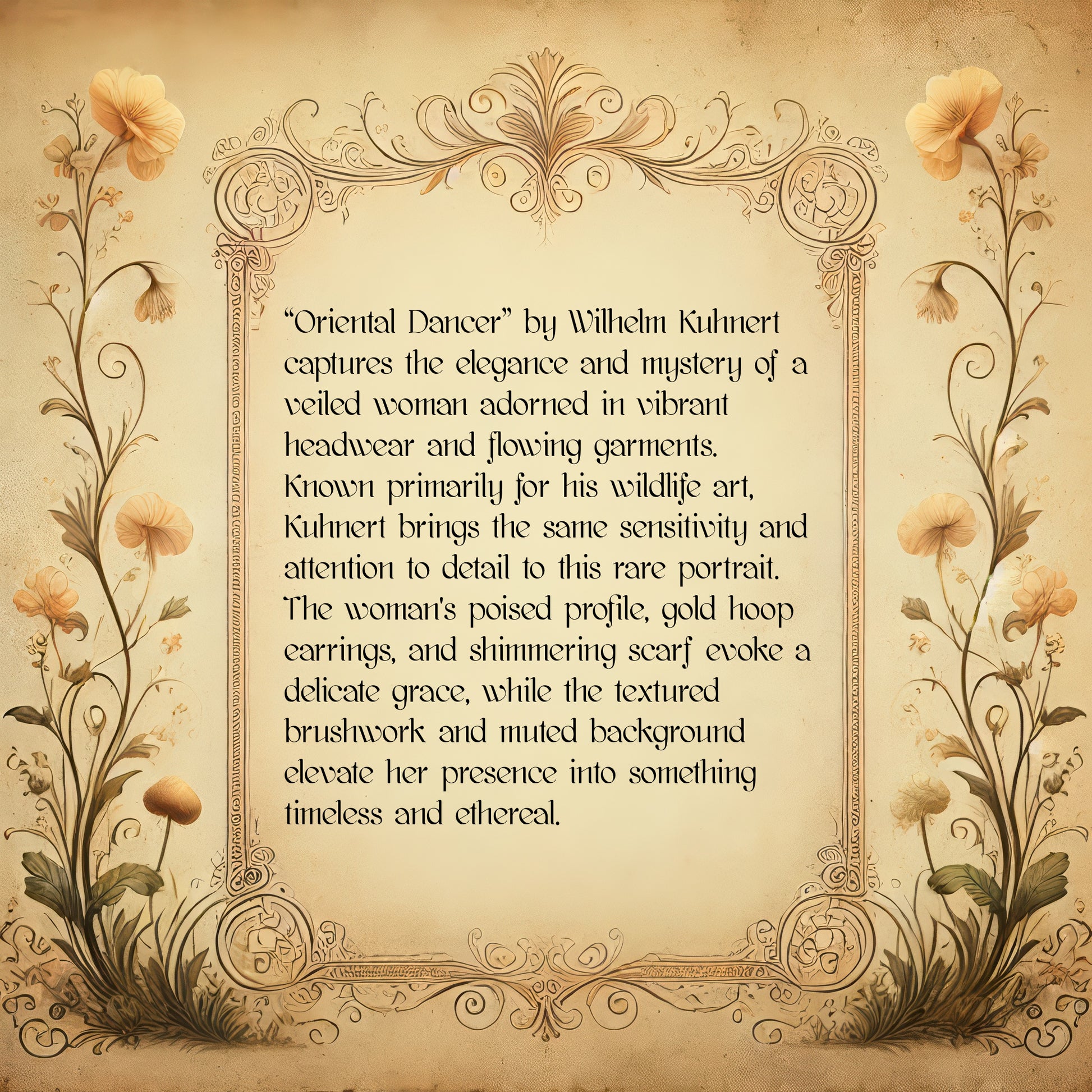 “Oriental Dancer” by Wilhelm Kuhnert captures the elegance and mystery of a veiled woman adorned in vibrant headwear and flowing garments. Known primarily for his wildlife art, Kuhnert brings the same sensitivity and attention to detail to this rare portrait. The woman's poised profile, gold hoop earrings, and shimmering scarf evoke a delicate grace, while the textured brushwork and muted background elevate her presence into something timeless and ethereal.