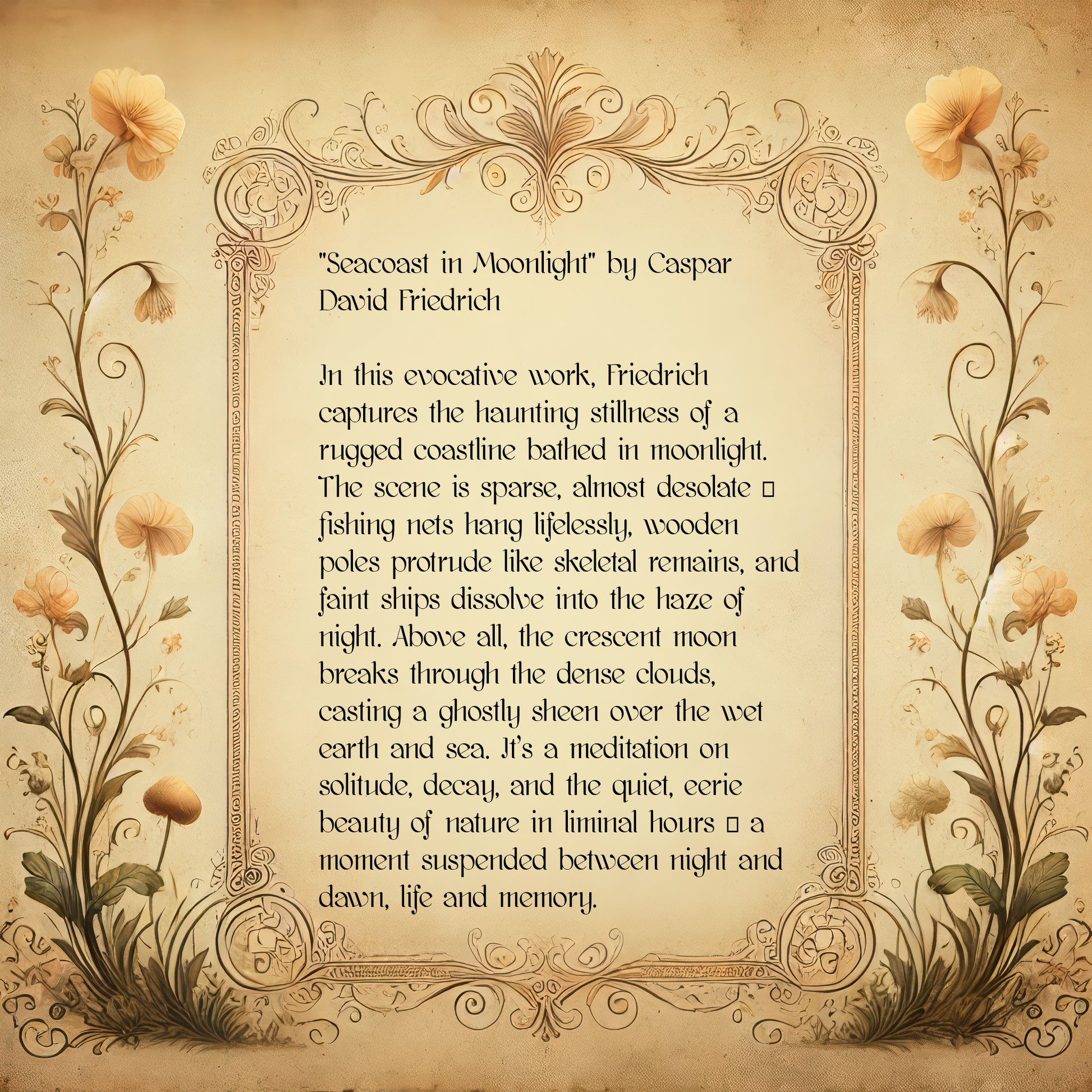 In this evocative work, Friedrich captures the haunting stillness of a rugged coastline bathed in moonlight. The scene is sparse, almost desolate β fishing nets hang lifelessly, wooden poles protrude like skeletal remains, and faint ships dissolve into the haze of night. Above all, the crescent moon breaks through the dense clouds, casting a ghostly sheen over the wet earth and sea. Itβs a meditation on solitude, decay, and the quiet, eerie beauty of nature in liminal hours β a moment suspended between night and dawn, life and memory.