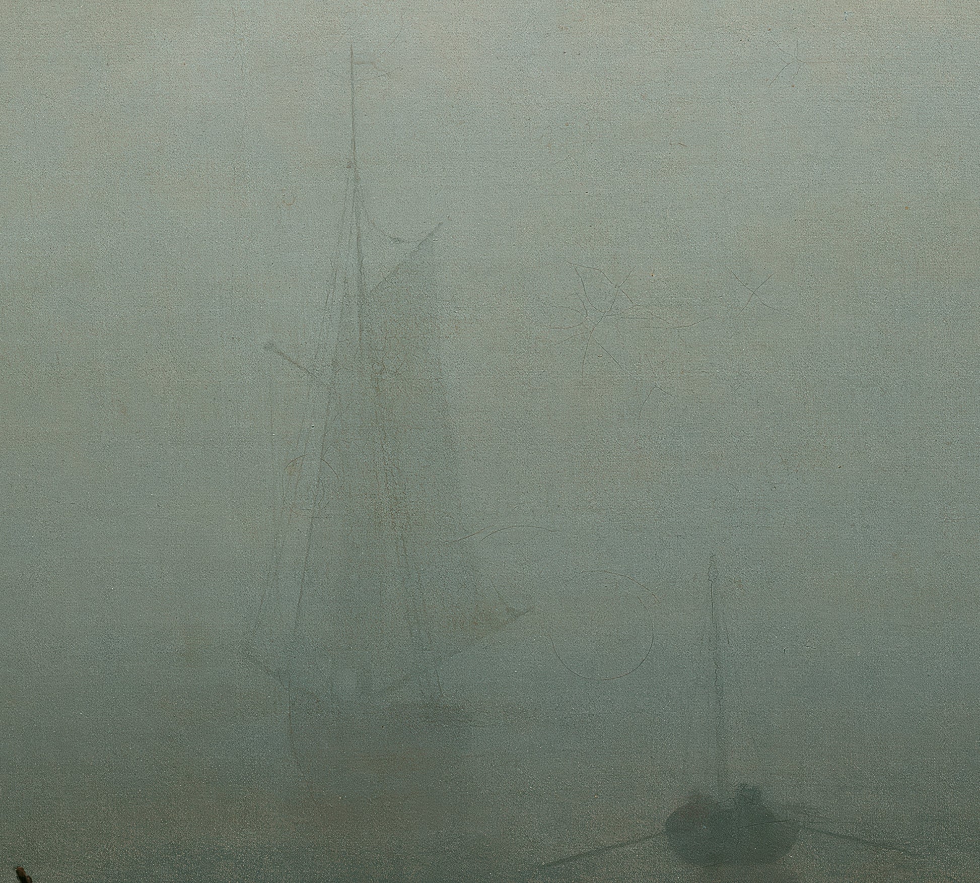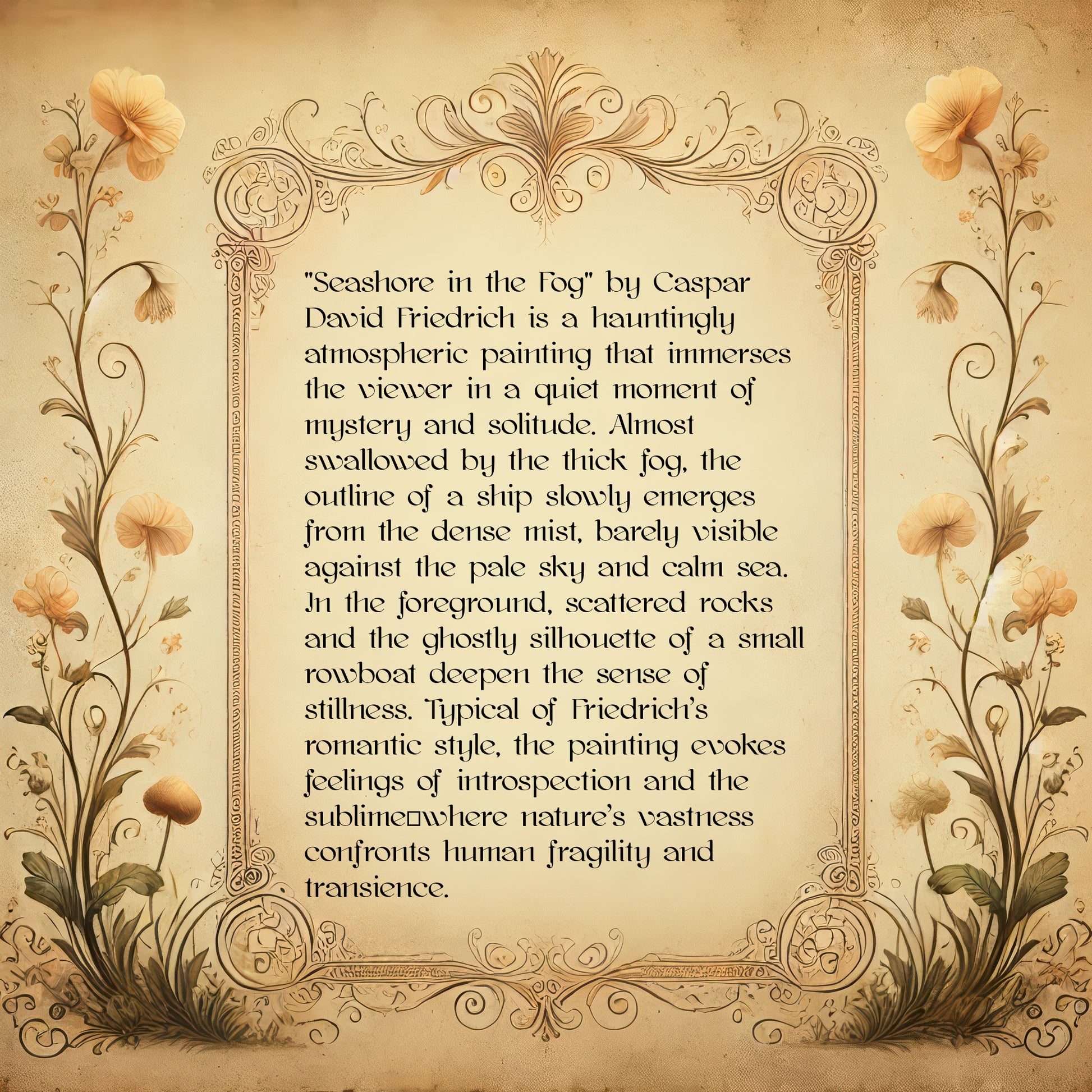 "Seashore in the Fog" by Caspar David Friedrich is a hauntingly atmospheric painting that immerses the viewer in a quiet moment of mystery and solitude. Almost swallowed by the thick fog, the outline of a ship slowly emerges from the dense mist, barely visible against the pale sky and calm sea. In the foreground, scattered rocks and the ghostly silhouette of a small rowboat deepen the sense of stillness. Typical of Friedrich’s romantic style, the painting evokes feelings of introspection and the sublime—where nature’s vastness confronts human fragility and transience.
