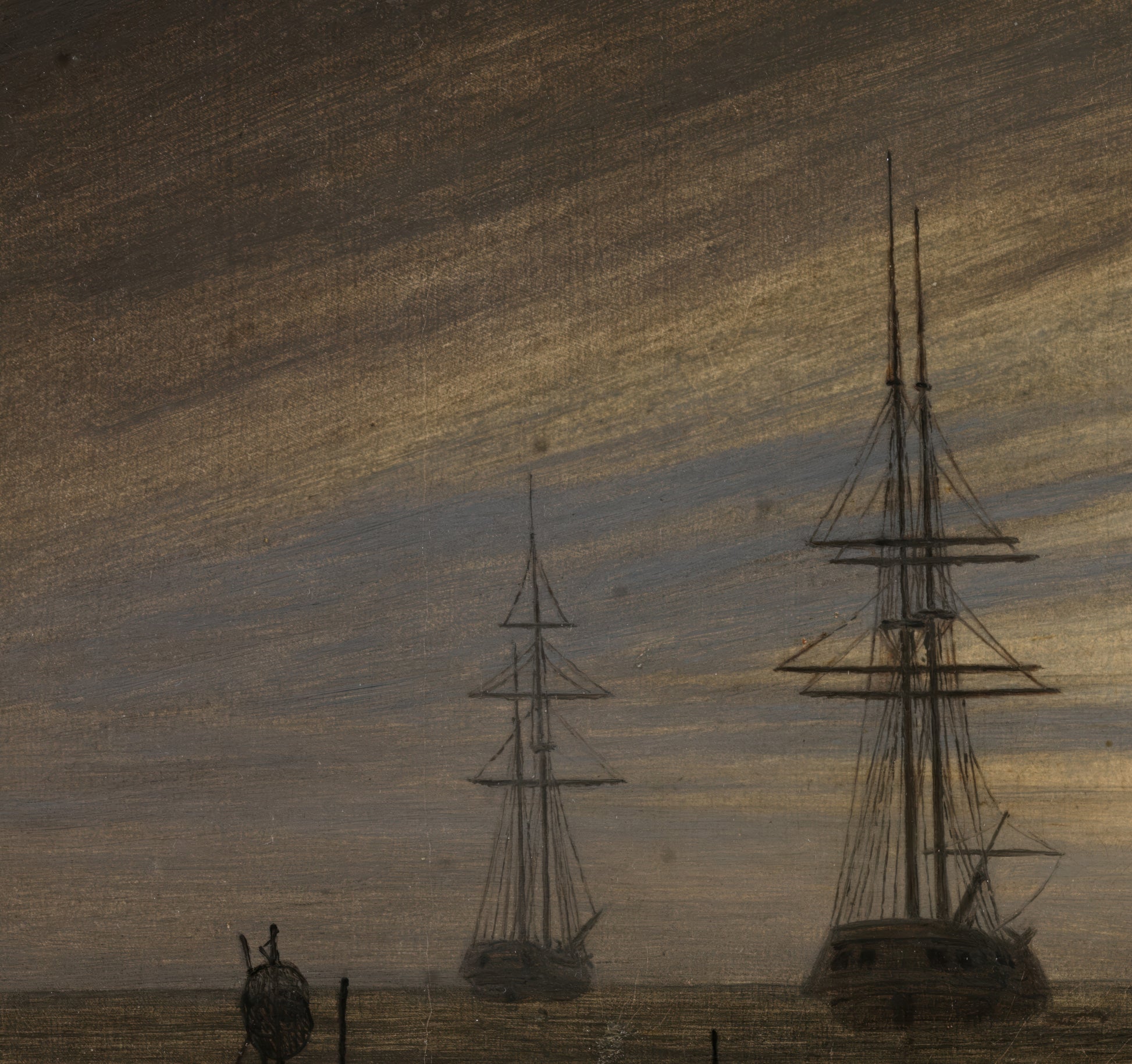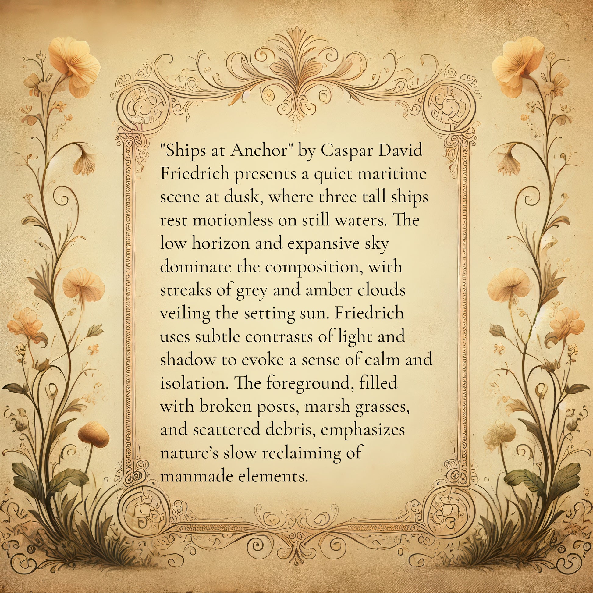 "Ships at Anchor" by Caspar David Friedrich presents a quiet maritime scene at dusk, where three tall ships rest motionless on still waters. The low horizon and expansive sky dominate the composition, with streaks of grey and amber clouds veiling the setting sun. Friedrich uses subtle contrasts of light and shadow to evoke a sense of calm and isolation. The foreground, filled with broken posts, marsh grasses, and scattered debris, emphasizes nature’s slow reclaiming of manmade elements.