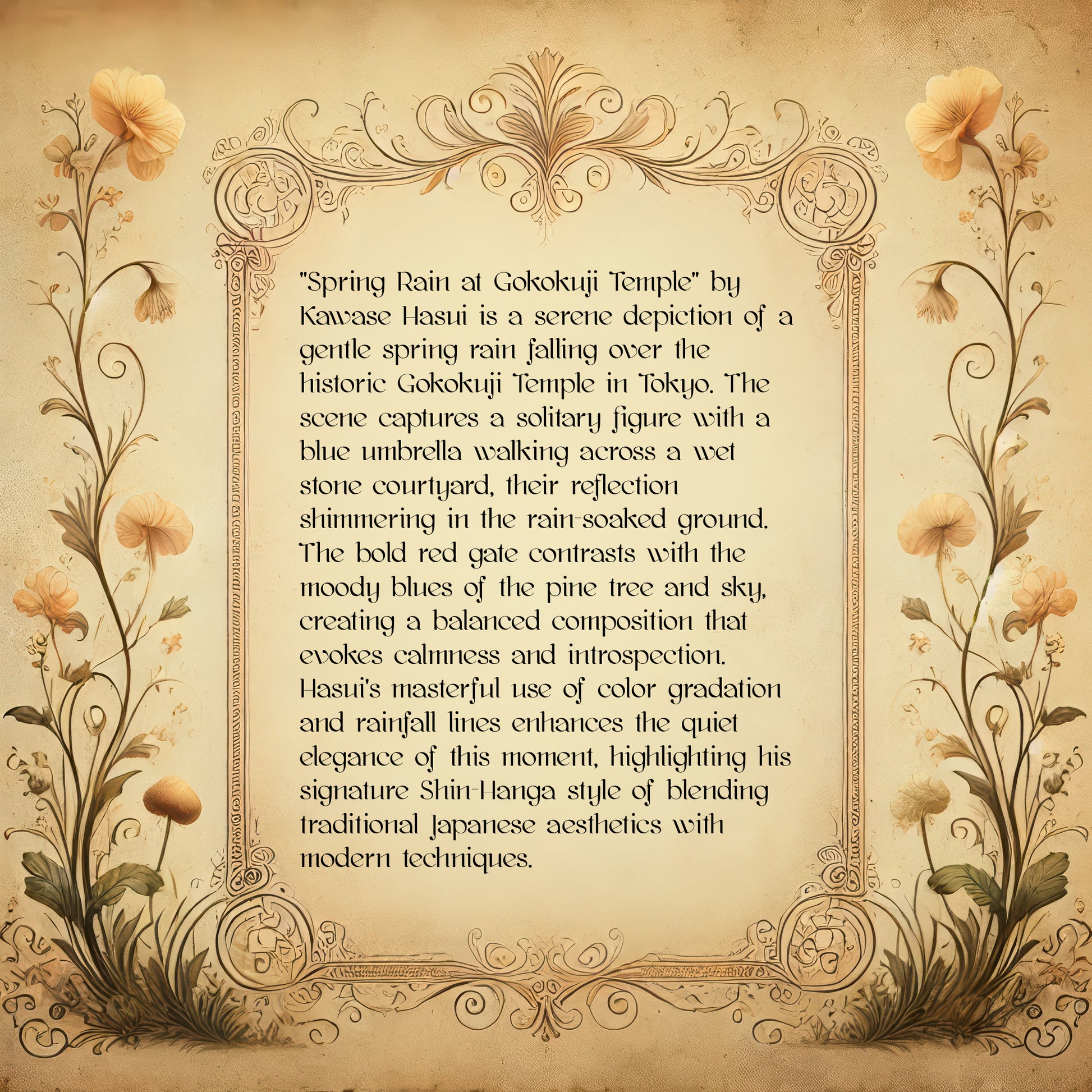 "Spring Rain at Gokokuji Temple" by Kawase Hasui is a serene depiction of a gentle spring rain falling over the historic Gokokuji Temple in Tokyo. The scene captures a solitary figure with a blue umbrella walking across a wet stone courtyard, their reflection shimmering in the rain-soaked ground. The bold red gate contrasts with the moody blues of the pine tree and sky, creating a balanced composition that evokes calmness and introspection. Hasui's masterful use of color gradation and rainfall lines enhances the quiet elegance of this moment, highlighting his signature Shin-Hanga style of blending traditional Japanese aesthetics with modern techniques.