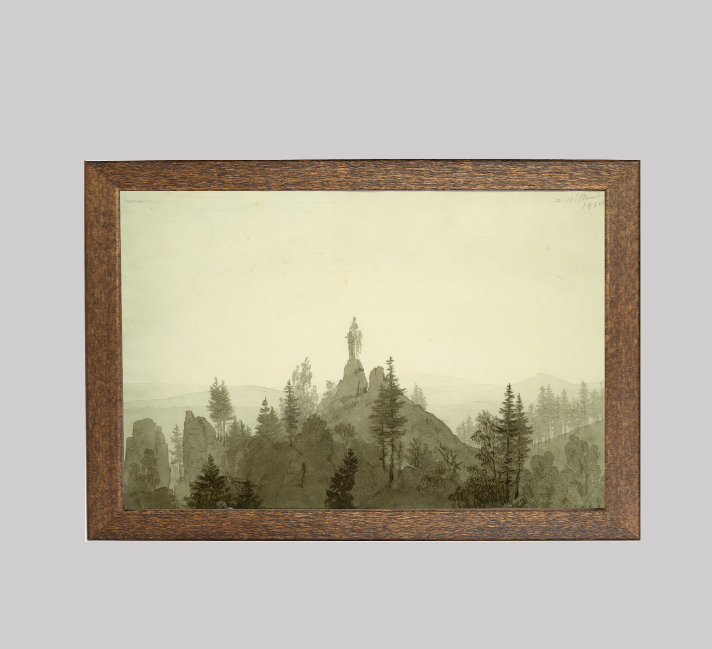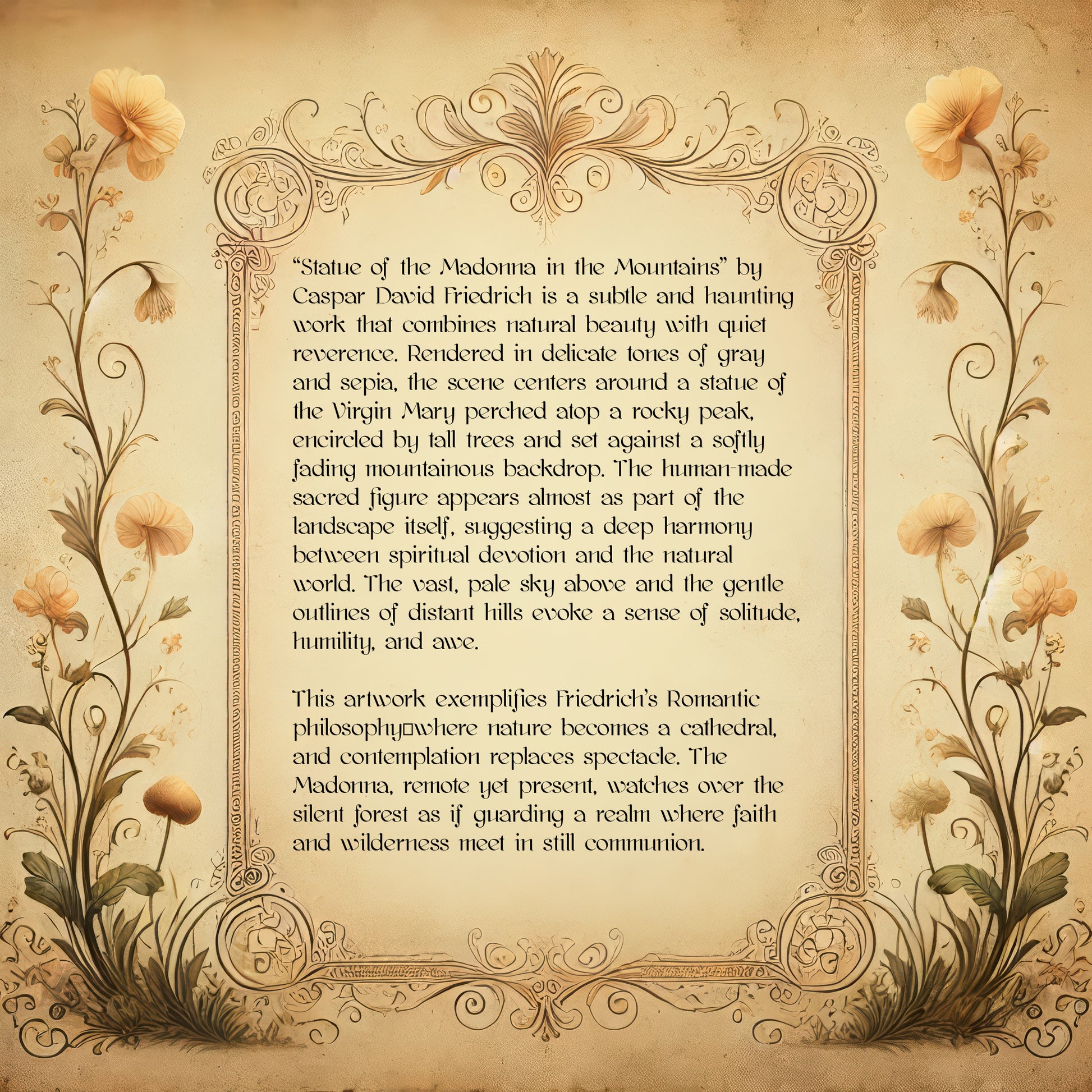 This artwork exemplifies Friedrich’s Romantic philosophy—where nature becomes a cathedral, and contemplation replaces spectacle. The Madonna, remote yet present, watches over the silent forest as if guarding a realm where faith and wilderness meet in still communion. It is not grandeur that moves the viewer here, but the quiet dignity of the sacred elevated by nature’s calm.