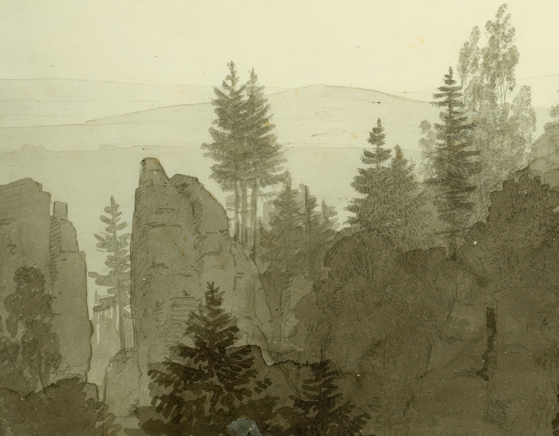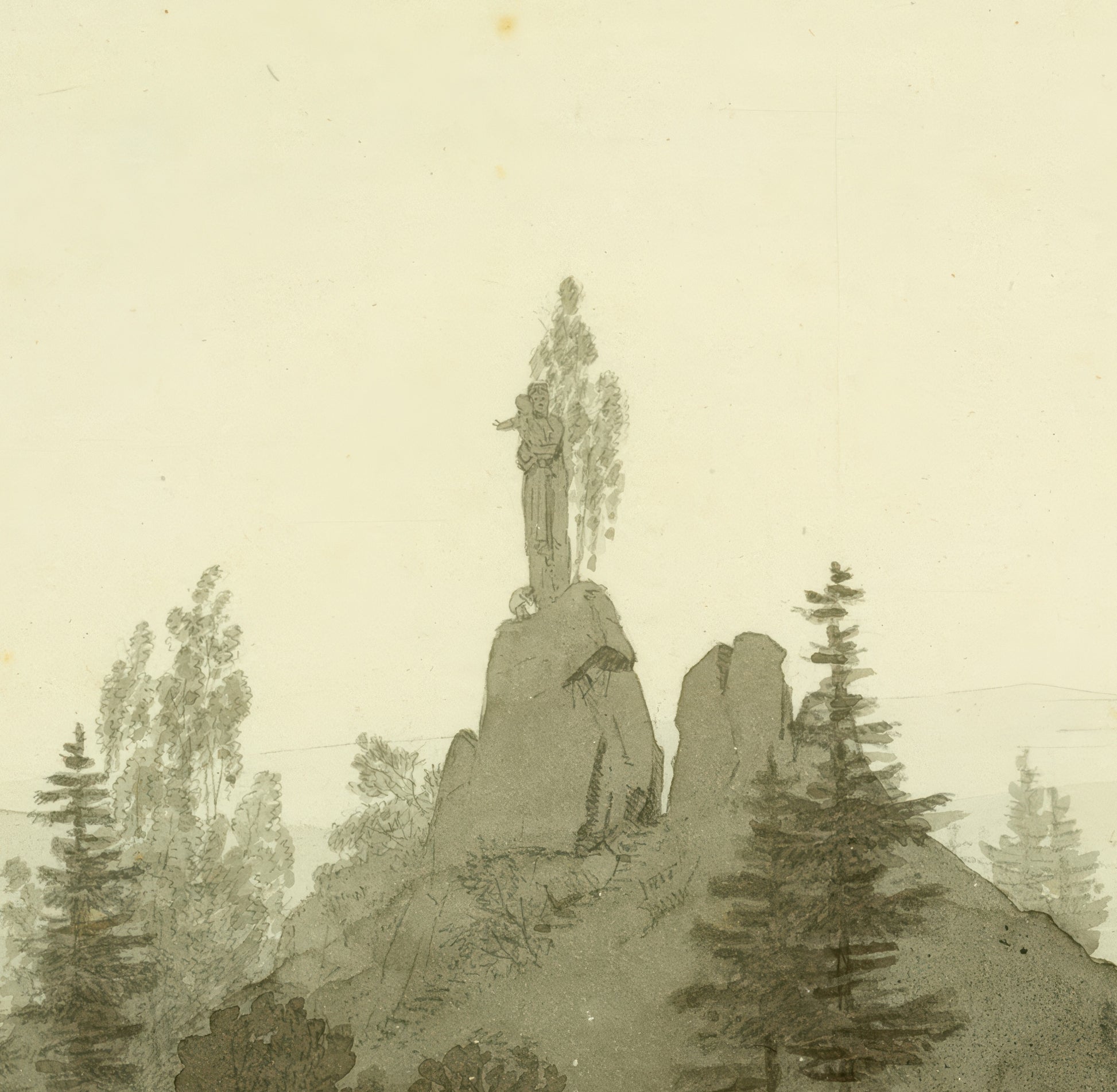 “Statue of the Madonna in the Mountains” by Caspar David Friedrich is a subtle and haunting work that combines natural beauty with quiet reverence. Rendered in delicate tones of gray and sepia, the scene centers around a statue of the Virgin Mary perched atop a rocky peak, encircled by tall trees and set against a softly fading mountainous backdrop. The human-made sacred figure appears almost as part of the landscape itself, suggesting a deep harmony between spiritual devotion and the natural world. The vast, pale sky above and the gentle outlines of distant hills evoke a sense of solitude, humility, and awe.