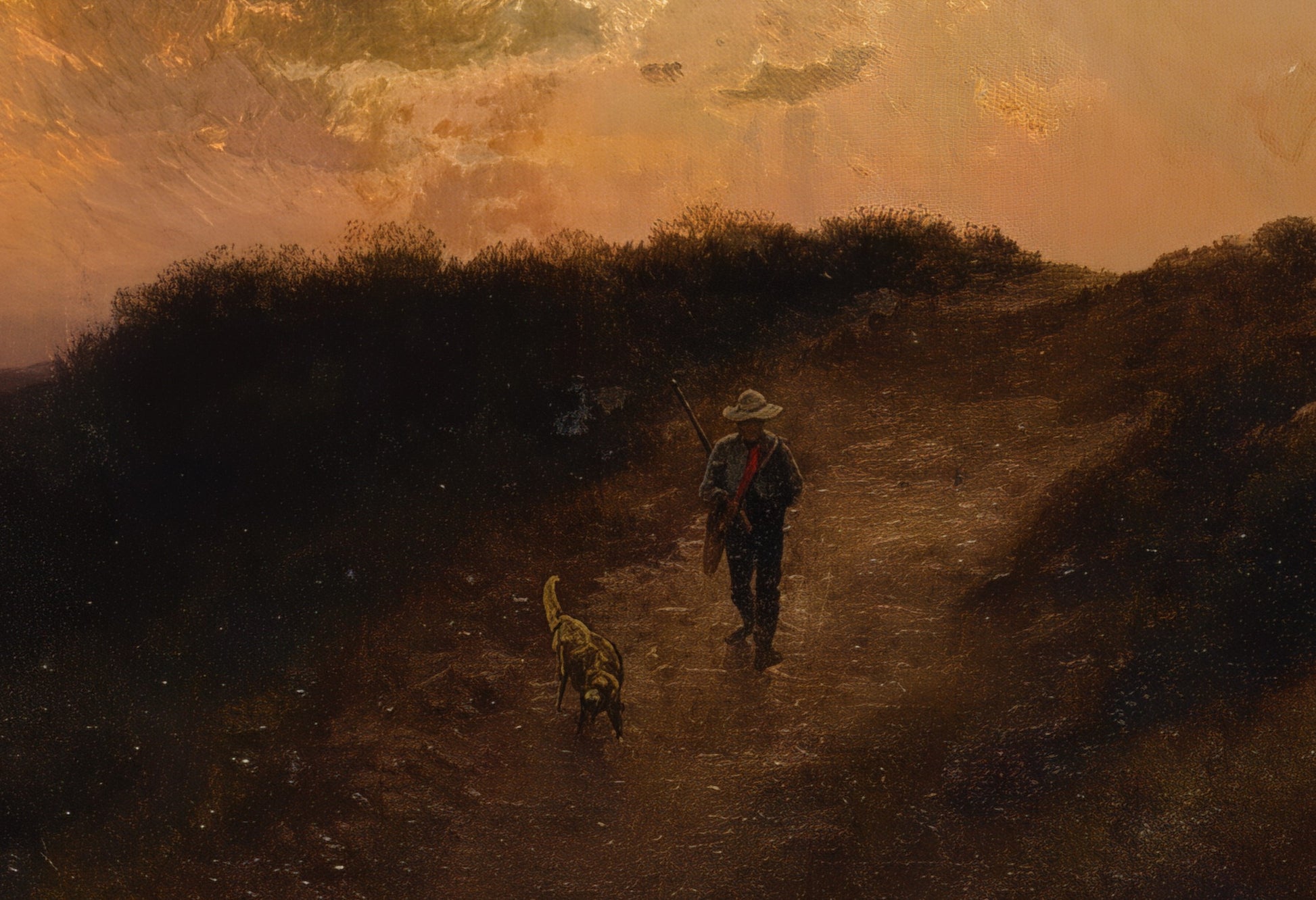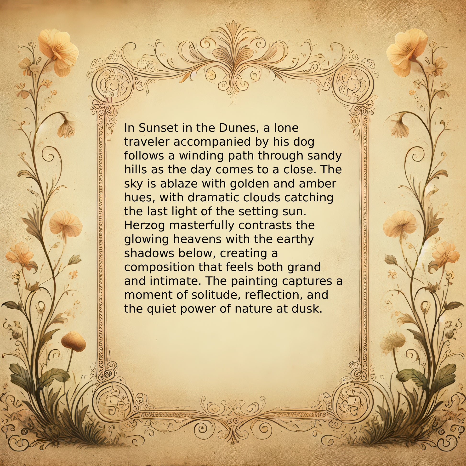 In Sunset in the Dunes, a lone traveler accompanied by his dog follows a winding path through sandy hills as the day comes to a close. The sky is ablaze with golden and amber hues, with dramatic clouds catching the last light of the setting sun. Herzog masterfully contrasts the glowing heavens with the earthy shadows below, creating a composition that feels both grand and intimate. The painting captures a moment of solitude, reflection, and the quiet power of nature at dusk.