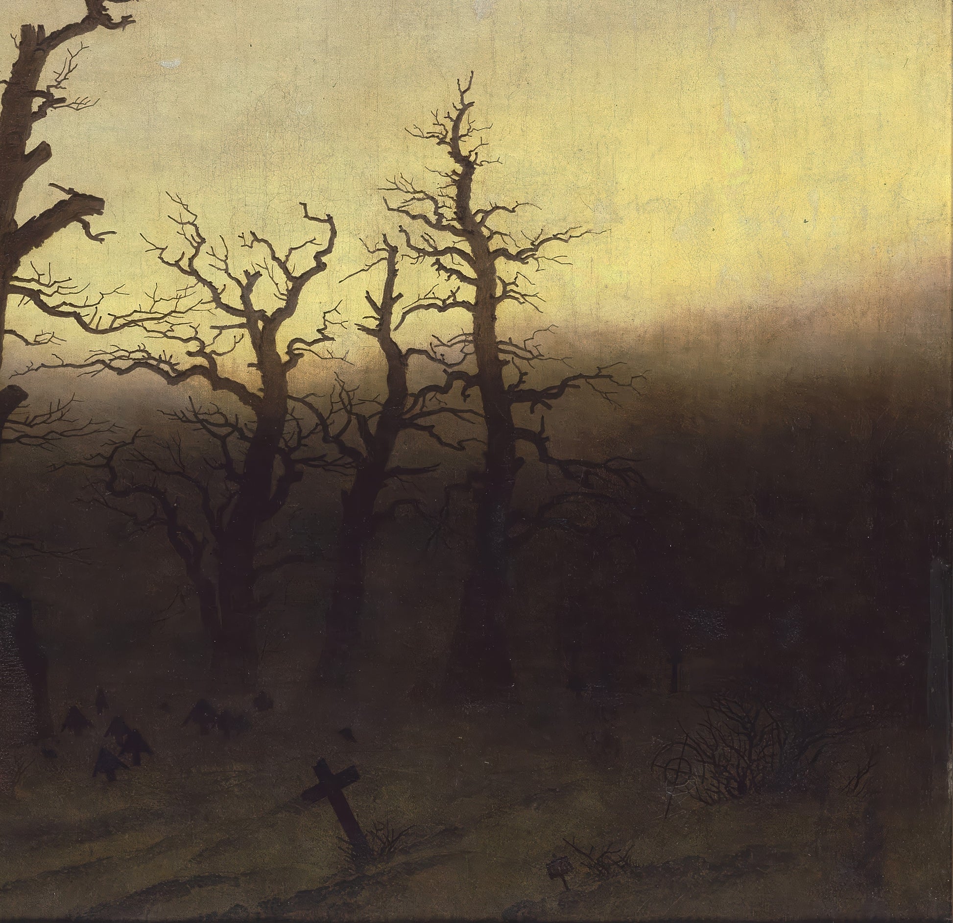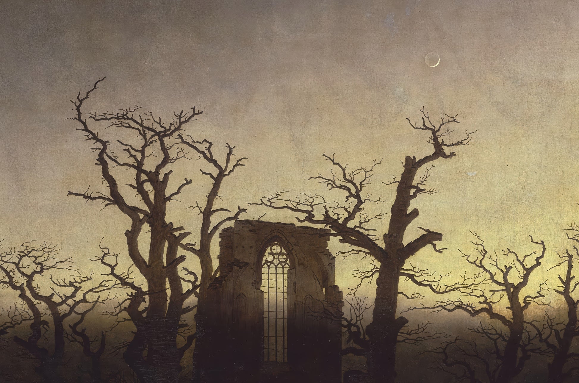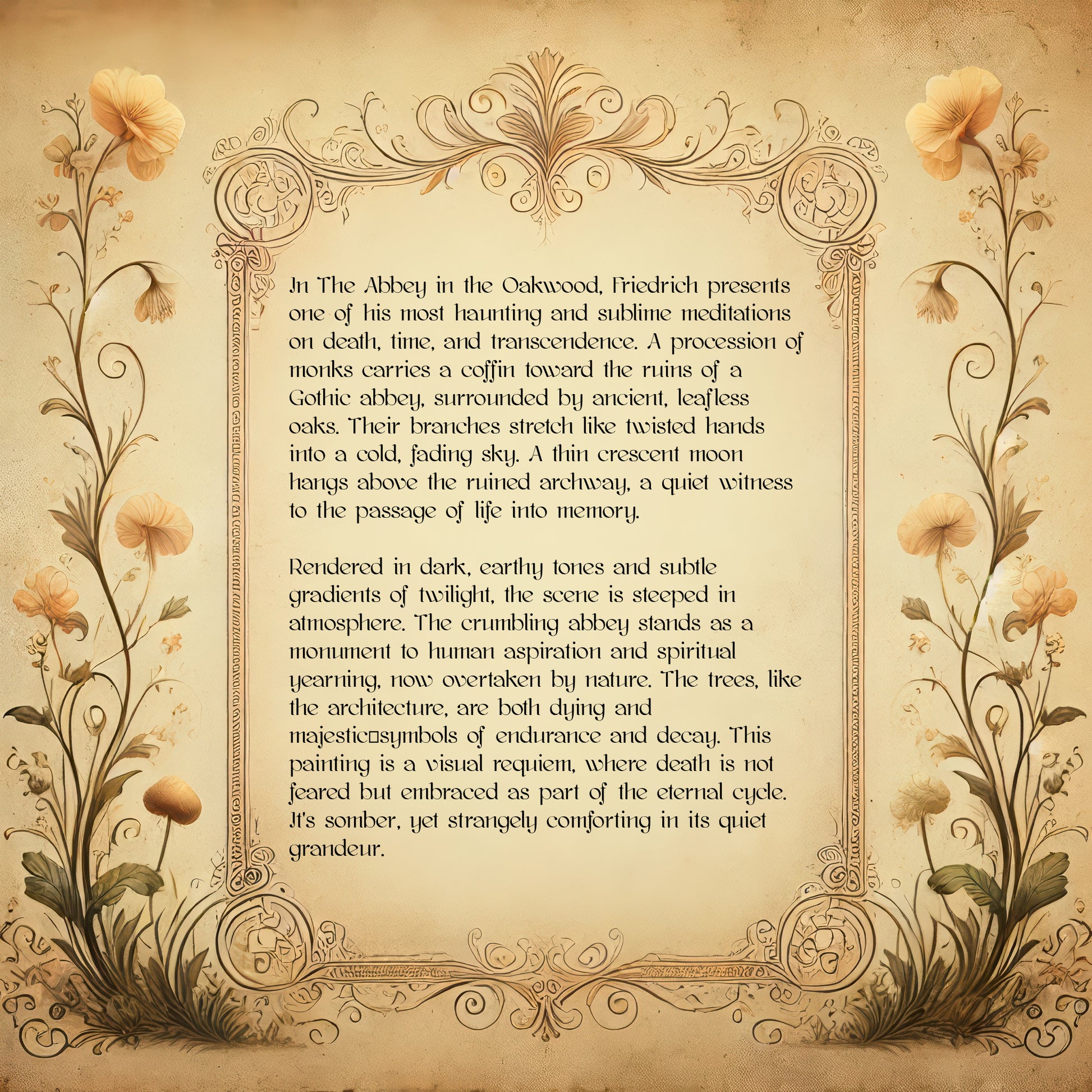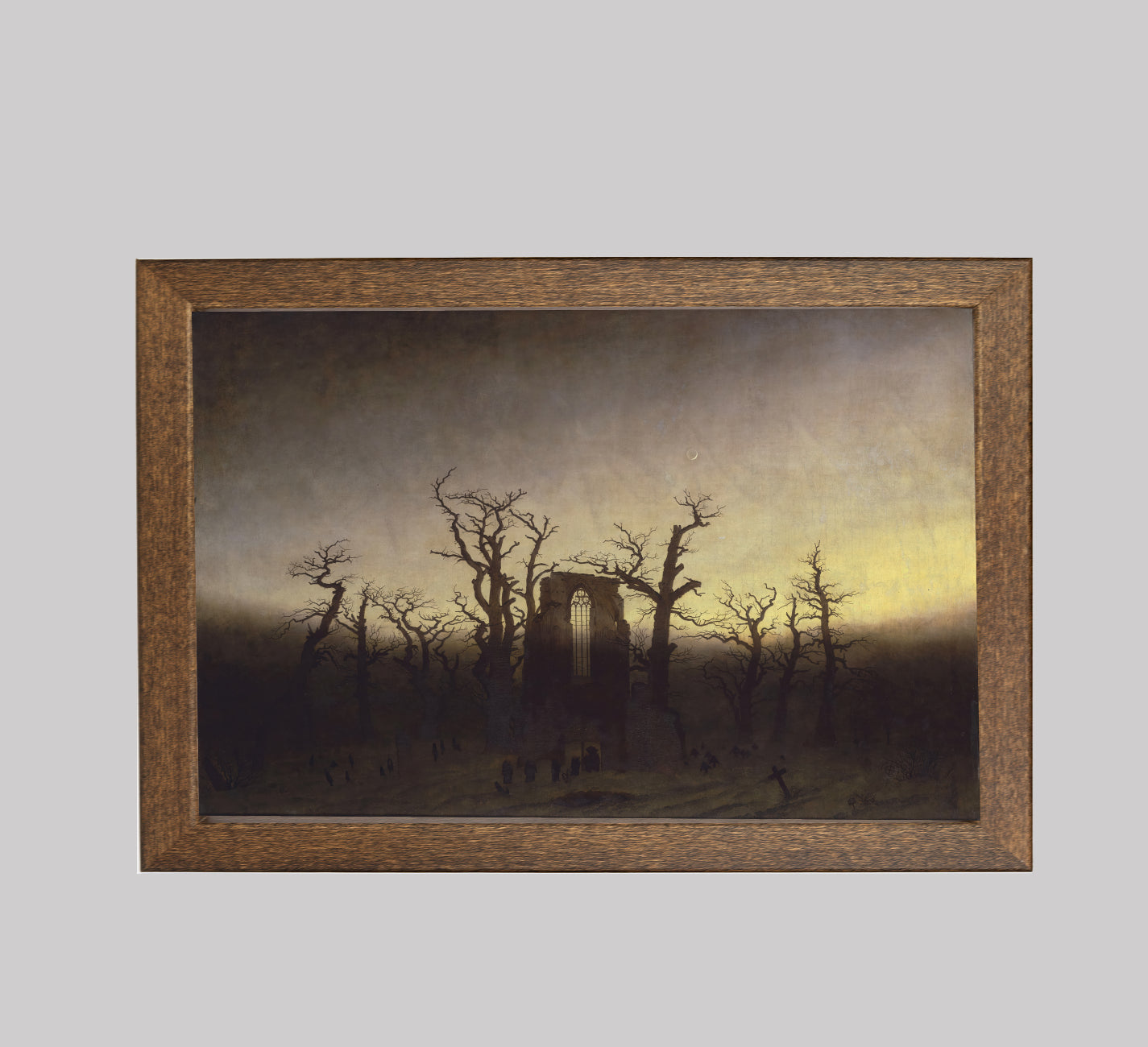 In The Abbey in the Oakwood, Friedrich presents one of his most haunting and sublime meditations on death, time, and transcendence. A procession of monks carries a coffin toward the ruins of a Gothic abbey, surrounded by ancient, leafless oaks. Their branches stretch like twisted hands into a cold, fading sky. A thin crescent moon hangs above the ruined archway, a quiet witness to the passage of life into memory.