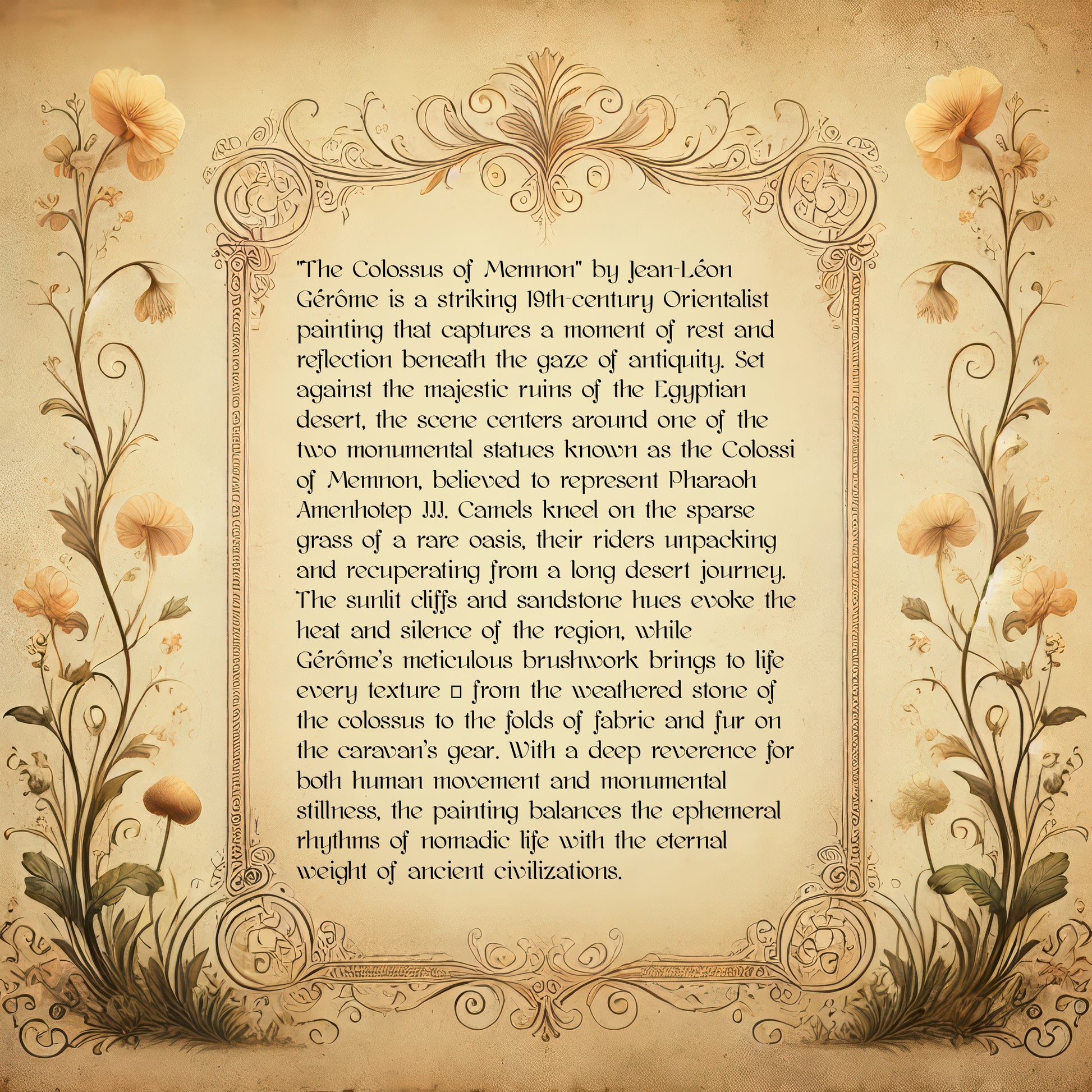 "The Colossus of Memnon" by Jean-Léon Gérôme is a striking 19th-century Orientalist painting that captures a moment of rest and reflection beneath the gaze of antiquity. Set against the majestic ruins of the Egyptian desert, the scene centers around one of the two monumental statues known as the Colossi of Memnon, believed to represent Pharaoh Amenhotep III. Camels kneel on the sparse grass of a rare oasis, their riders unpacking and recuperating from a long desert journey. The sunlit cliffs and sandstone hues evoke the heat and silence of the region, while Gérôme’s meticulous brushwork brings to life every texture — from the weathered stone of the colossus to the folds of fabric and fur on the caravan’s gear. With a deep reverence for both human movement and monumental stillness, the painting balances the ephemeral rhythms of nomadic life with the eternal weight of ancient civilizations.