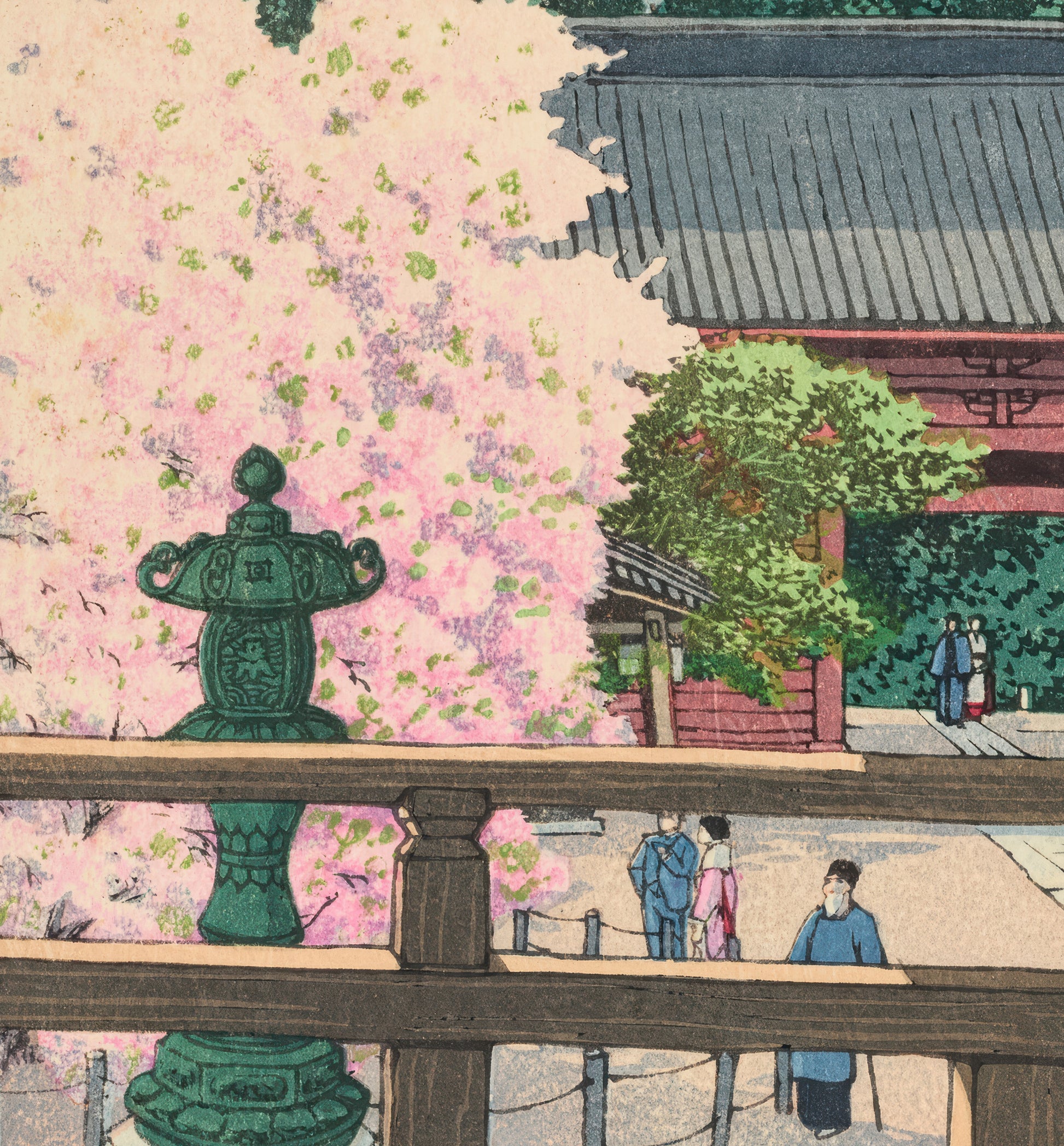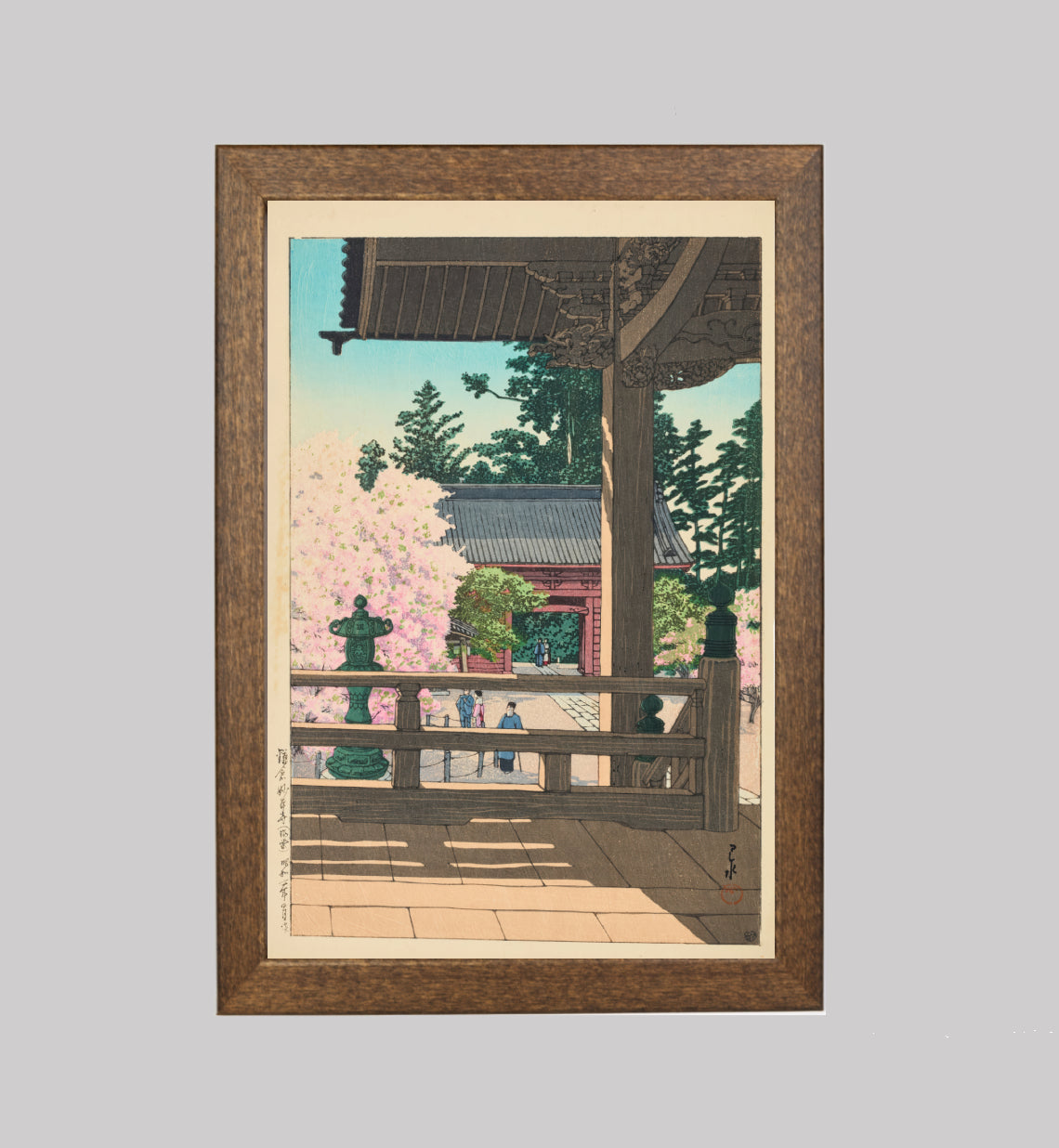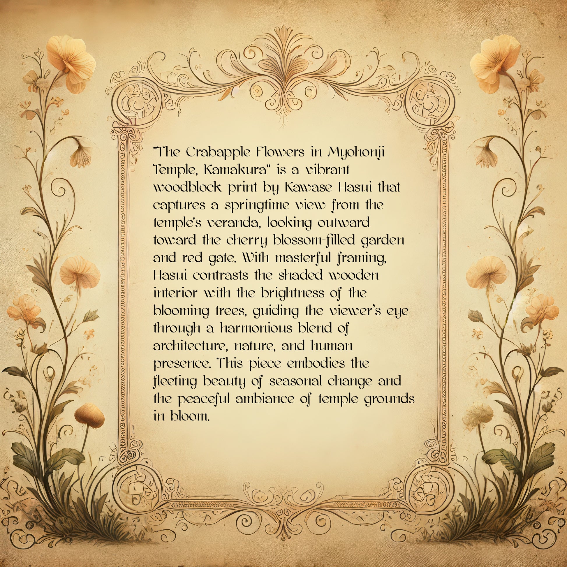"The Crabapple Flowers in Myohonji Temple, Kamakura" is a vibrant woodblock print by Kawase Hasui that captures a springtime view from the temple's veranda, looking outward toward the cherry blossom-filled garden and red gate. With masterful framing, Hasui contrasts the shaded wooden interior with the brightness of the blooming trees, guiding the viewer’s eye through a harmonious blend of architecture, nature, and human presence. This piece embodies the fleeting beauty of seasonal change and the peaceful ambiance of temple grounds in bloom.