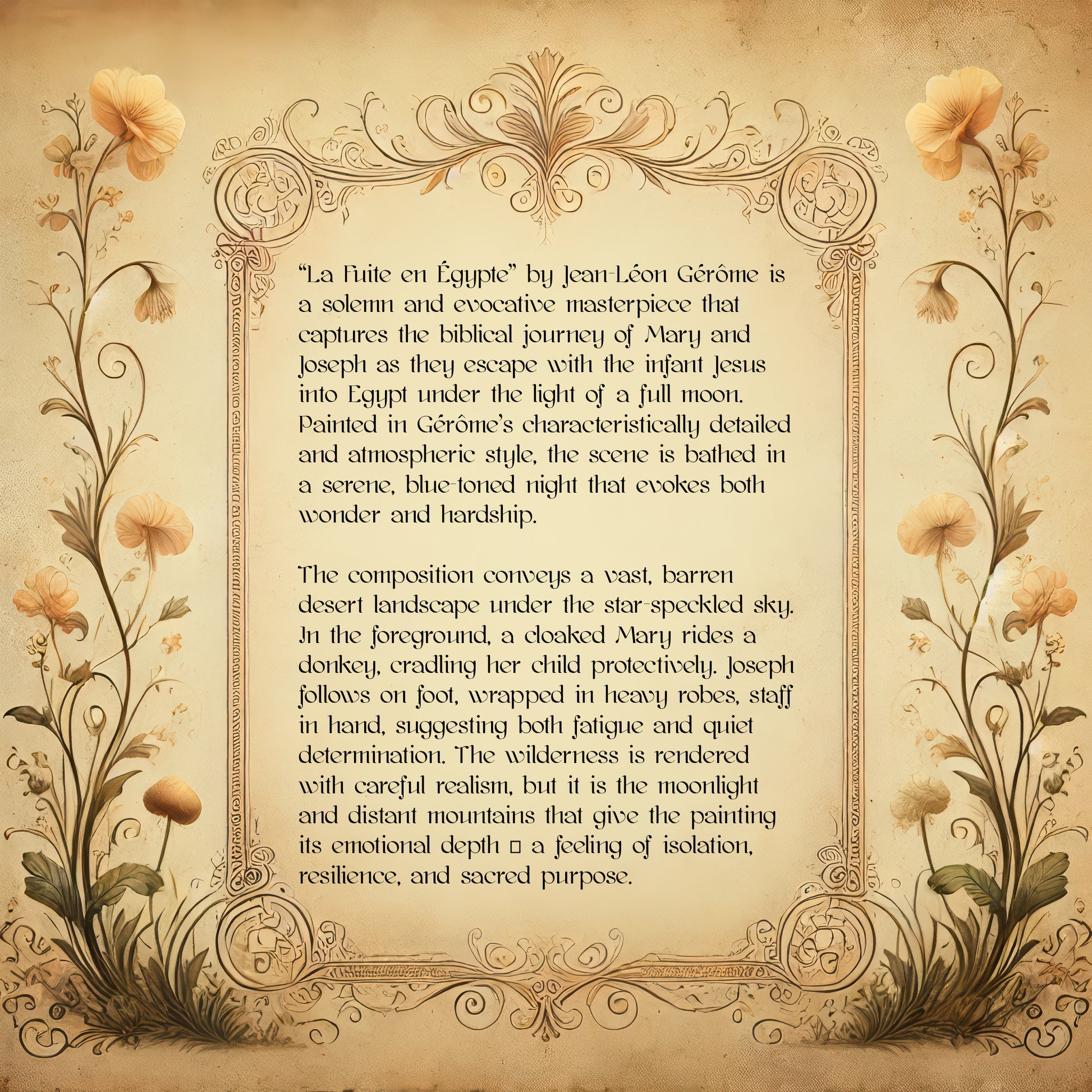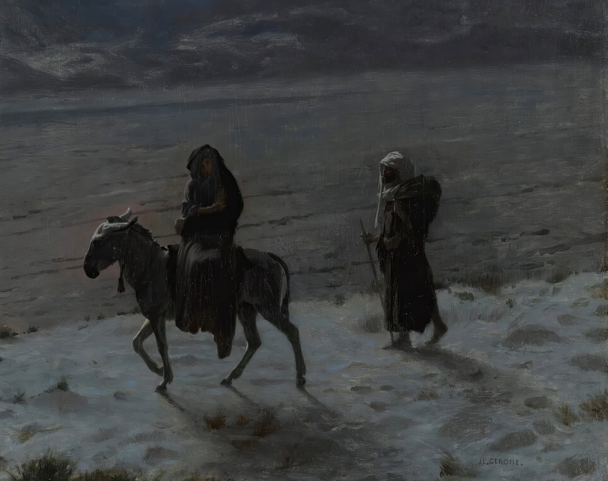 “The Flight into Egypt” by Jean-Léon Gérôme is a solemn and evocative masterpiece that captures the biblical journey of Mary and Joseph as they escape with the infant Jesus into Egypt under the light of a full moon. Painted in Gérôme’s characteristically detailed and atmospheric style, the scene is bathed in a serene, blue-toned night that evokes both wonder and hardship.