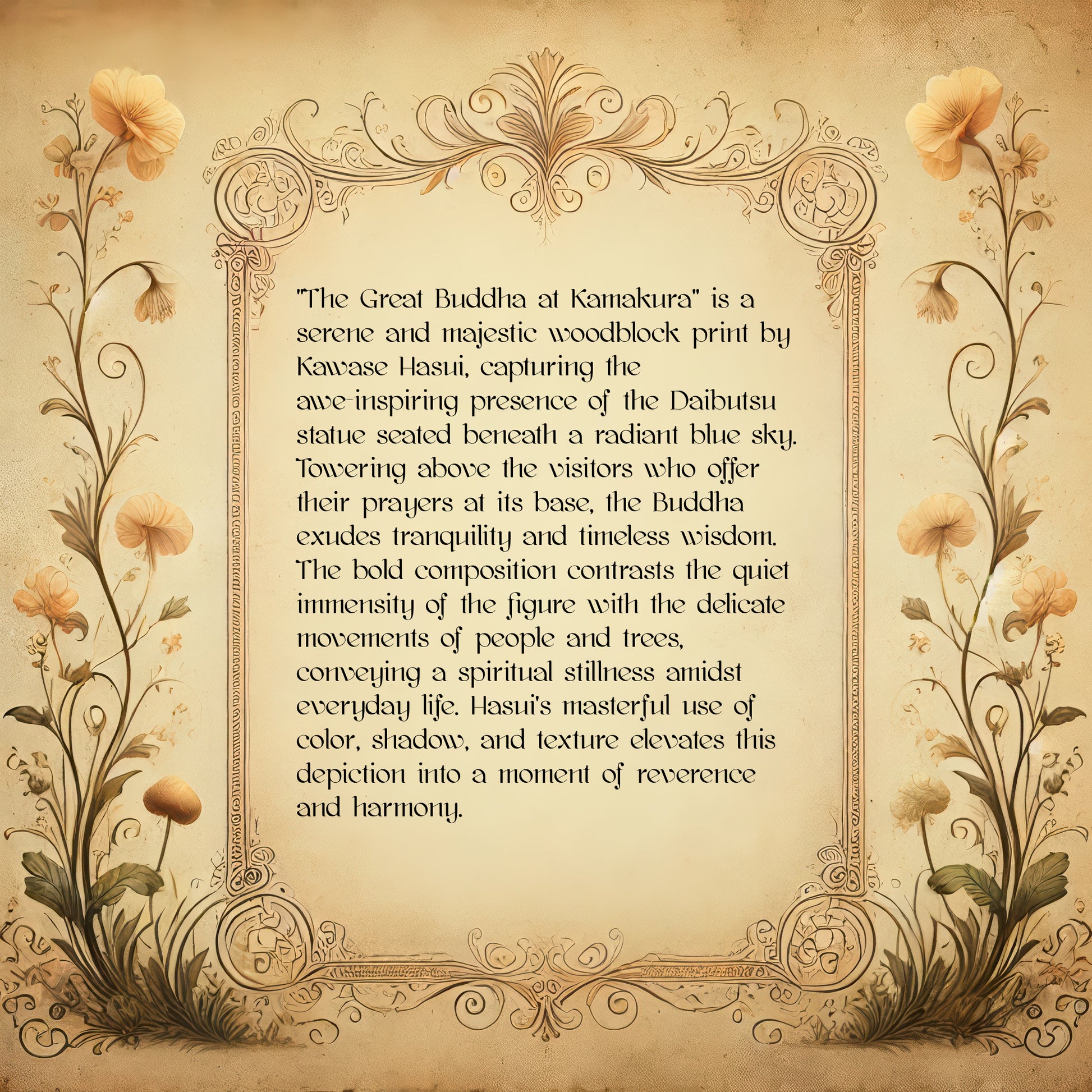"The Great Buddha at Kamakura" is a serene and majestic woodblock print by Kawase Hasui, capturing the awe-inspiring presence of the Daibutsu statue seated beneath a radiant blue sky. Towering above the visitors who offer their prayers at its base, the Buddha exudes tranquility and timeless wisdom. The bold composition contrasts the quiet immensity of the figure with the delicate movements of people and trees, conveying a spiritual stillness amidst everyday life. Hasui's masterful use of color, shadow, and texture elevates this depiction into a moment of reverence and harmony.