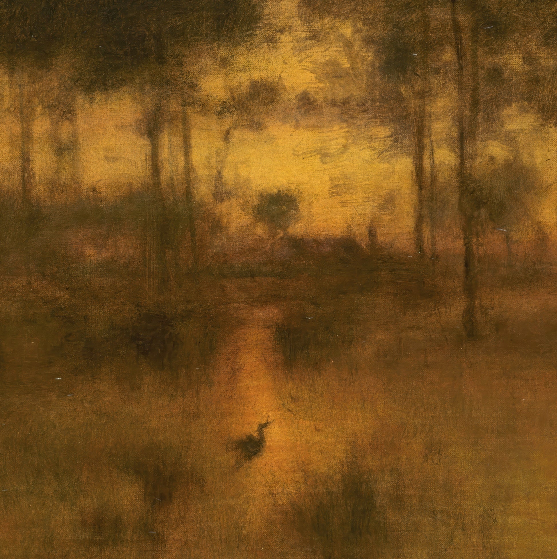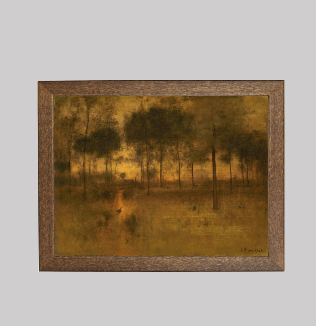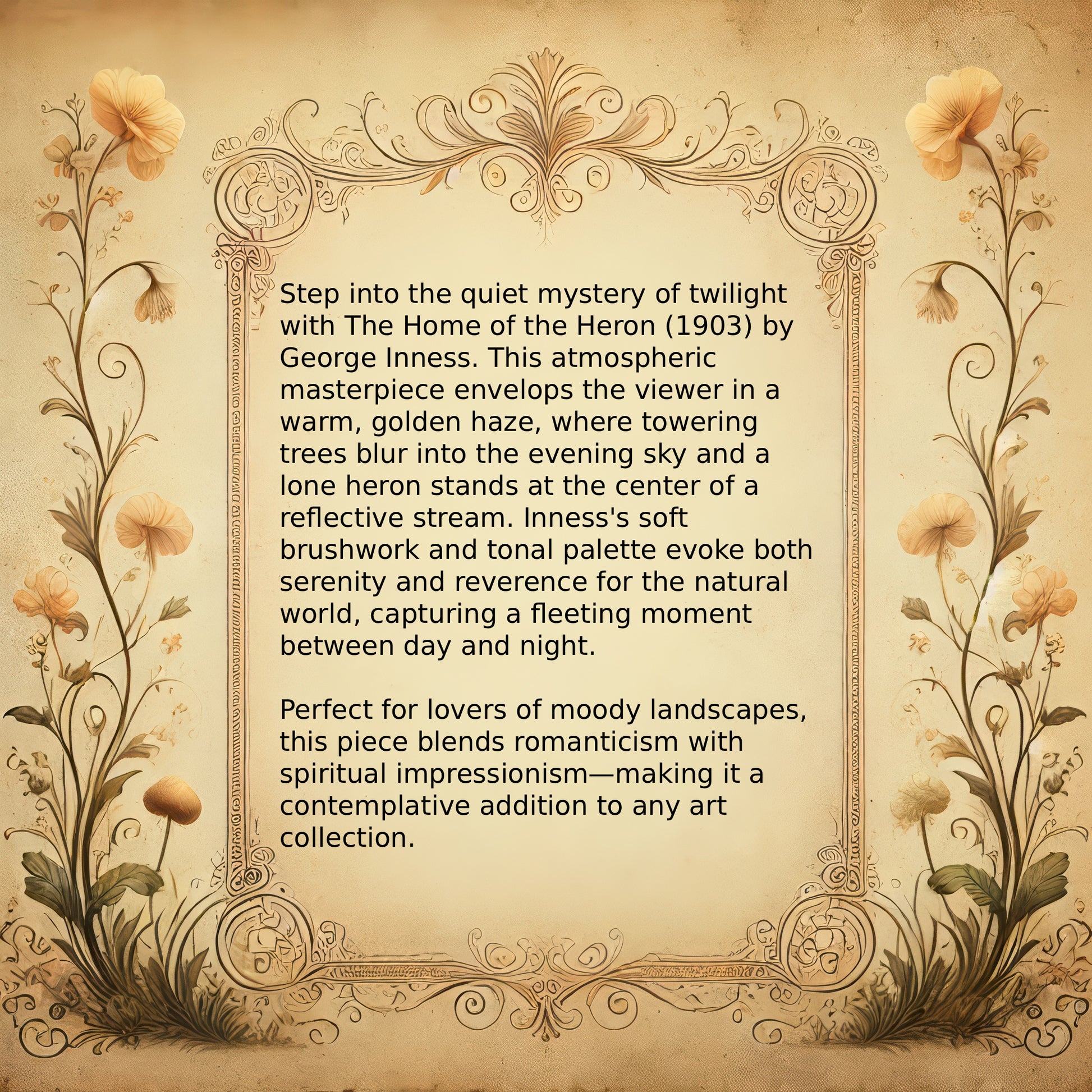 Step into the quiet mystery of twilight with The Home of the Heron (1903) by George Inness. This atmospheric masterpiece envelops the viewer in a warm, golden haze, where towering trees blur into the evening sky and a lone heron stands at the center of a reflective stream. Inness's soft brushwork and tonal palette evoke both serenity and reverence for the natural world, capturing a fleeting moment between day and night.