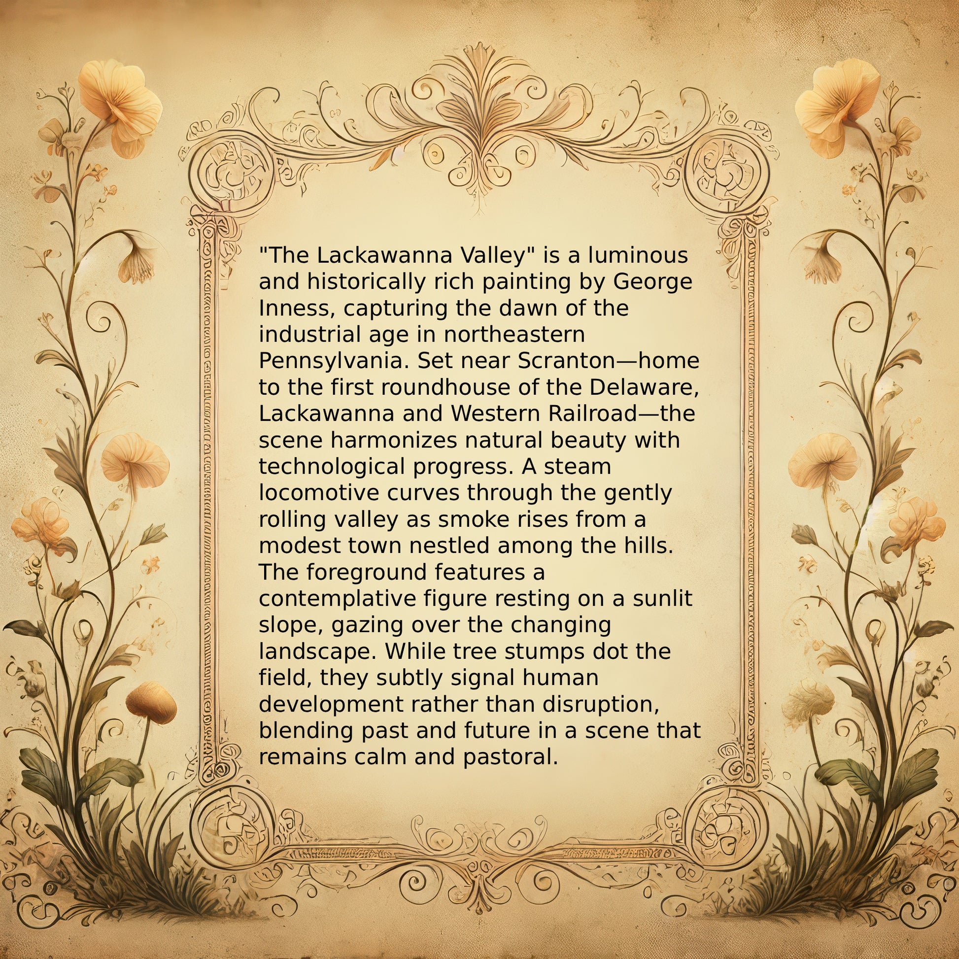 "The Lackawanna Valley" is a luminous and historically rich painting by George Inness, capturing the dawn of the industrial age in northeastern Pennsylvania. Set near Scranton—home to the first roundhouse of the Delaware, Lackawanna and Western Railroad—the scene harmonizes natural beauty with technological progress. A steam locomotive curves through the gently rolling valley as smoke rises from a modest town nestled among the hills. The foreground features a contemplative figure resting on a sunlit slope, gazing over the changing landscape. While tree stumps dot the field, they subtly signal human development rather than disruption, blending past and future in a scene that remains calm and pastoral.