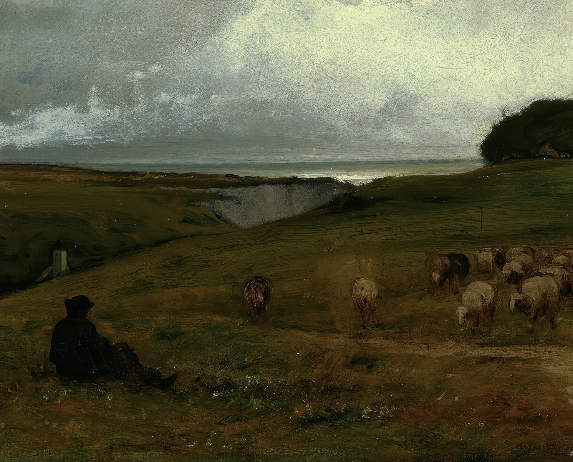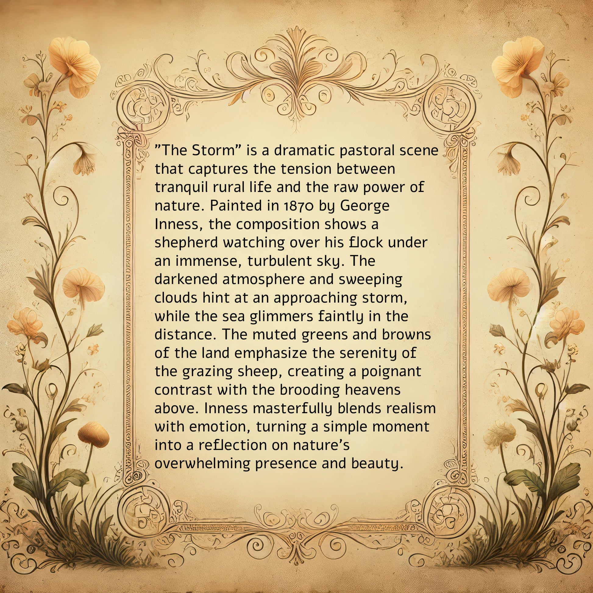 "The Storm" is a dramatic pastoral scene that captures the tension between tranquil rural life and the raw power of nature. Painted in 1870 by George Inness, the composition shows a shepherd watching over his flock under an immense, turbulent sky. The darkened atmosphere and sweeping clouds hint at an approaching storm, while the sea glimmers faintly in the distance. The muted greens and browns of the land emphasize the serenity of the grazing sheep, creating a poignant contrast with the brooding heavens above. Inness masterfully blends realism with emotion, turning a simple moment into a reflection on nature’s overwhelming presence and beauty.