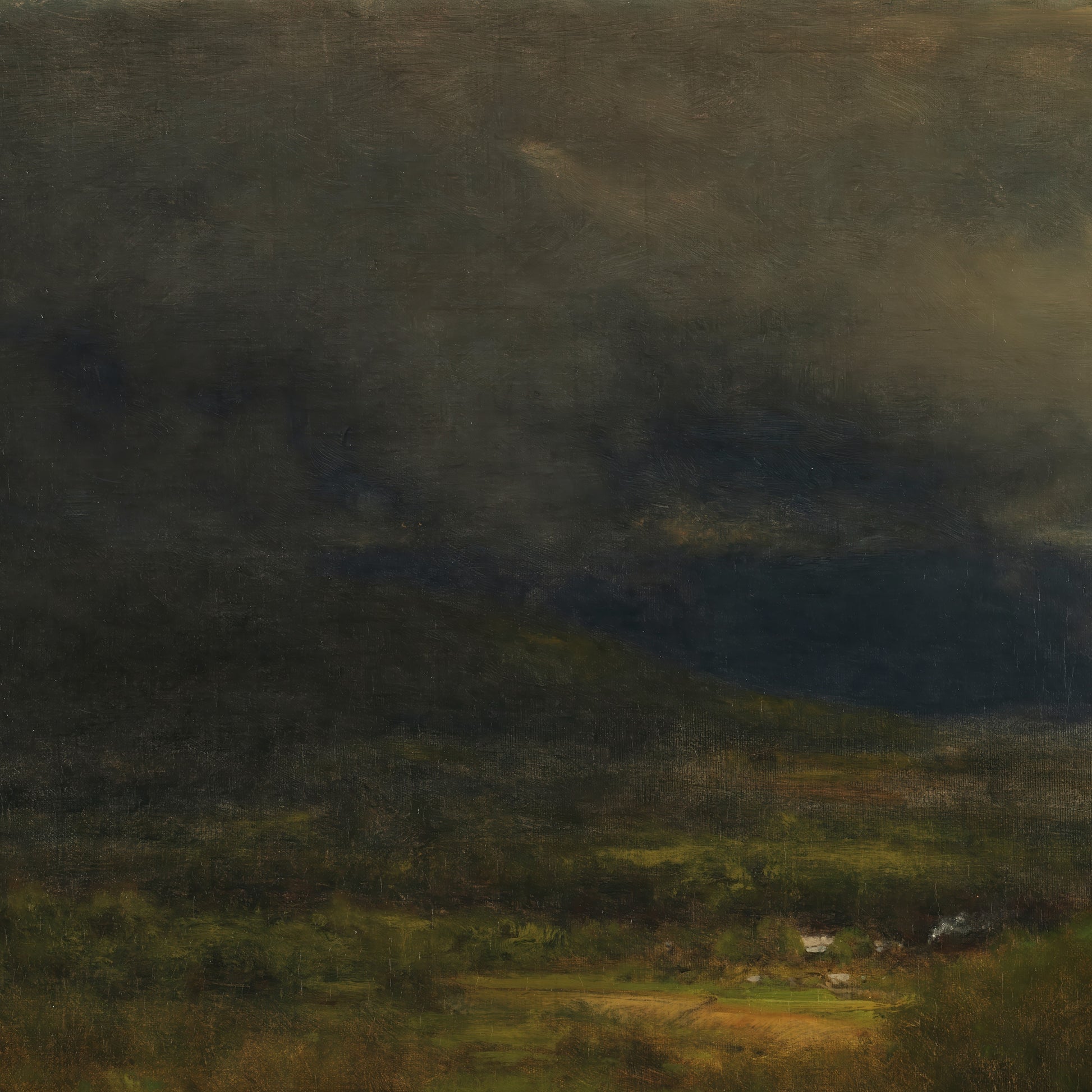 "The Wheat Field" captures the quiet labor of rural life under a moody, brooding sky. Painted with deep contrasts, George Inness sets the golden field against looming storm clouds, creating a powerful emotional tension. Scattered workers stoop in the foreground, dwarfed by the vastness of the land and sky, while trees and a distant farmhouse barely emerge from the horizon’s shadow.
