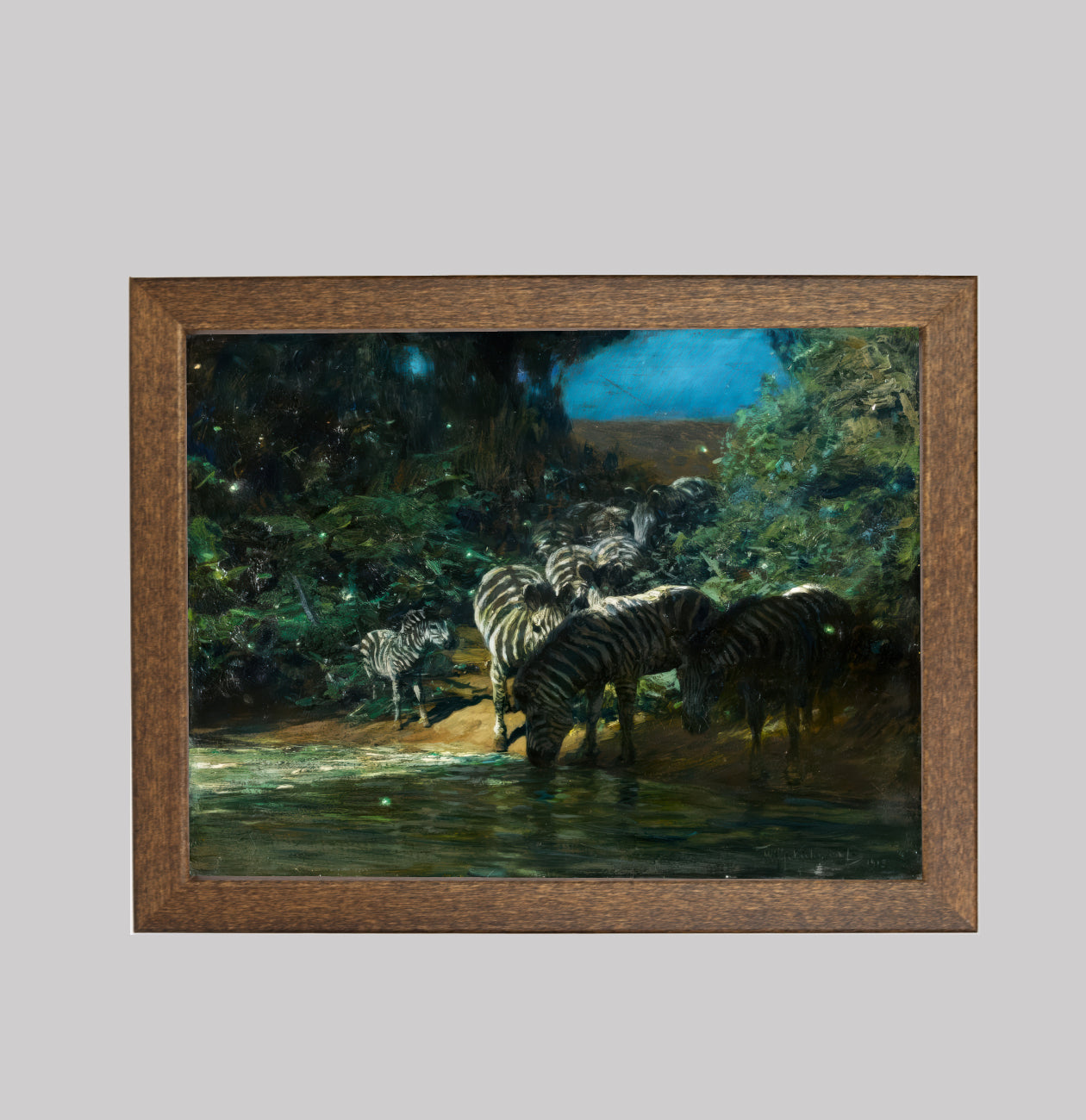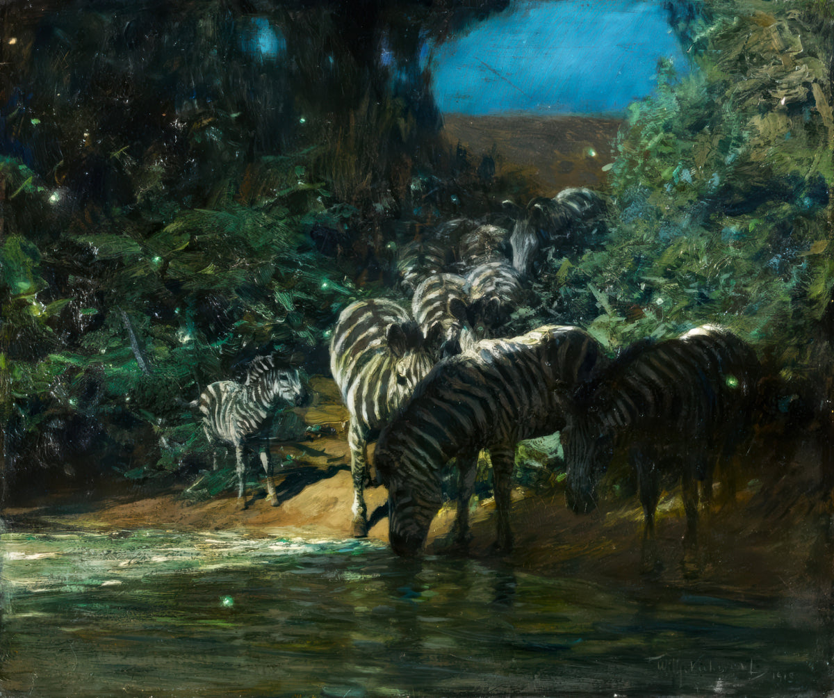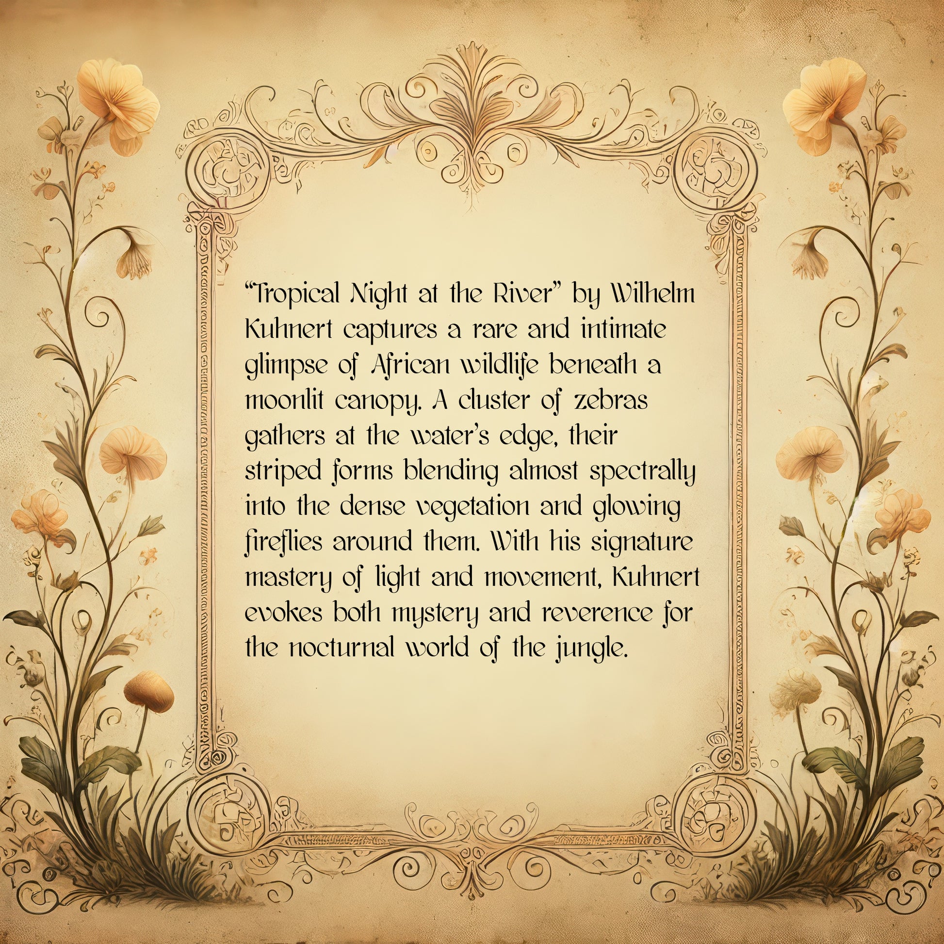 “Tropical Night at the River” by Wilhelm Kuhnert captures a rare and intimate glimpse of African wildlife beneath a moonlit canopy. A cluster of zebras gathers at the water’s edge, their striped forms blending almost spectrally into the dense vegetation and glowing fireflies around them. With his signature mastery of light and movement, Kuhnert evokes both mystery and reverence for the nocturnal world of the jungle.