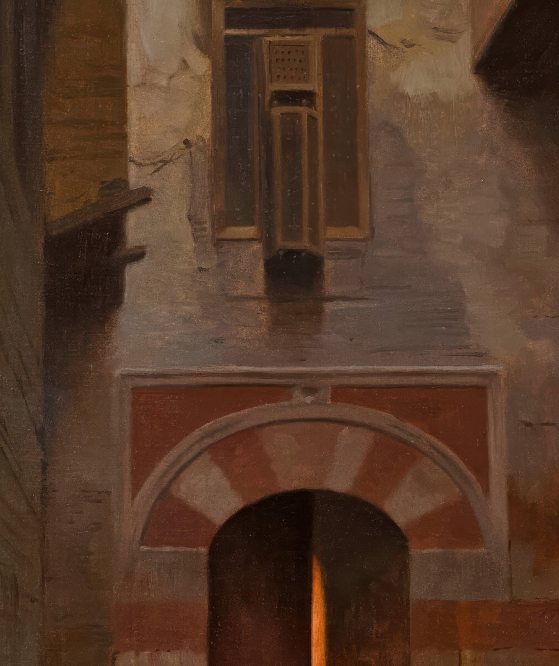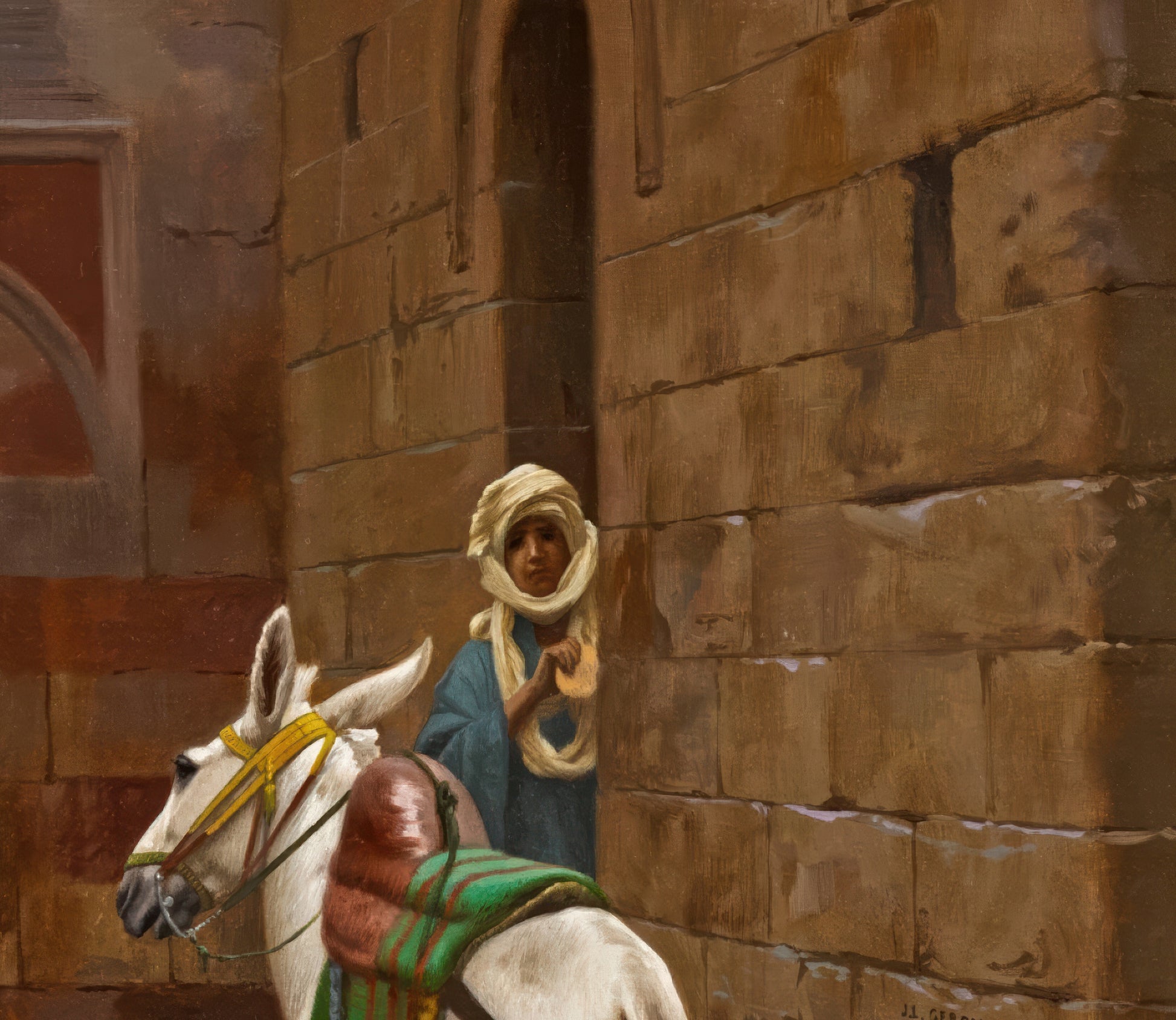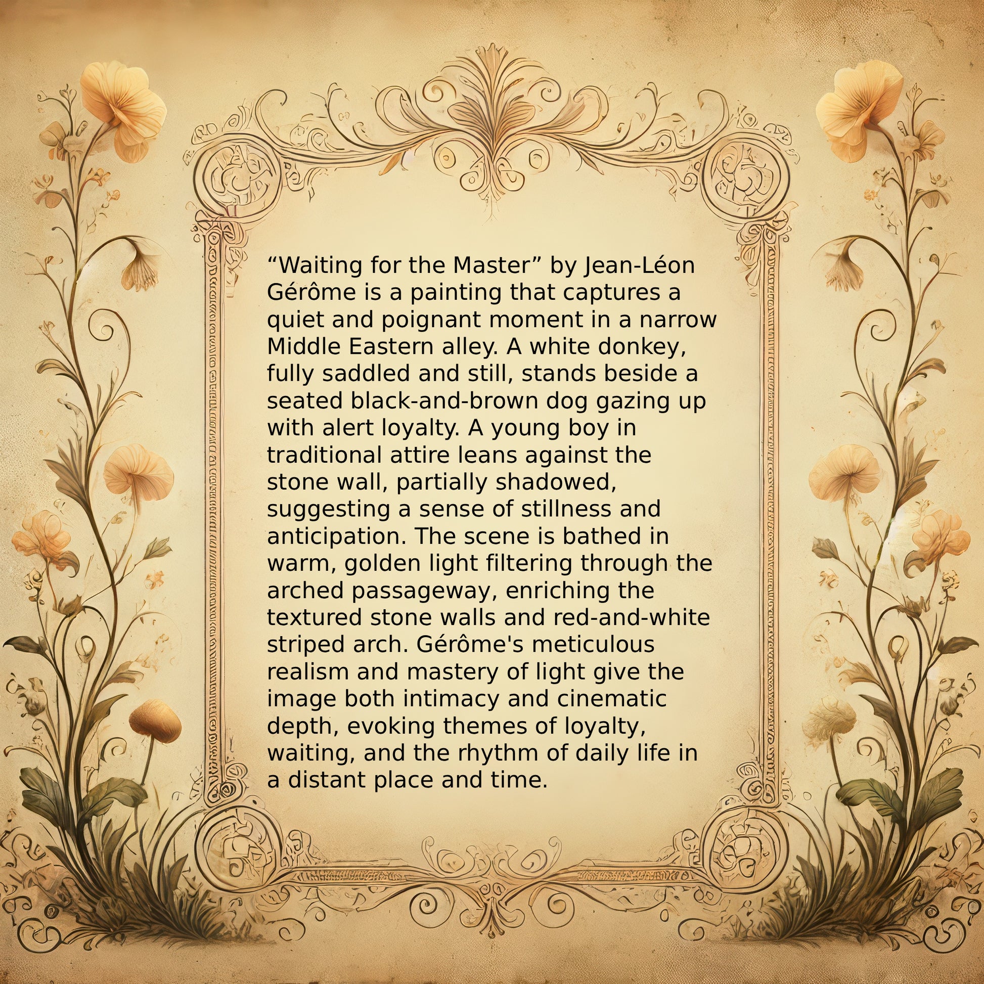“Waiting for the Master” by Jean-Léon Gérôme is a painting that captures a quiet and poignant moment in a narrow Middle Eastern alley. A white donkey, fully saddled and still, stands beside a seated black-and-brown dog gazing up with alert loyalty. A young boy in traditional attire leans against the stone wall, partially shadowed, suggesting a sense of stillness and anticipation. The scene is bathed in warm, golden light filtering through the arched passageway, enriching the textured stone walls and red-and-white striped arch. Gérôme's meticulous realism and mastery of light give the image both intimacy and cinematic depth, evoking themes of loyalty, waiting, and the rhythm of daily life in a distant place and time.