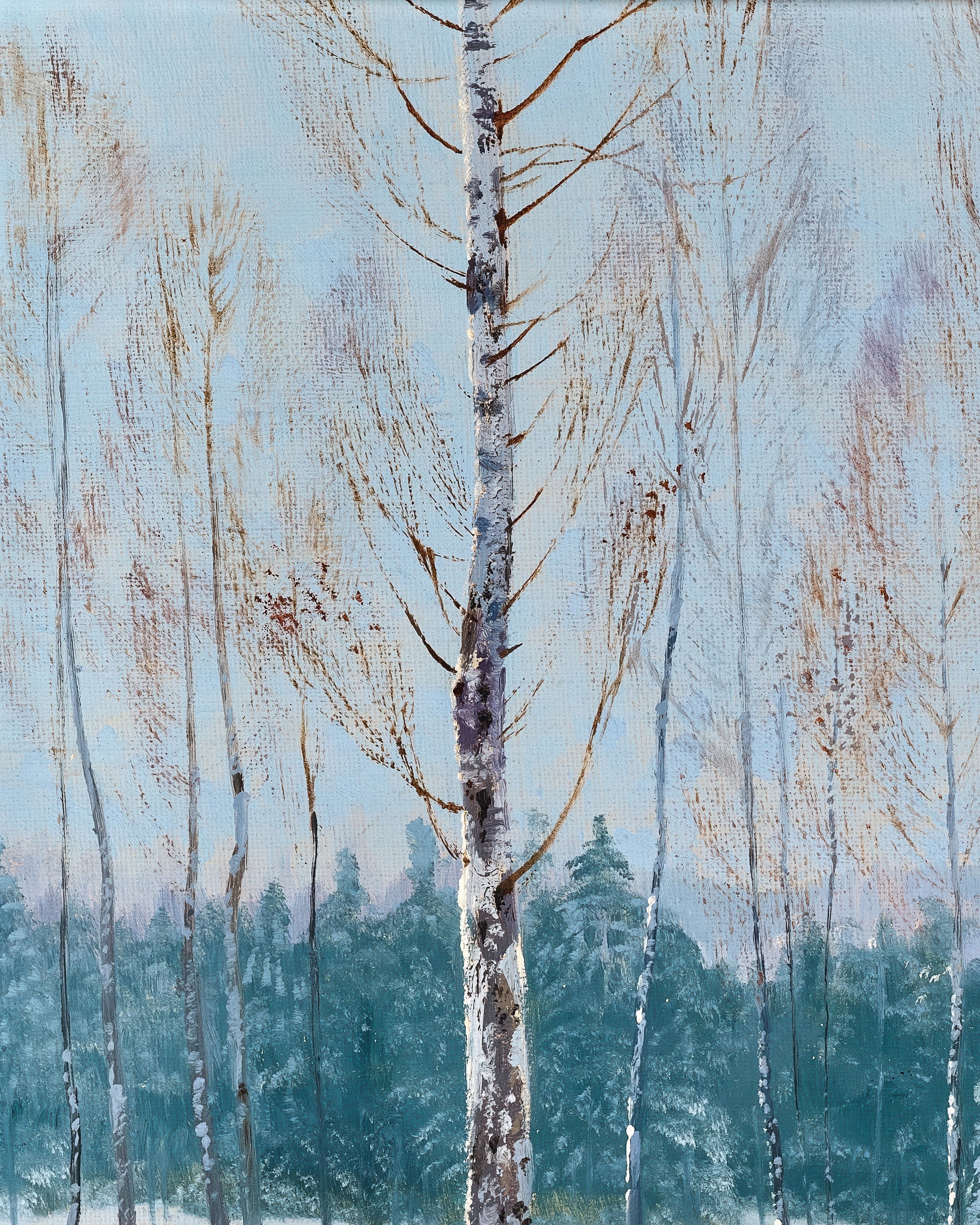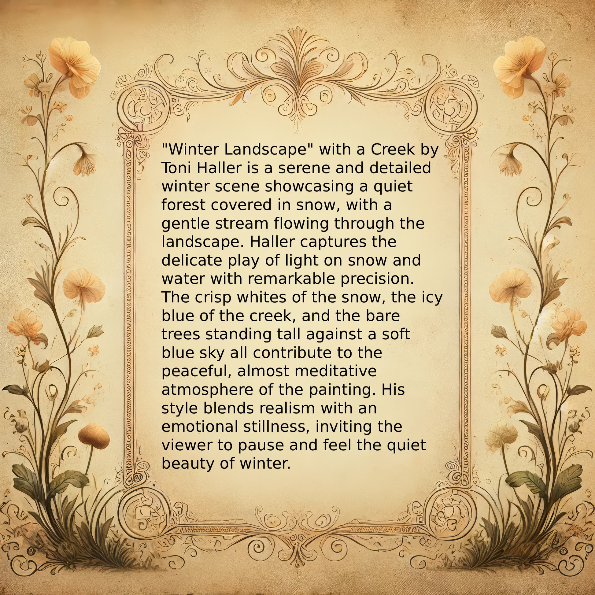 "Winter Landscape" with a Creek by Toni Haller is a serene and detailed winter scene showcasing a quiet forest covered in snow, with a gentle stream flowing through the landscape. Haller captures the delicate play of light on snow and water with remarkable precision. The crisp whites of the snow, the icy blue of the creek, and the bare trees standing tall against a soft blue sky all contribute to the peaceful, almost meditative atmosphere of the painting. His style blends realism with an emotional stillness, inviting the viewer to pause and feel the quiet beauty of winter.