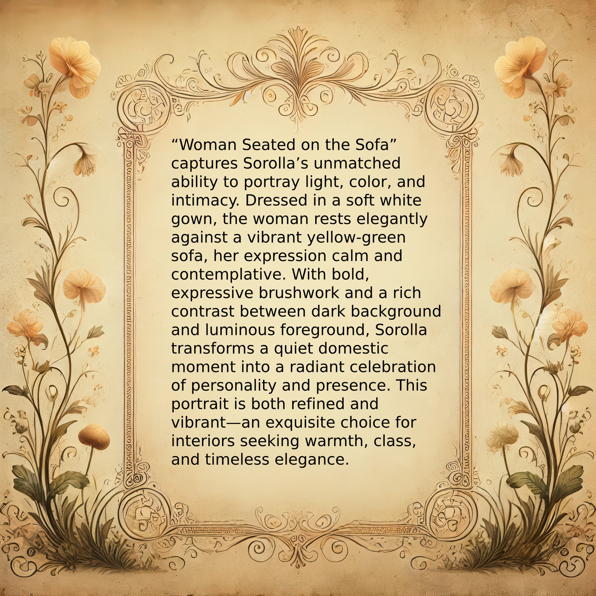 “Woman Seated on the Sofa” captures Sorolla’s unmatched ability to portray light, color, and intimacy. Dressed in a soft white gown, the woman rests elegantly against a vibrant yellow-green sofa, her expression calm and contemplative. With bold, expressive brushwork and a rich contrast between dark background and luminous foreground, Sorolla transforms a quiet domestic moment into a radiant celebration of personality and presence. This portrait is both refined and vibrant—an exquisite choice for interiors seeking warmth, class, and timeless elegance.